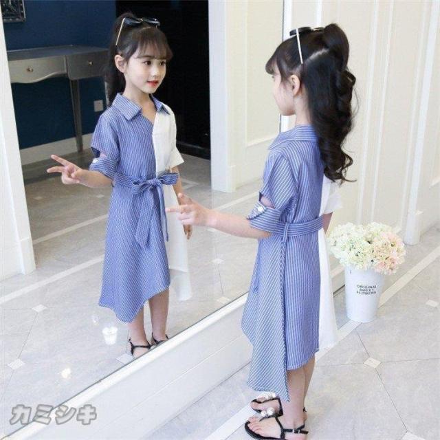 子供服 ワンピース 春夏 女の子 キッズワンピース 半袖 シャツワンピース ストライプ チュニック 子供ドレス ジュニア おしゃれ カジュアル 可愛い 新品 150cm