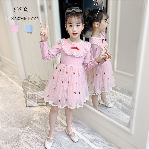 スウィート 結婚式 ワンピース パーティー チュールスカート いちご柄 女の子 発表会 入学式 卒業式 七五三 裏地付き 春秋 お祝い ピンク ブルー 110-160