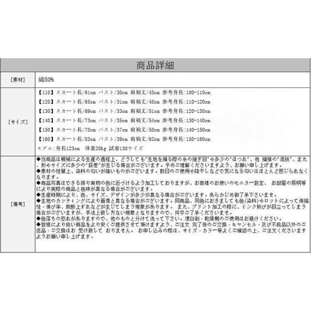 | サイズについての説明 | 【サイズ】【110】スカート長/61cm バスト/30cm 肩袖丈/45cm 参考身長:100-110cm【120】スカート長/65cm バスト/31cm 肩袖丈/48cm 参考身長:110-120cm【130】スカート長/69cm バスト/33cm 肩袖丈/51cm 参考身長:120-130cm【140】スカート長/73cm バスト/35cm 肩袖丈/54cm 参考身長:130-140cm【150】スカート長/78cm バスト/37cm 肩袖丈/58cm 参考身長:140-150cm【160】スカート長/83cm バスト/39cm 肩袖丈/62cm 参考身長:150-160cm |