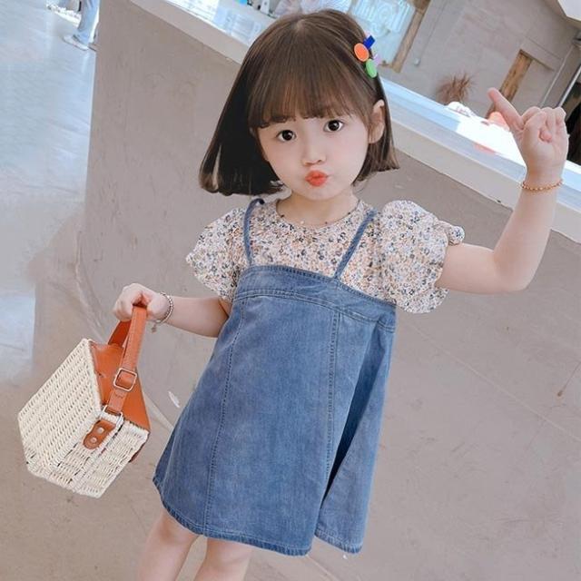 デニムワンピース 子供 ワンピース 半袖 夏 偽二枚 花柄ワンピース 女児 半袖ワンピース ジュニア サマーワンピース デニム キッズワンピース