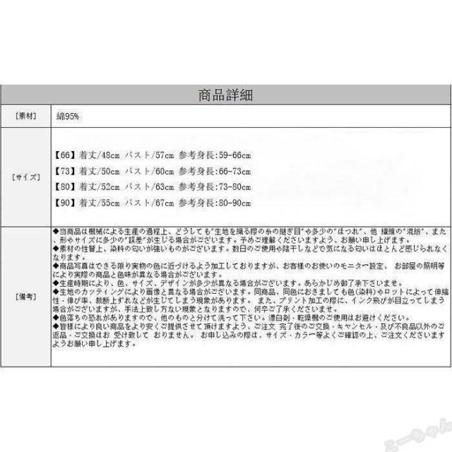 | サイズについての説明 | サイズ: 【66】着丈/48cm バスト/57cm 参考身長:59-66cm 【73】着丈/50cm バスト/60cm 参考身長:66-73cm 【80】着丈/52cm バスト/63cm 参考身長:73-80cm 【90】着丈/55cm バスト/67cm 参考身長:80-90cm |