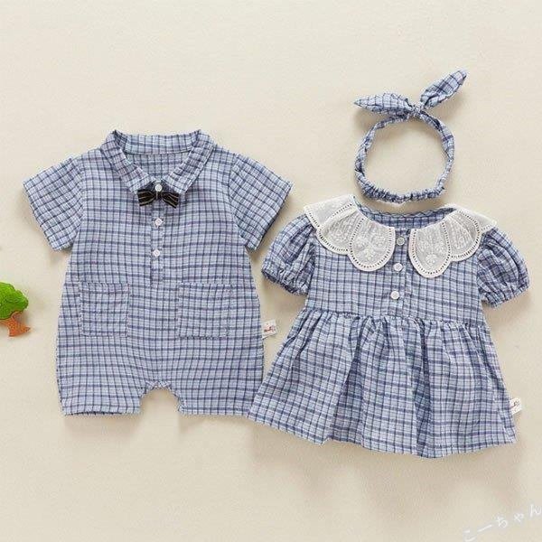 ベビー服 ボディスーツ ロンパース 男の子 女の子 夏服 半袖 チェック柄 可愛い ワンピース 新生児 赤ちゃん 双子 出産祝い ツイン ベビー服 コットン 66-90