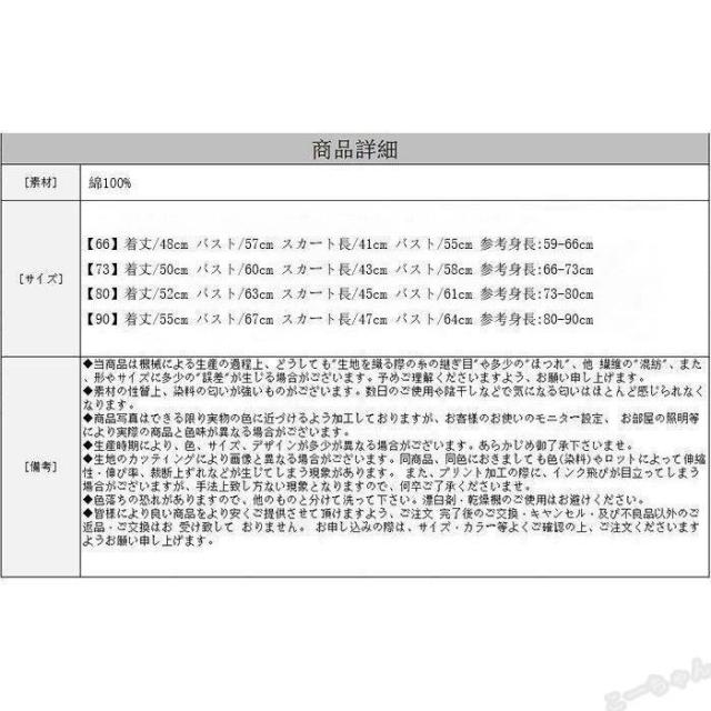 | サイズについての説明 | サイズ: 【66】着丈/48cm バスト/57cm スカート長/41cm バスト/55cm 参考身長:59-66cm 【73】着丈/50cm バスト/60cm スカート長/43cm バスト/58cm 参考身長:66-73cm 【80】着丈/52cm バスト/63cm スカート長/45cm バスト/61cm 参考身長:73-80cm 【90】着丈/55cm バスト/67cm スカート長/47cm バスト/64cm 参考身長:80-90cm |