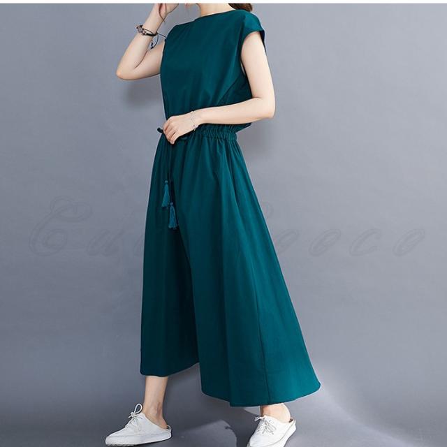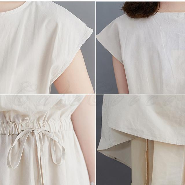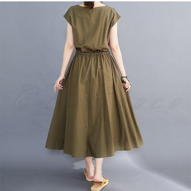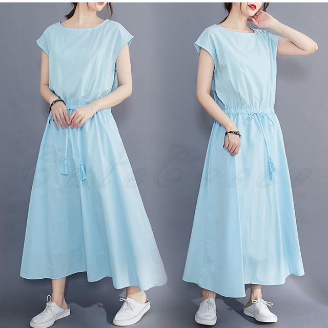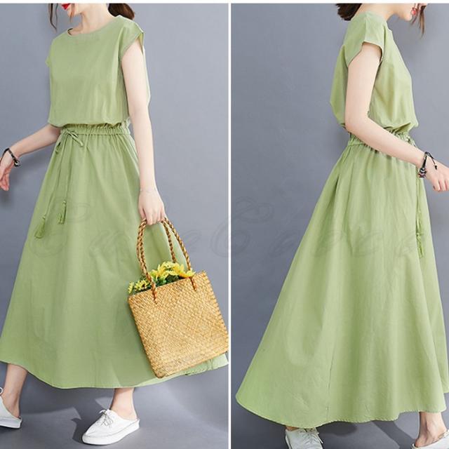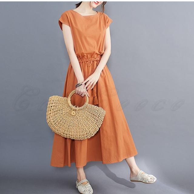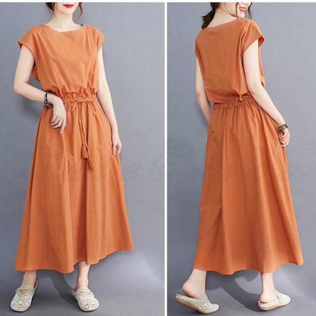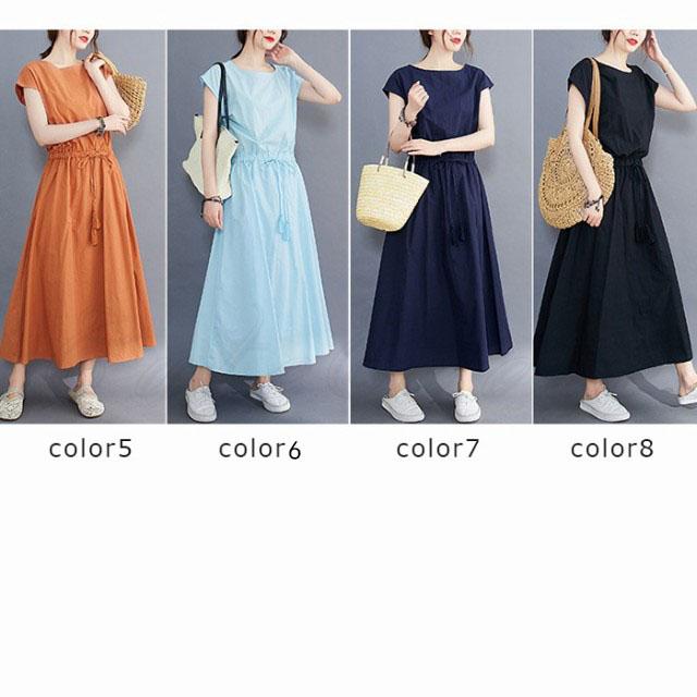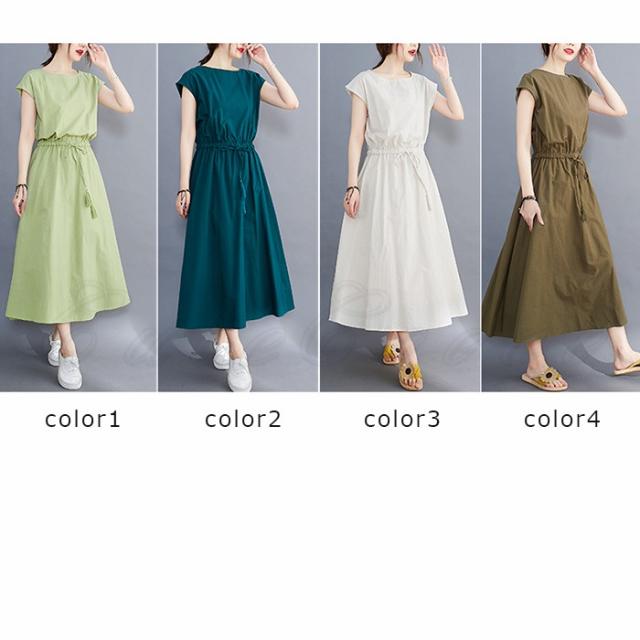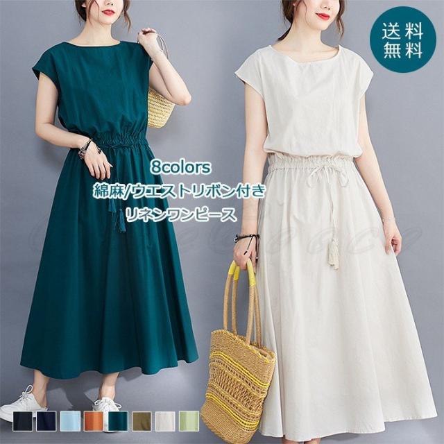 リネンワンピース レディース 無地 綿麻 ウエストリボン付き ロング丈 トップス カジュアル 着痩せ 可愛い キレイめ オシャレ