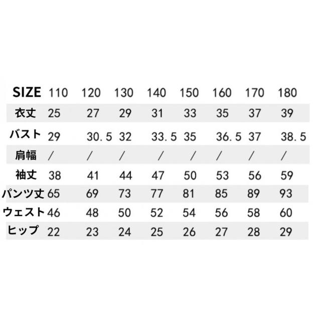 | サイズについての説明 | セット内容:トップスORパンツ カラー:写真通り 素 材:綿.その他 参考サイズ(単位:cm) 110/120/130/140/150/160/170 (サイズ) (110)参考身長100-110cm (120)参考身長110-120cm (130)参考身長120-130cm (140)参考身長130-140cm (150)参考身長140-150cm (160)参考身長150-160cm (170)参考身長160-170cm (180)参考身長170-180cm ★返品、交換は原則としてお受けしておりません。 初期不良の場合、未使用の商品のみ到着日から5日以内にご連絡頂ければご返金、交換対応させて頂きます。 ★PC環境 光の具合により色 質感のイメージが画像と若干異なる場合がございますので予めご了承くださいませ。 |