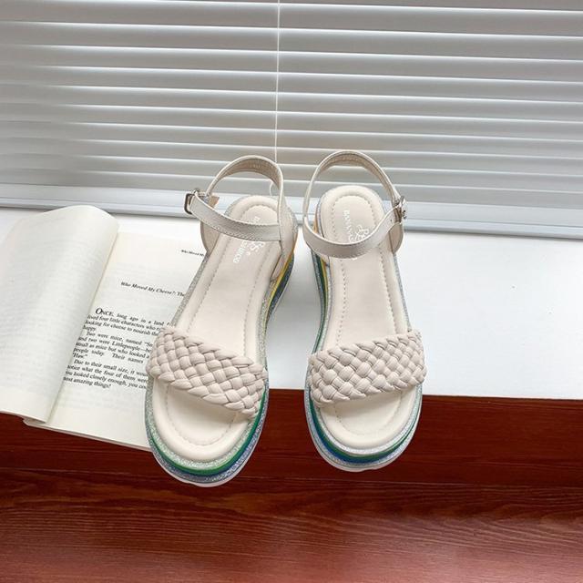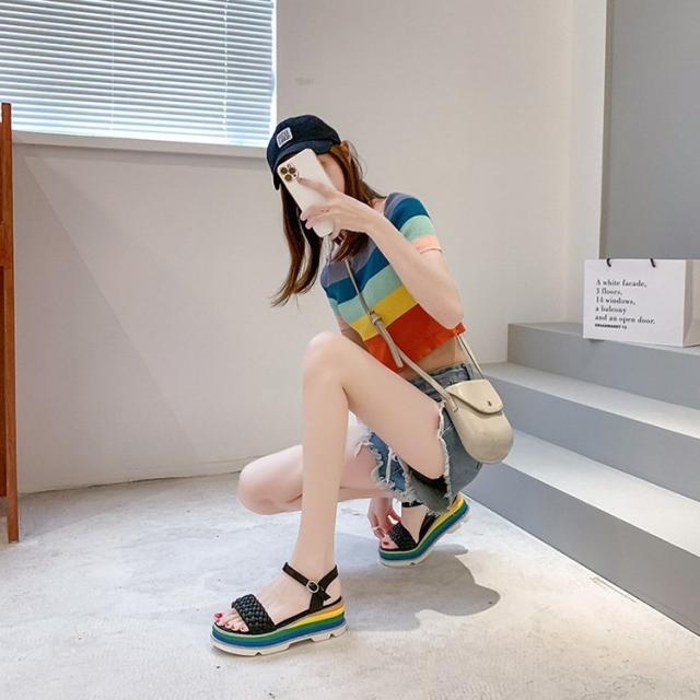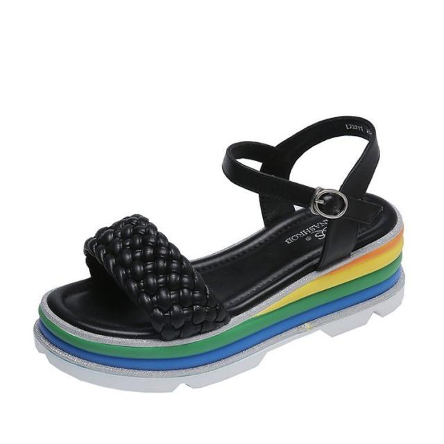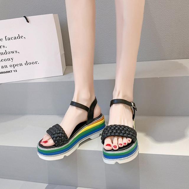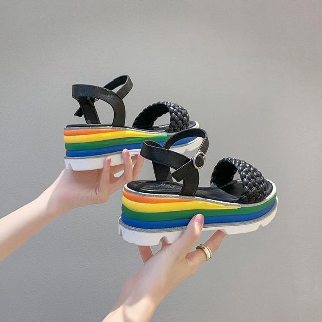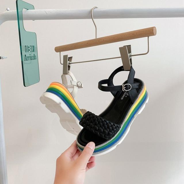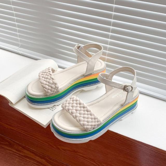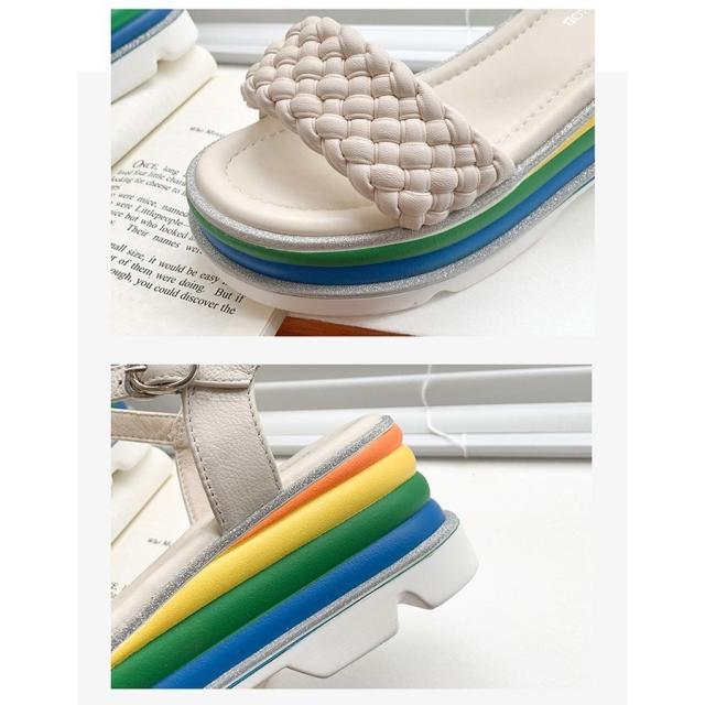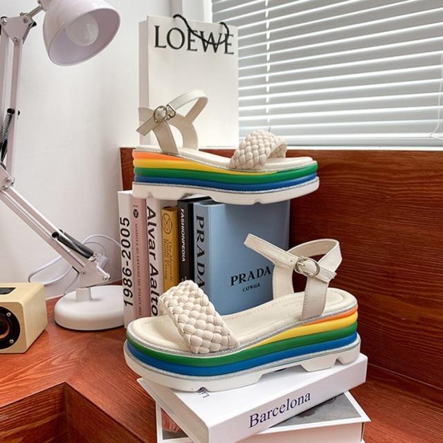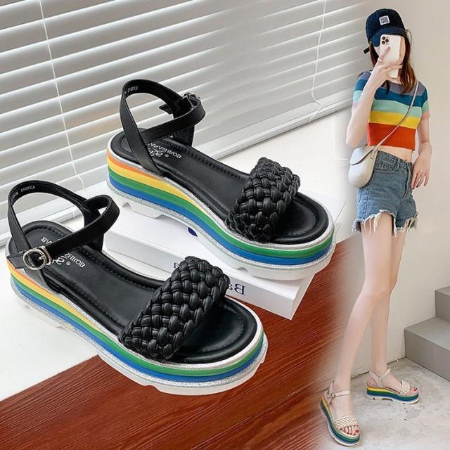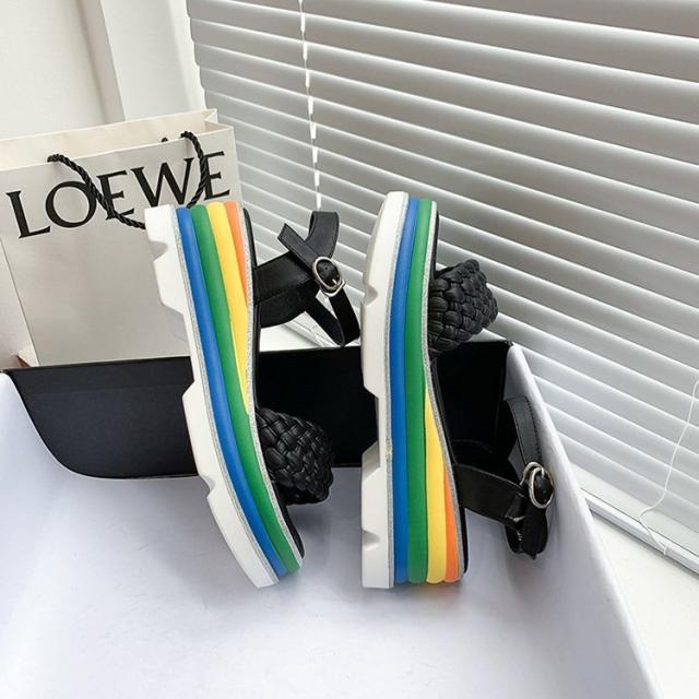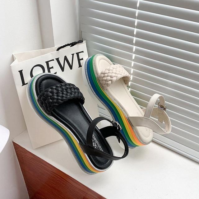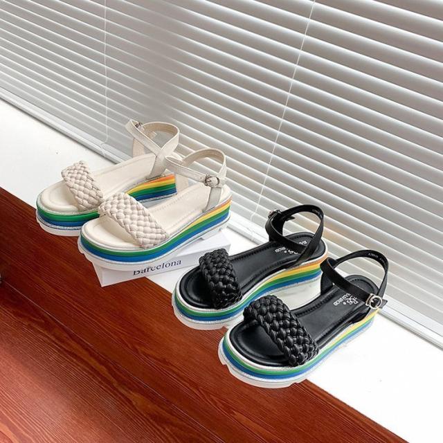サンダル レディース 履きやすい 夏 サンダル ストラップサンダル 厚底靴 ウェッジソール ローマブール レインボー色 ぺたんこ 歩きやすい 美脚 大人 新作 2色