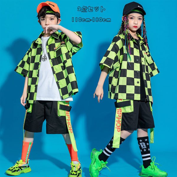 ダンス 衣 ヒップホップ グリーン ユニセックス HIPHOP 上下セット 2点セット ゆったり 半袖シャツ 半ズボン チェック柄 女の子 男の子 ジャズダンス 110-180