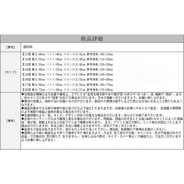 | サイズについての説明 | サイズ: 【110】着丈/49cm バスト/46cm ズボンの丈/41cm 参考身長:100-110cm 【120】着丈/52cm バスト/48cm ズボンの丈/43cm 参考身長:110-120cm 【130】着丈/55cm バスト/50cm ズボンの丈/45cm 参考身長:120-130cm 【140】着丈/59cm バスト/52cm ズボンの丈/48cm 参考身長:130-140cm 【150】着丈/62cm バスト/54cm ズボンの丈/50cm 参考身長:140-150cm 【160】着丈/65cm バスト/56cm ズボンの丈/52cm 参考身長:150-160cm 【170】着丈/68cm バスト/58cm ズボンの丈/54cm 参考身長:160-170cm 【180】着丈/72cm バスト/60cm ズボンの丈/57cm 参考身長:170-180cm モデル:身長132cm 体重32kg 試着140サイズ |