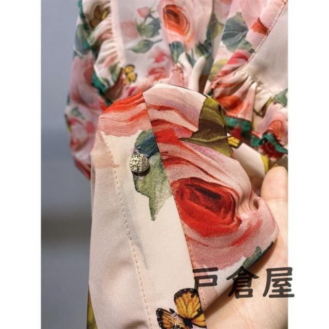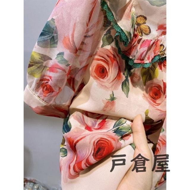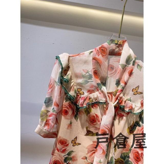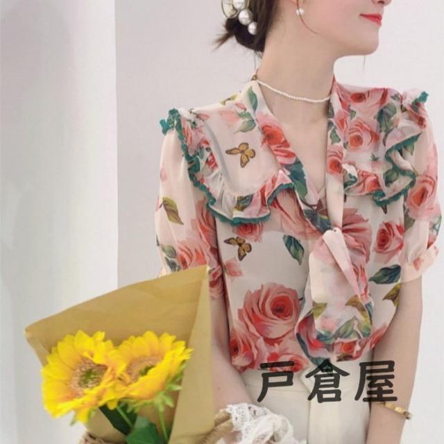 ブラウス レディース 40代 2021 オシャレブラウス 花柄 シフォンブラウスリボンネック Vネック 上品 半袖トップス 韓国風 通勤 ゆったりシャツ 30代 50代
