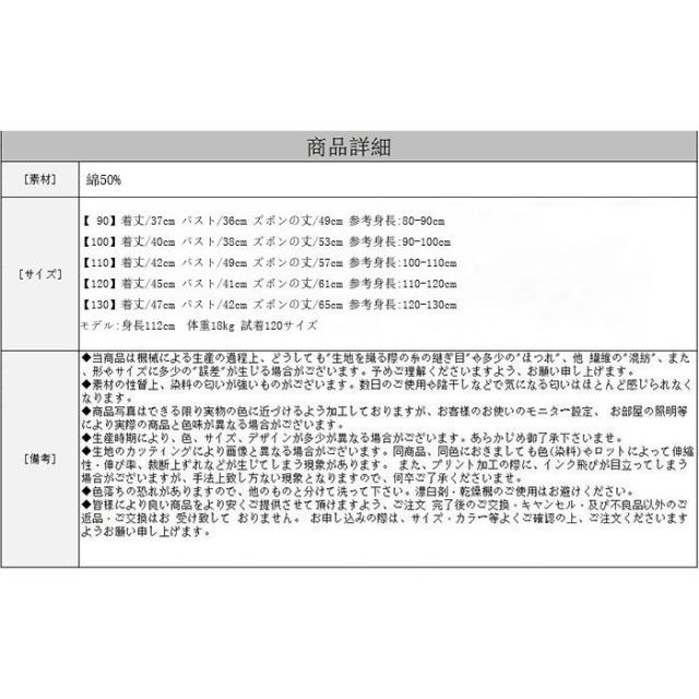 | サイズについての説明 | サイズ: ( 90)着丈/37cm バスト/36cm ズボンの丈/49cm 参考身長:80-90cm (100)着丈/40cm バスト/38cm ズボンの丈/53cm 参考身長:90-100cm (110)着丈/42cm バスト/49cm ズボンの丈/57cm 参考身長:100-110cm (120)着丈/45cm バスト/41cm ズボンの丈/61cm 参考身長:110-120cm (130)着丈/47cm バスト/42cm ズボンの丈/65cm 参考身長:120-130cm モデル:身長112cm 体重18kg 試着120サイズ |