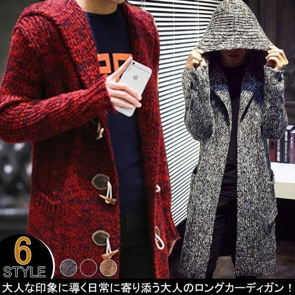 ニットカーディガン ロング メンズ フード付き ミックスカーディガン カーデ ボタンなし¥/トグルボタンカーディガン サイドポケット カジュアル