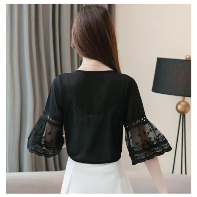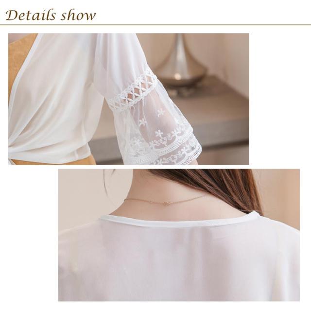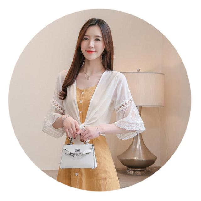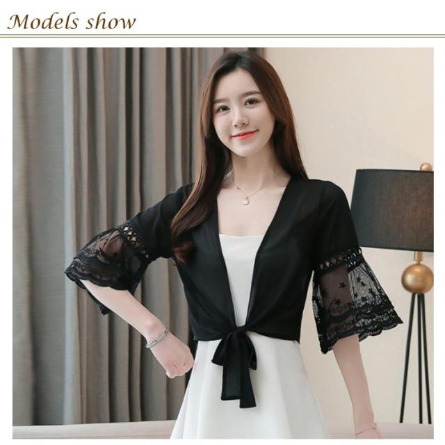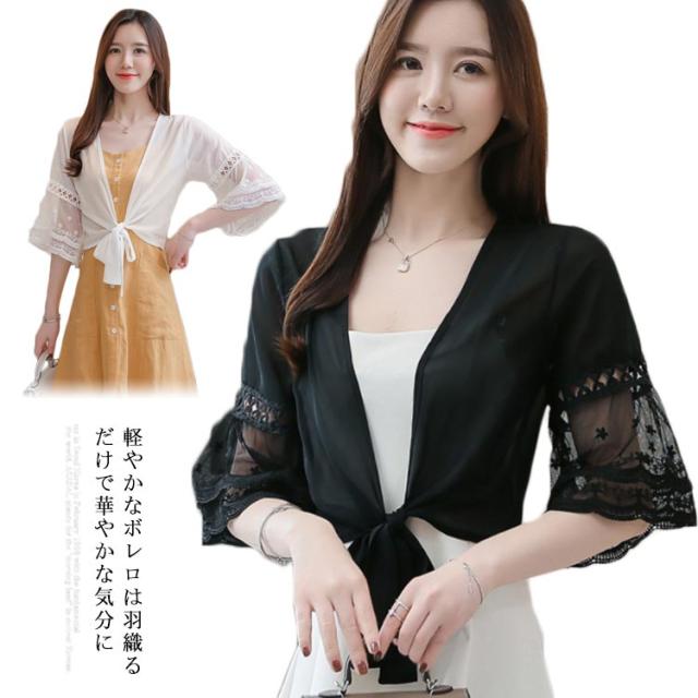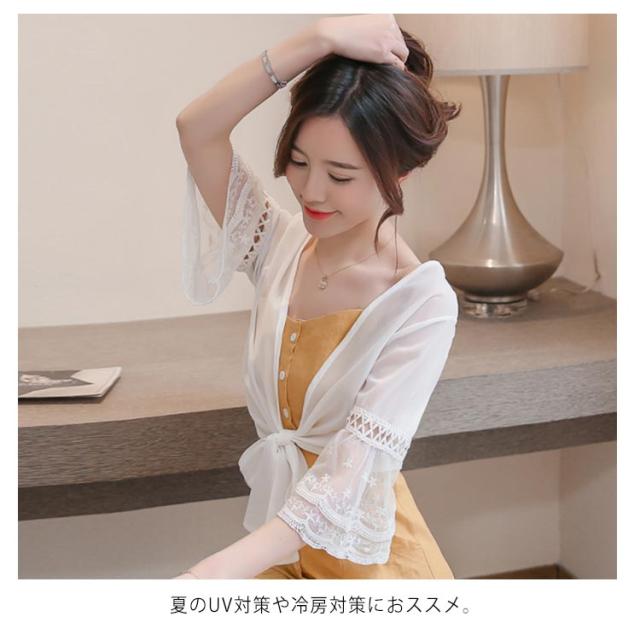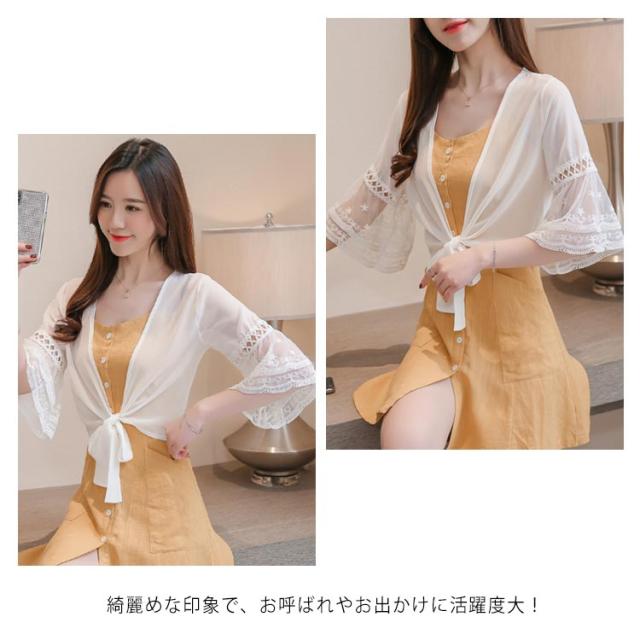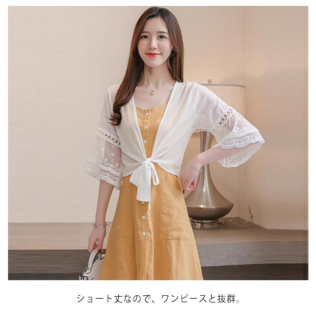 シフォンの透け感が涼しげ。裾結び ボレロカーディガン 袖レース 不エアスリーブ サマーカーディガン ボレロ カーディガン 夏用 シースルーカーディガン ショートカーディガン きれいめ 五分袖 5分袖 透け感 UVカット 冷房対策 UV対策 送料無料