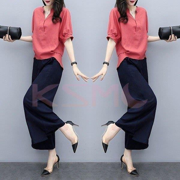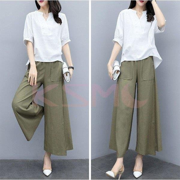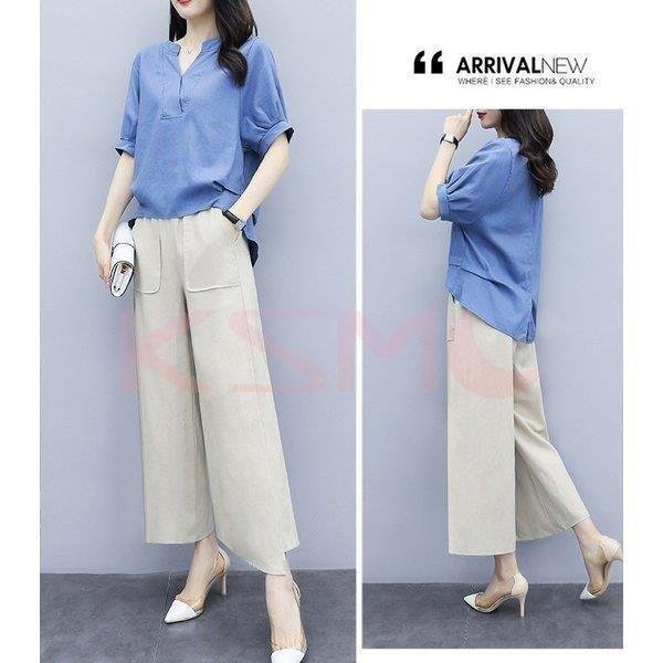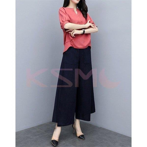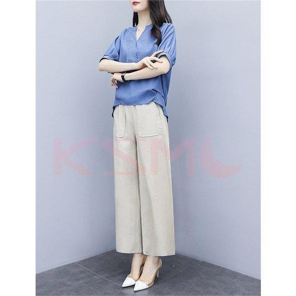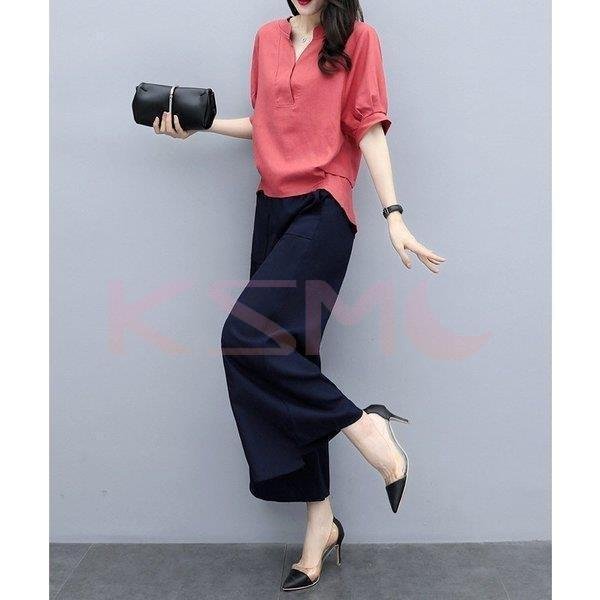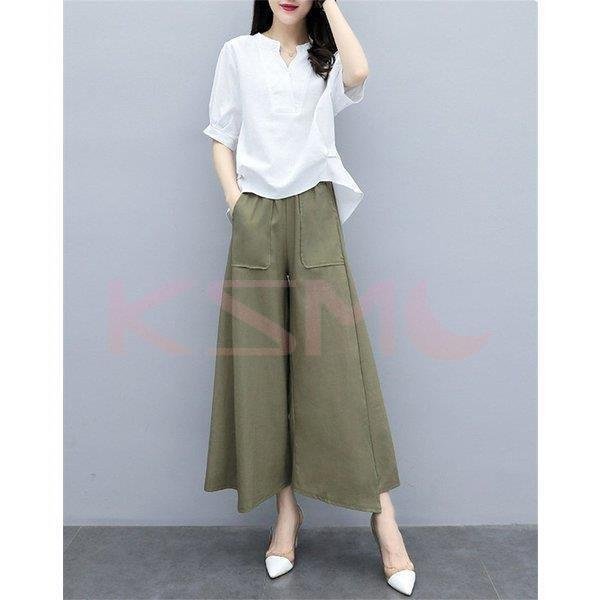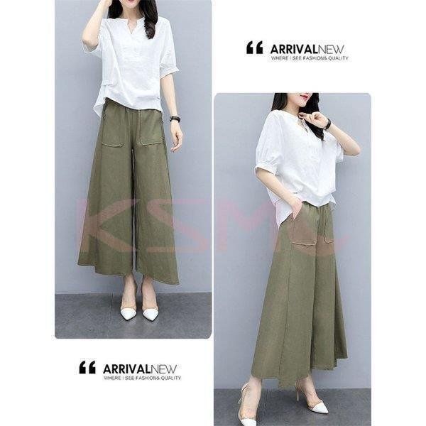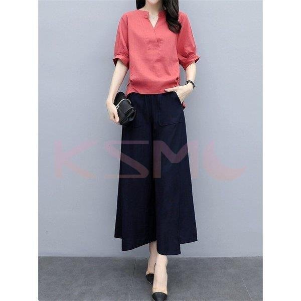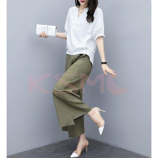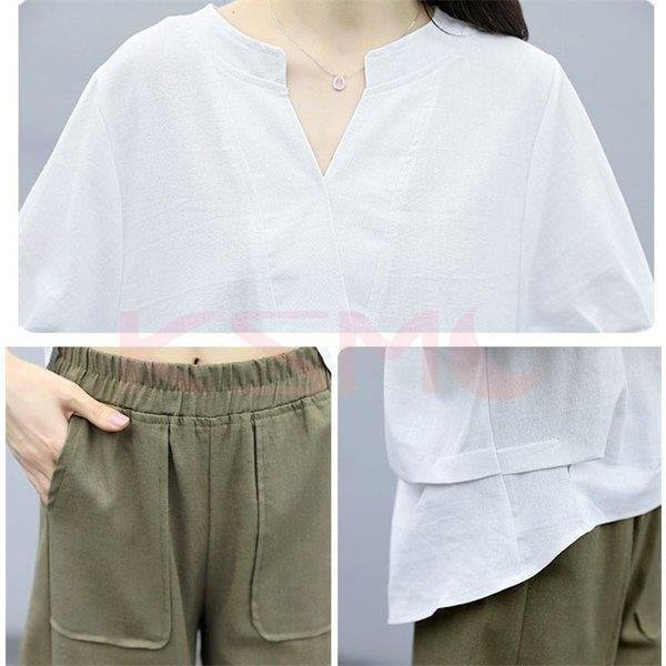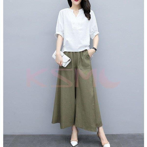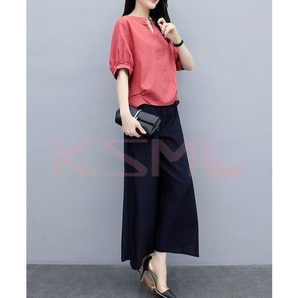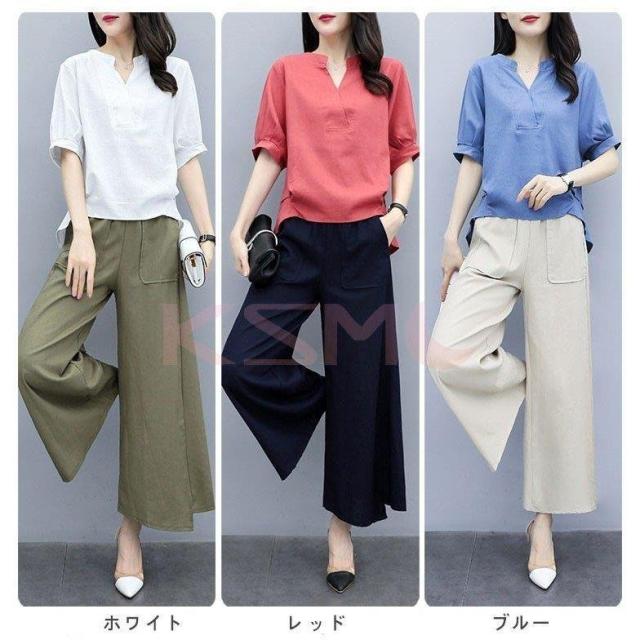 セットアップ レディース カジュアル 夏 40代 きれいめ 大きいサイズ ブラウス 半袖 綿麻 ガウチョパンツ フォーマル 通勤 OL オシャレ 大人 上品 着痩せ 新品
