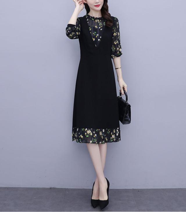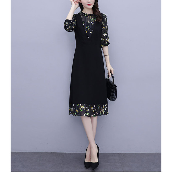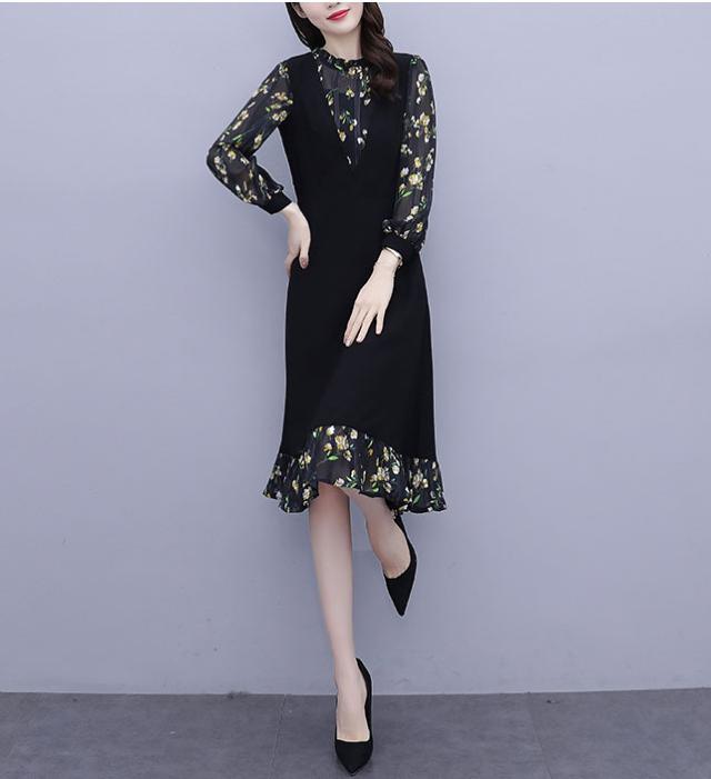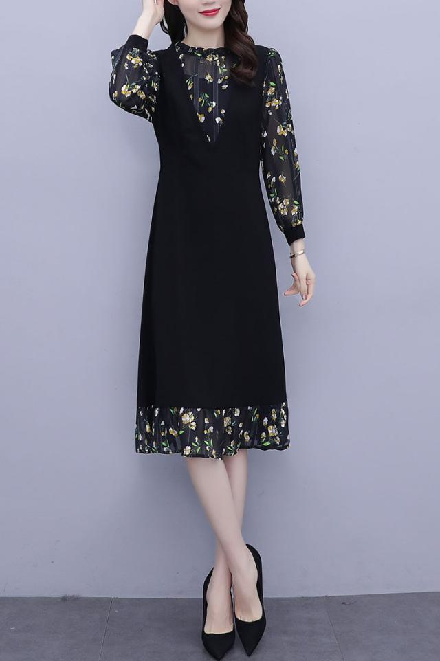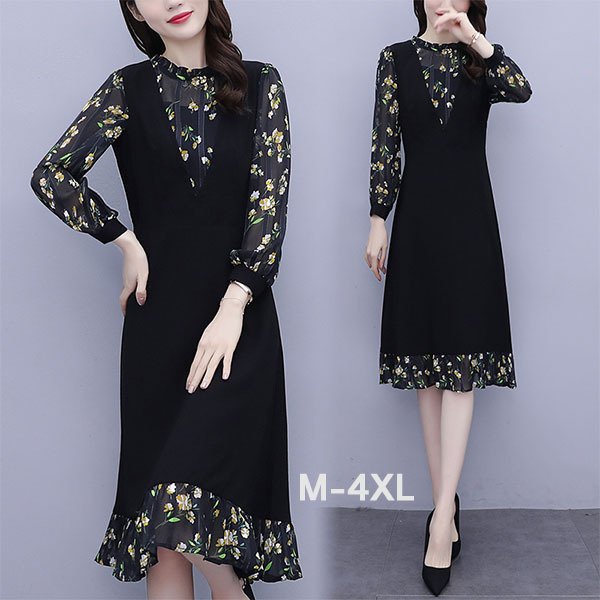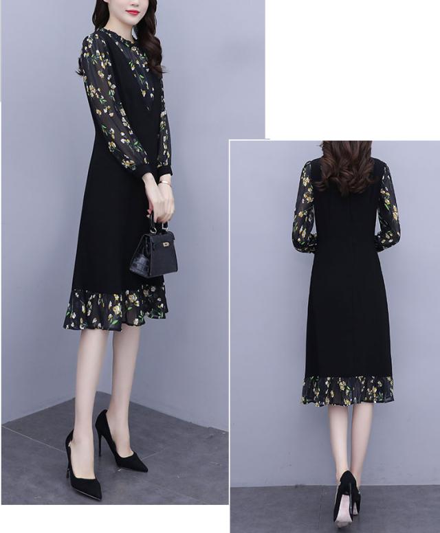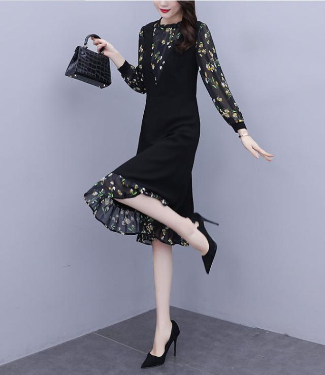 ワンピース 秋物 レディース 秋 春 膝丈 シフォン 花柄 長袖 Aライン 丸首 異素材 キレイめ ミディ丈 おしゃれ 着痩せ 通勤 OL お洒落 体型カバー 40代