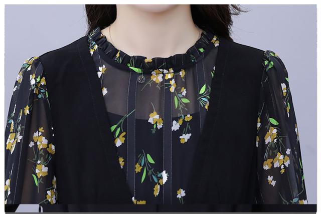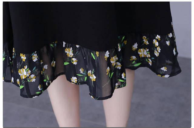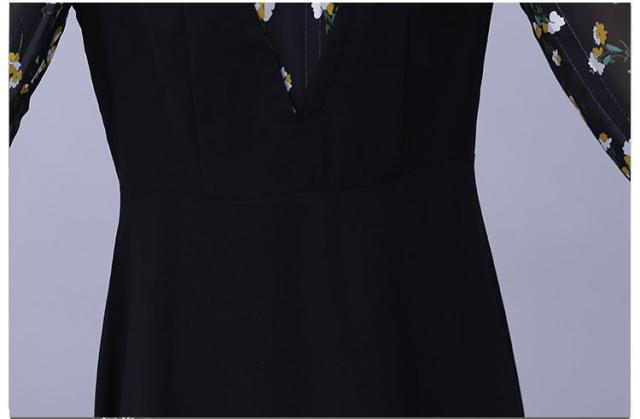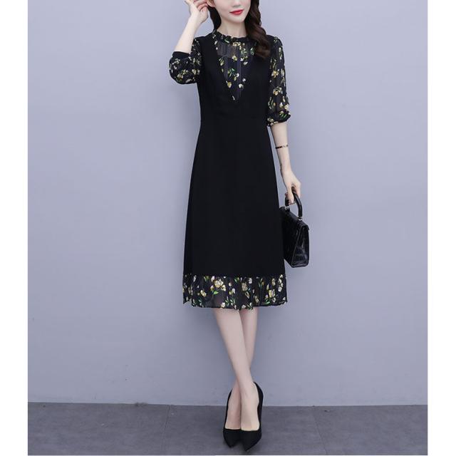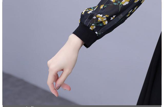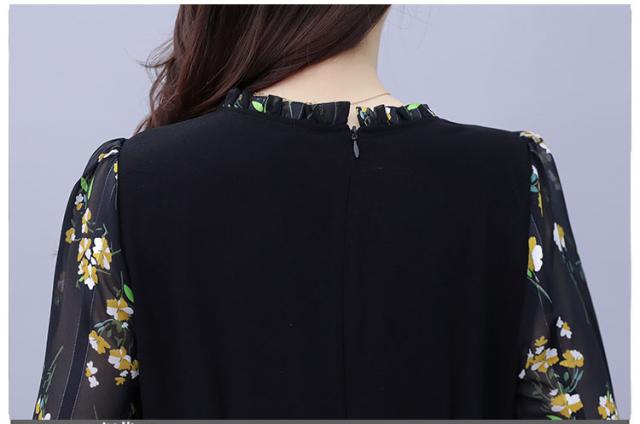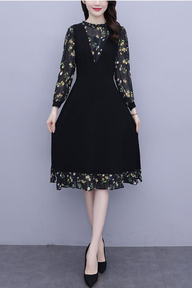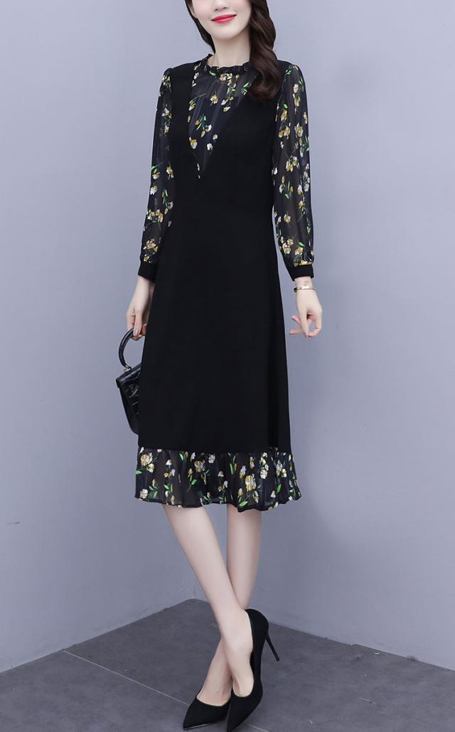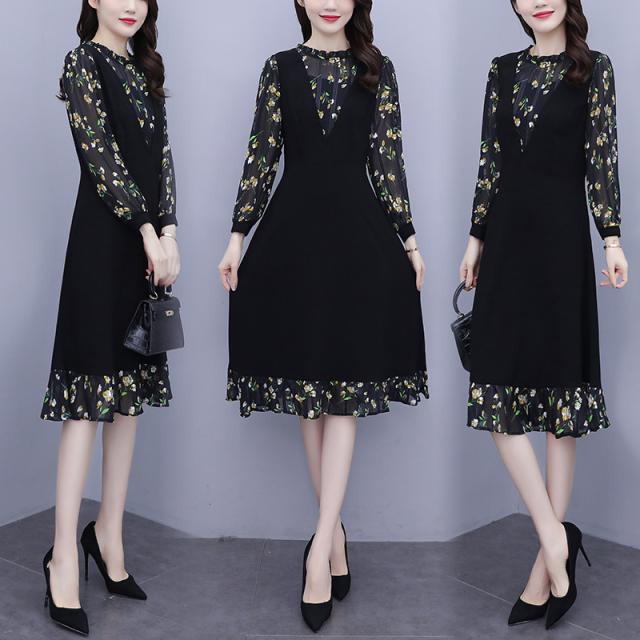 ワンピース 秋物 レディース 秋 春 膝丈 シフォン 花柄 長袖 Aライン 丸首 異素材 キレイめ ミディ丈 おしゃれ 着痩せ 通勤 OL お洒落 体型カバー 40代