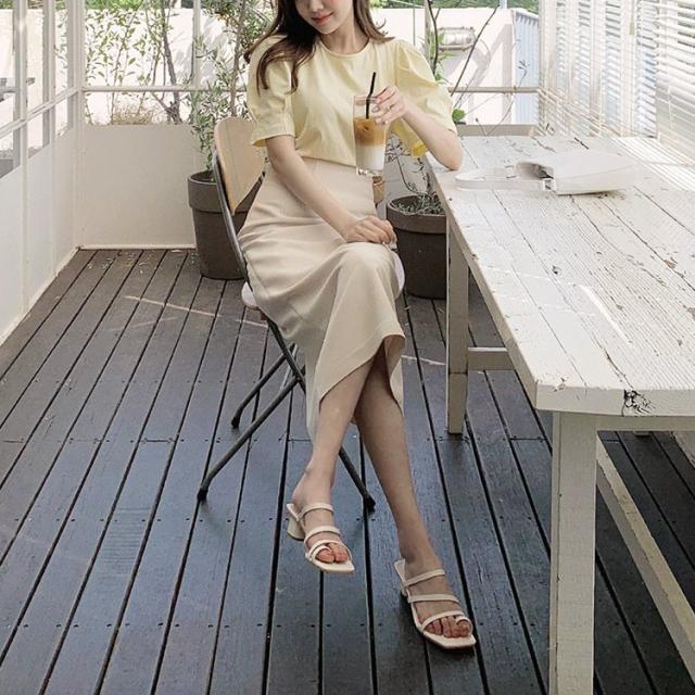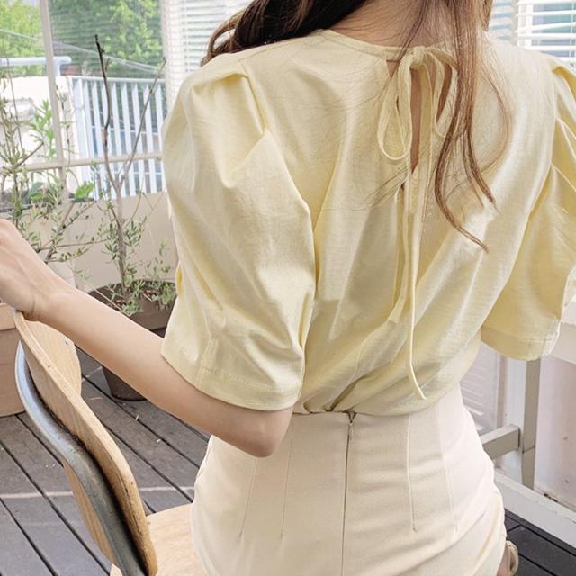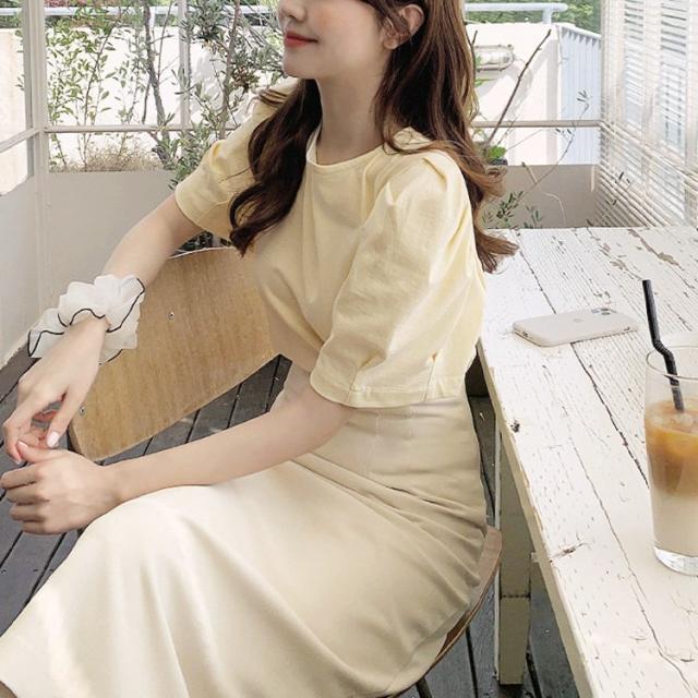 ブラウス 半袖 スカート タイト レディース ミモレ丈 フェミニン リボン タイトスカート 半袖ブラウス イエロー ベージュ 韓国 メール便送料無料