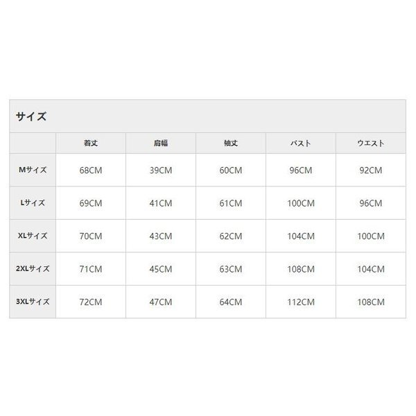 | サイズについての説明 | 【サイズ】 Mサイズ 着丈68CM 肩幅39CM 袖丈60CM バスト96CM ウエスト92CM Lサイズ 着丈69CM 肩幅41CM 袖丈61CM バスト100CM ウエスト96CM XLサイズ 着丈70CM 肩幅43CM 袖丈62CM バスト104CM ウエスト100CM 2XLサイズ 着丈71CM 肩幅45CM 袖丈63CM バスト108CM ウエスト104CM 3XLサイズ 着丈72CM 肩幅47CM 袖丈64CM バスト112CM ウエスト108CM |