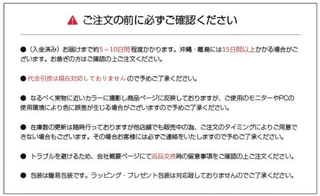 | ●サイズ詳細等の測り方はスタッフ間で統一、徹底はしておりますが、実寸は商品によって若干の誤差(1cm〜3cm )がある場合がございますので、予めご了承ください。 ●製造ロットにより、細部形状の違いや、同色でも色味に多少の誤差が生じます。 ●パッケージは改良のため予告なく仕様を変更する場合があります。 ▼商品の色は、撮影時の光や、お客様のモニターの色具合などにより、実際の商品と異なる場合がございます。あらかじめ、ご了承ください。 ▼生地の特性上、やや匂いが強く感じられるものもございます。数日のご使用や陰干しなどで気になる匂いはほとんど感じられなくなります。 ▼同じ商品でも生産時期により形やサイズ、カラーに多少の誤差が生じる場合もございます。 ▼他店舗でも在庫を共有して販売をしている為、受注後欠品となる場合もございます。予め、ご了承お願い申し上げます。 ▼出荷前に全て検品を行っておりますが、万が一商品に不具合があった場合は、お問い合わせフォームまたはメールよりご連絡頂けます様お願い申し上げます。速やかに対応致しますのでご安心ください。 | |