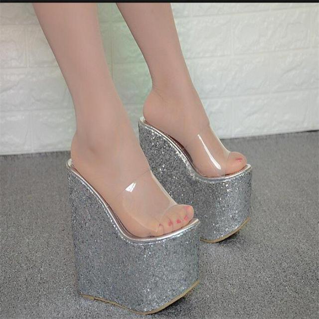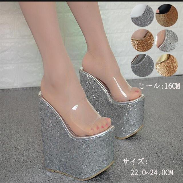 美脚 キャバ サンダル ヒール ウェッジソール 合皮 透明 パーティーサンダル 16cmヒール きらきら 超厚底 ミュール サンダル ハイヒール 厚底ウェッジ