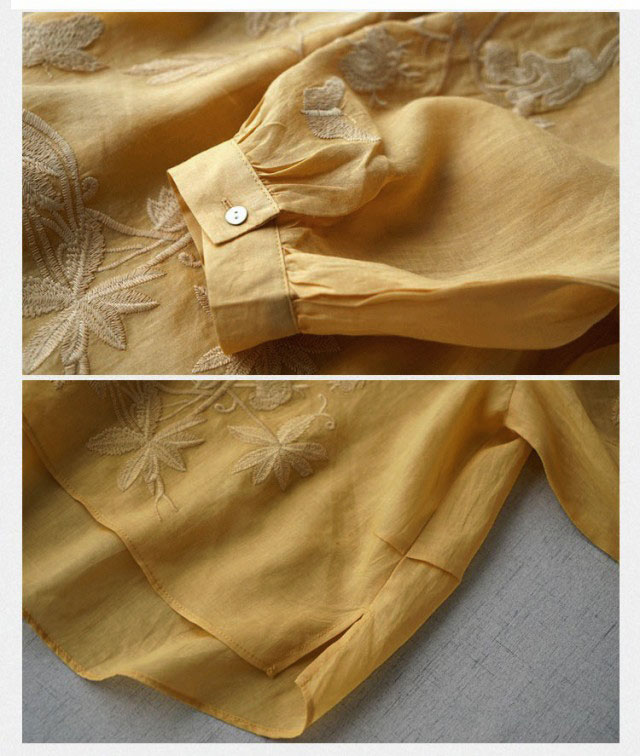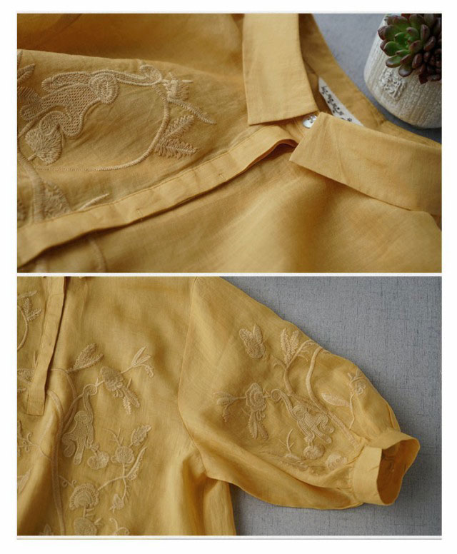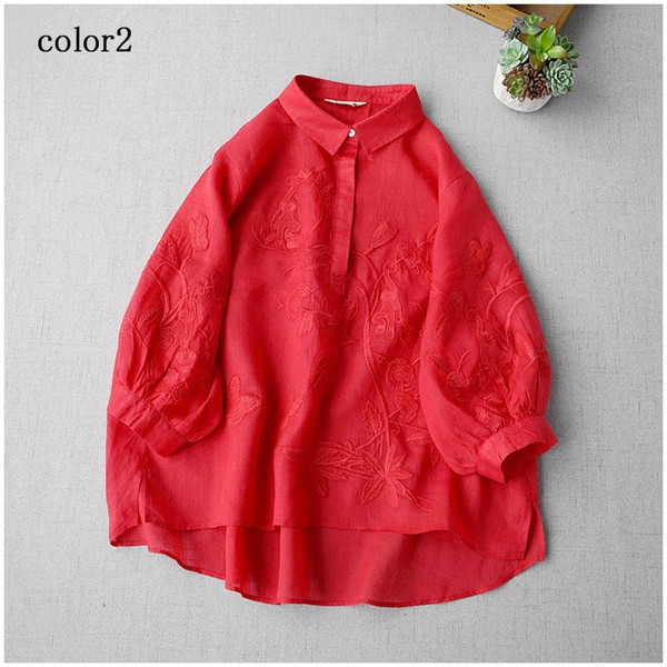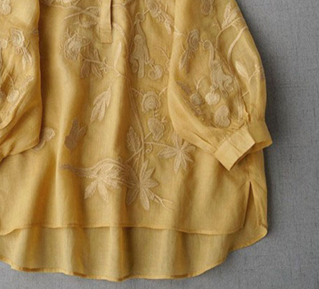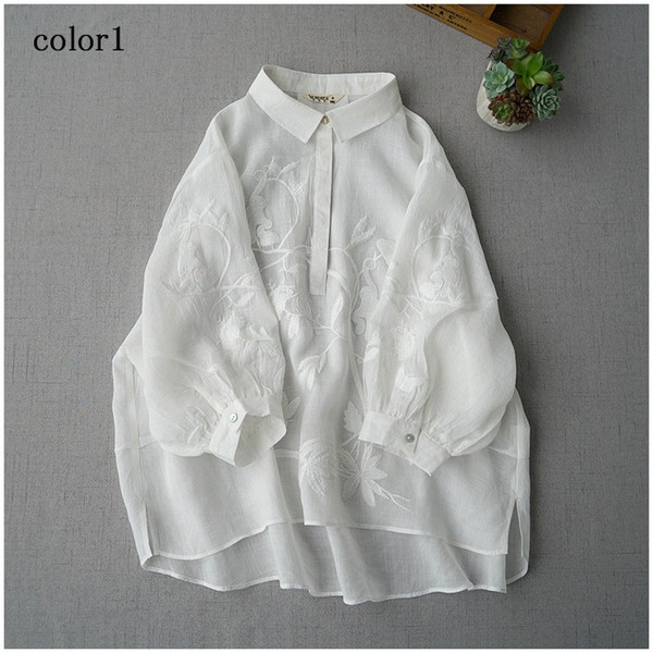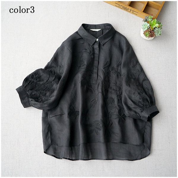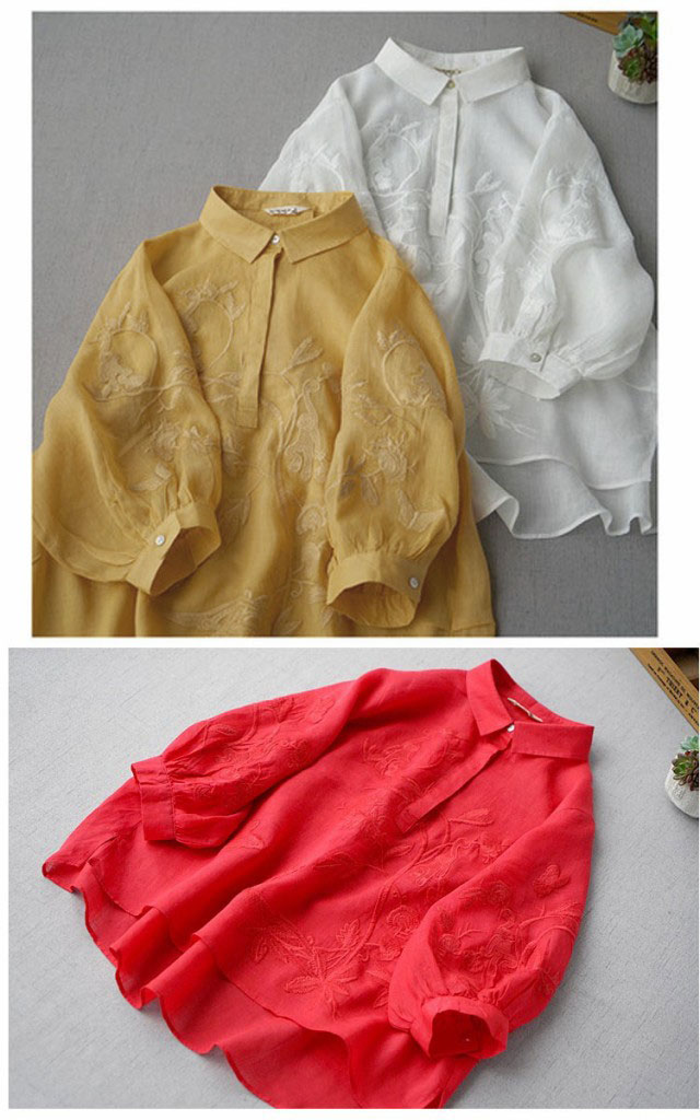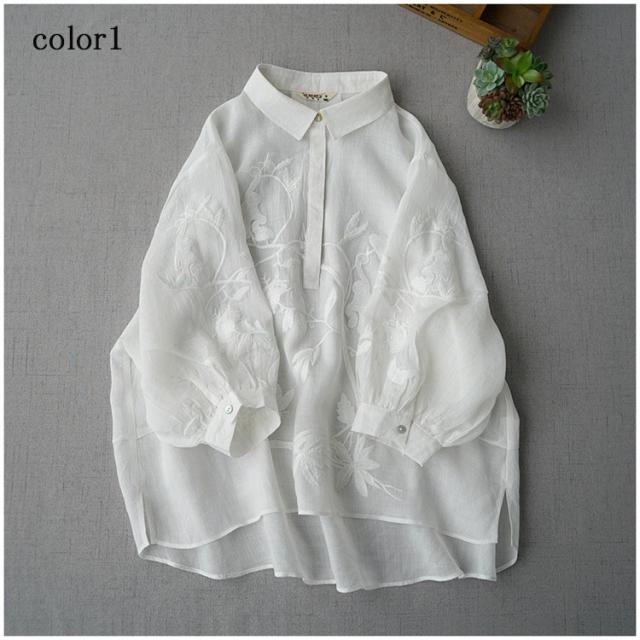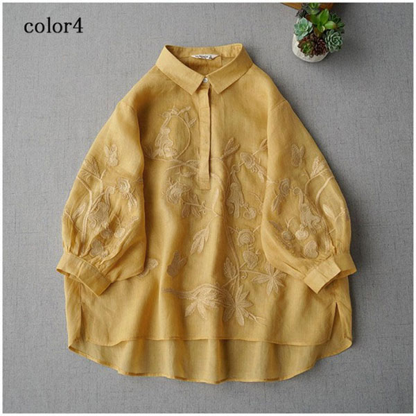 トップス ブラウス シャツ シャツブラウス レディース 7分袖 前後差 パフスリーブ 刺繍 麻 着痩せ ファッション シンプル きれいめ ゆったり 体型カバー 夏