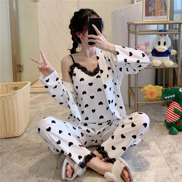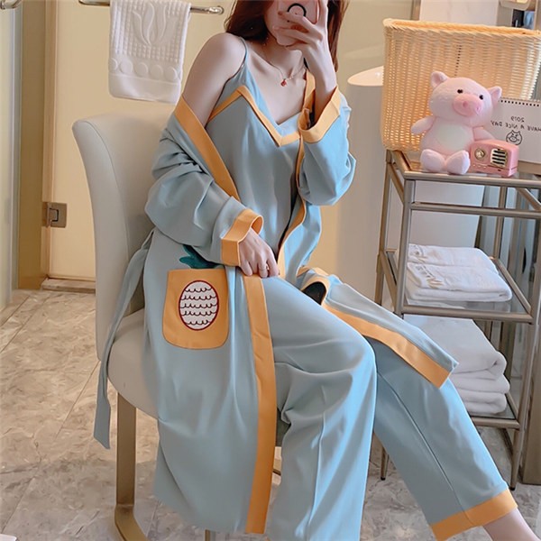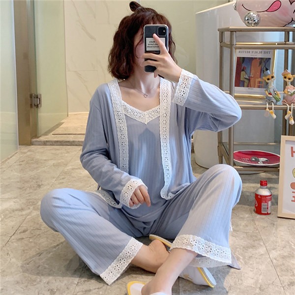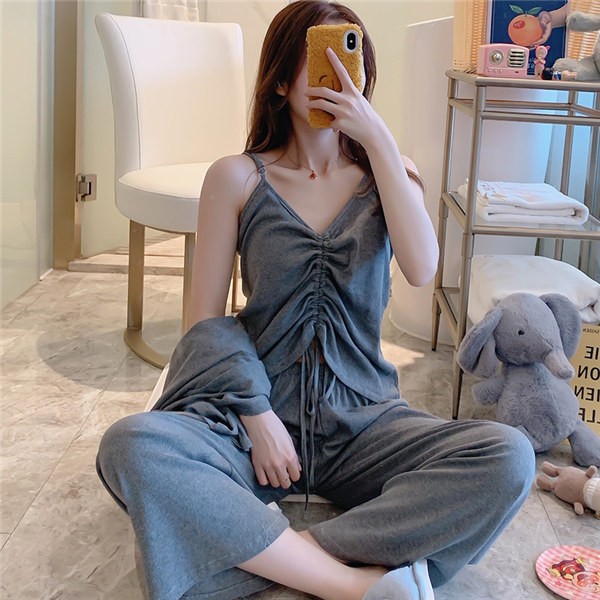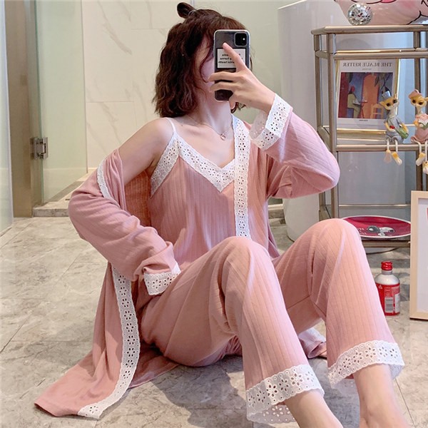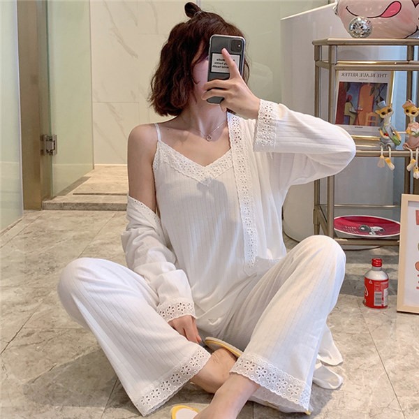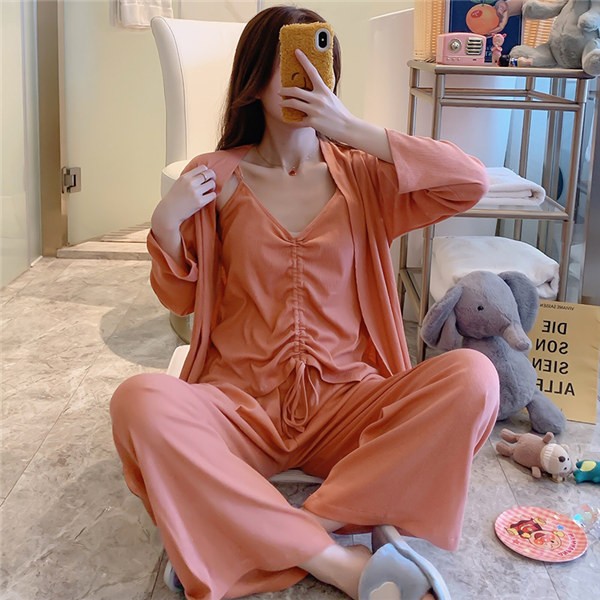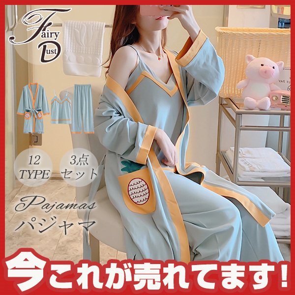 パジャマ ルームウェア レディース 春夏秋 長袖 3点セットアップ ロングパンツ 無地 ゆったり 部屋着 ナイトウェア 寝間着 前開け キャミソール