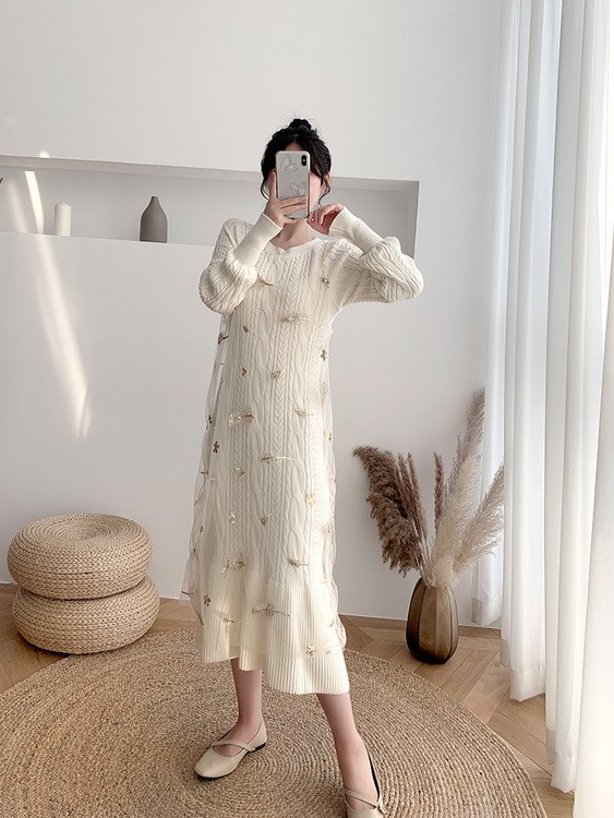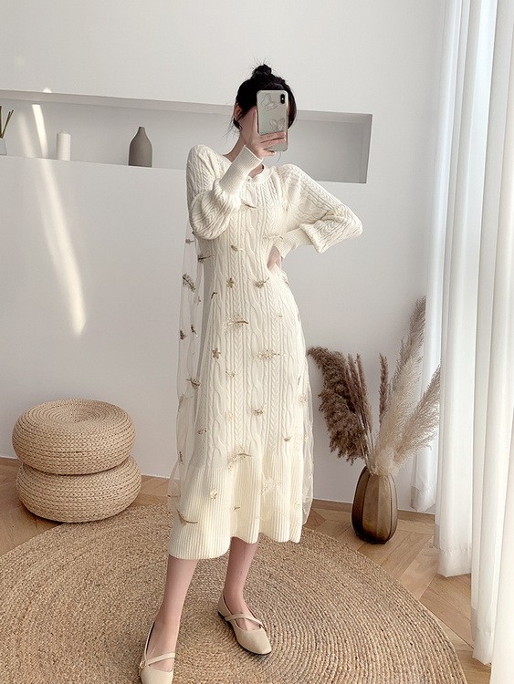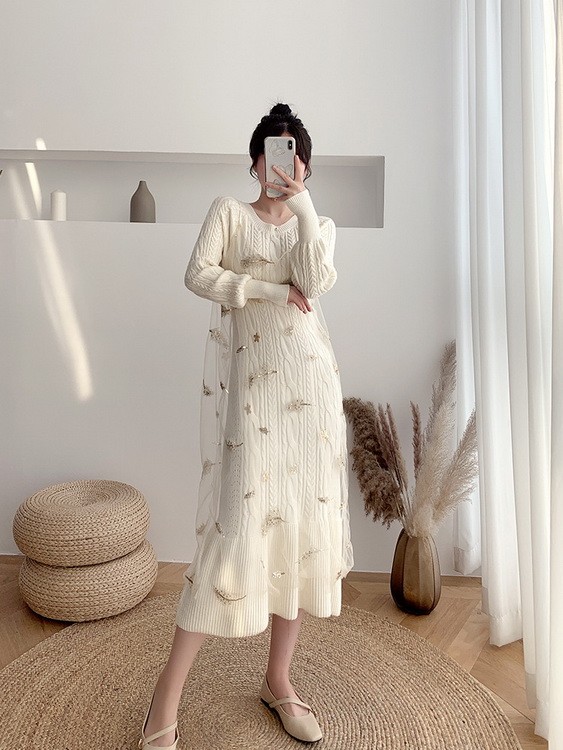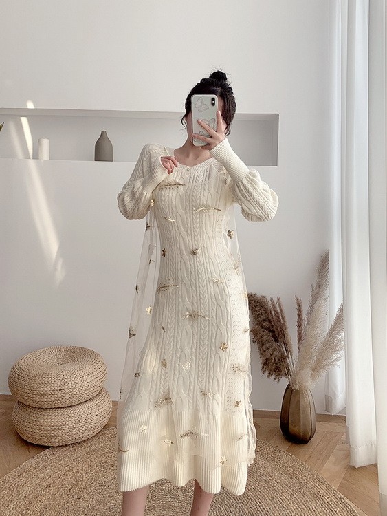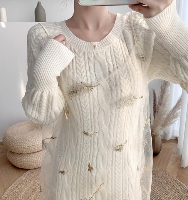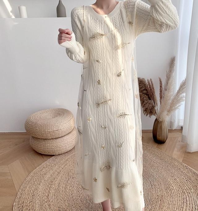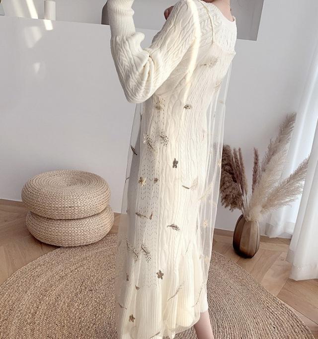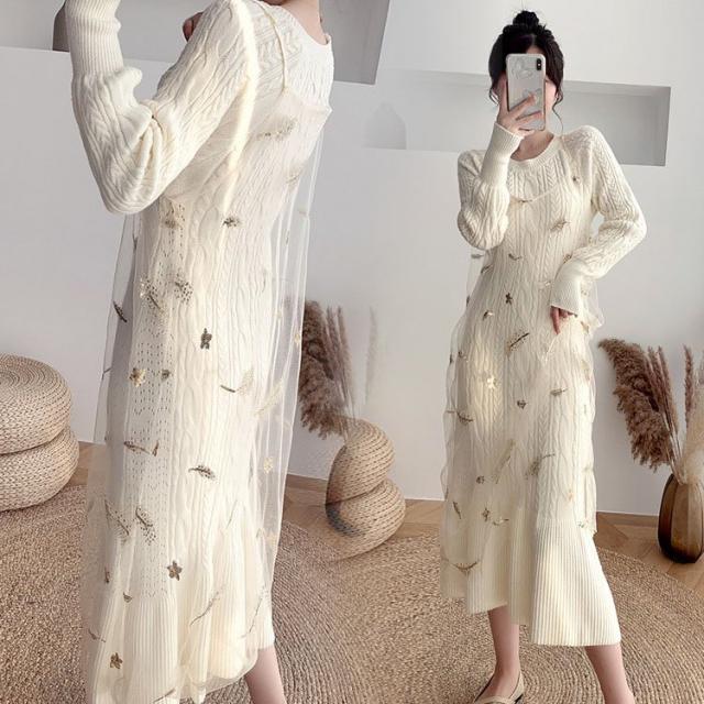 ニットワンピース 2点セット レディース 40代 秋冬 マキシ丈ワンピース チュールキャミ ニットセーター 長袖 ロング丈 オシャレ 通勤 結婚式ドレス 着痩せ