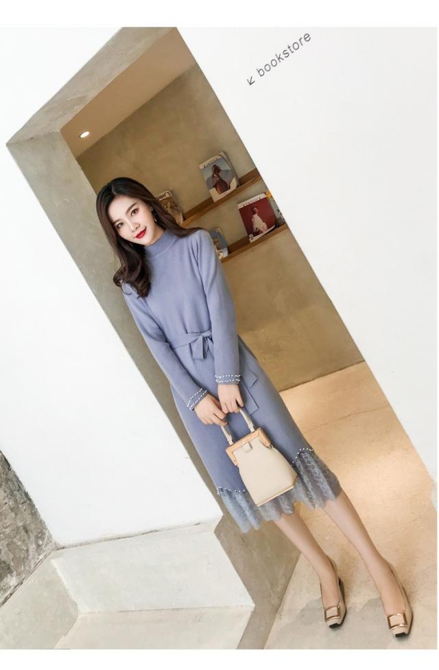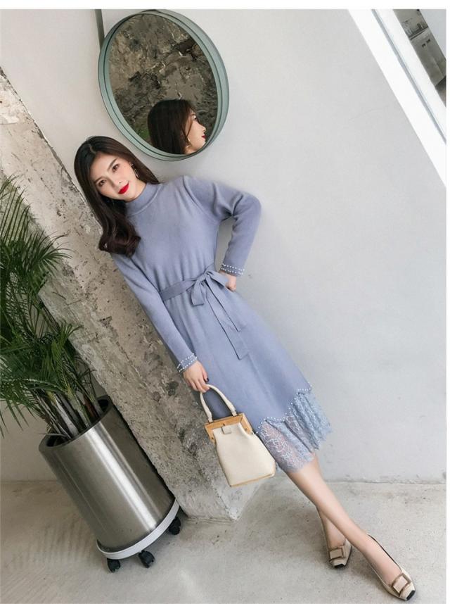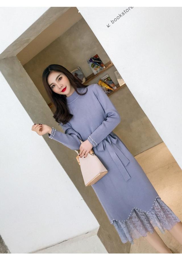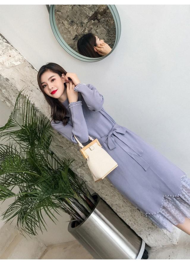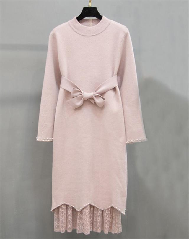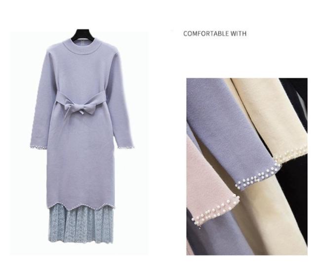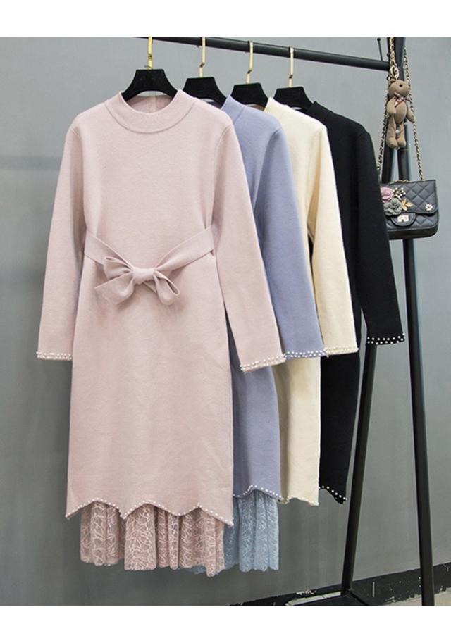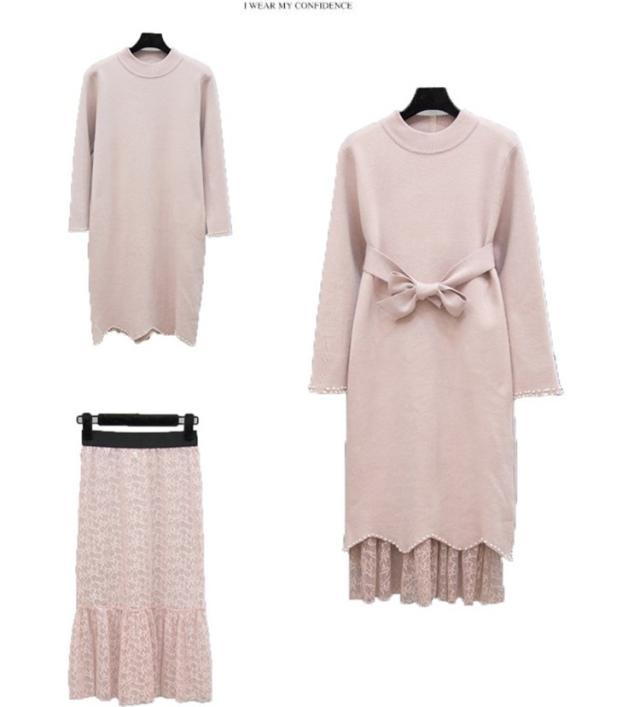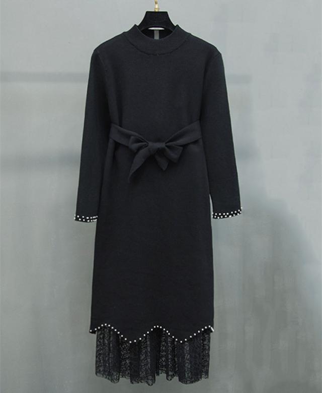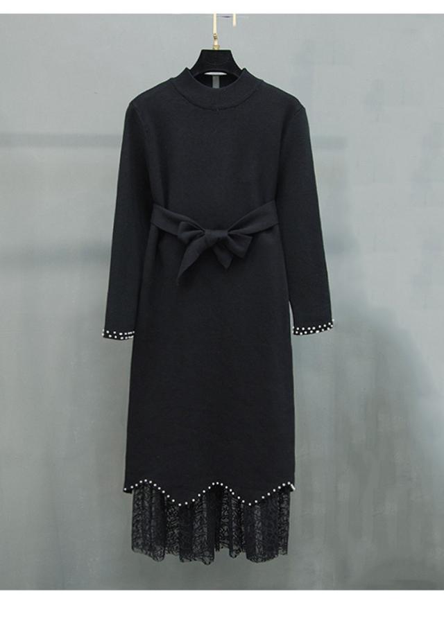 2点セット レディース ニットワンピース メリヤス レース 蝶結び ベルト付き 長袖 ルロング丈 春秋冬 ワンピース 無地 着痩せ 上品 大人 通勤 30代40代50代