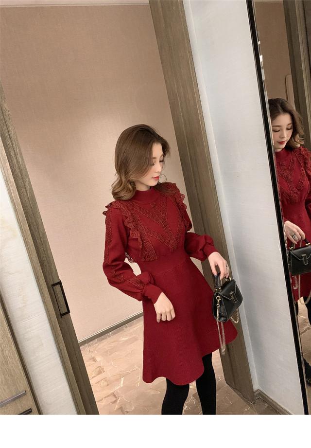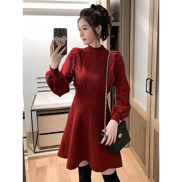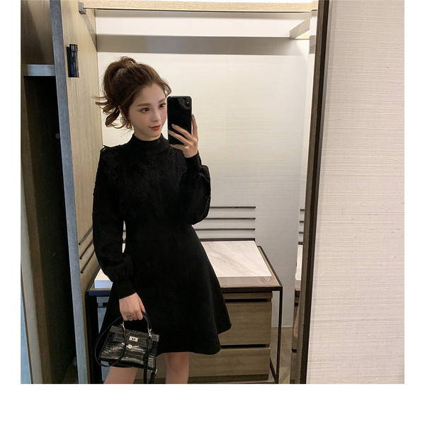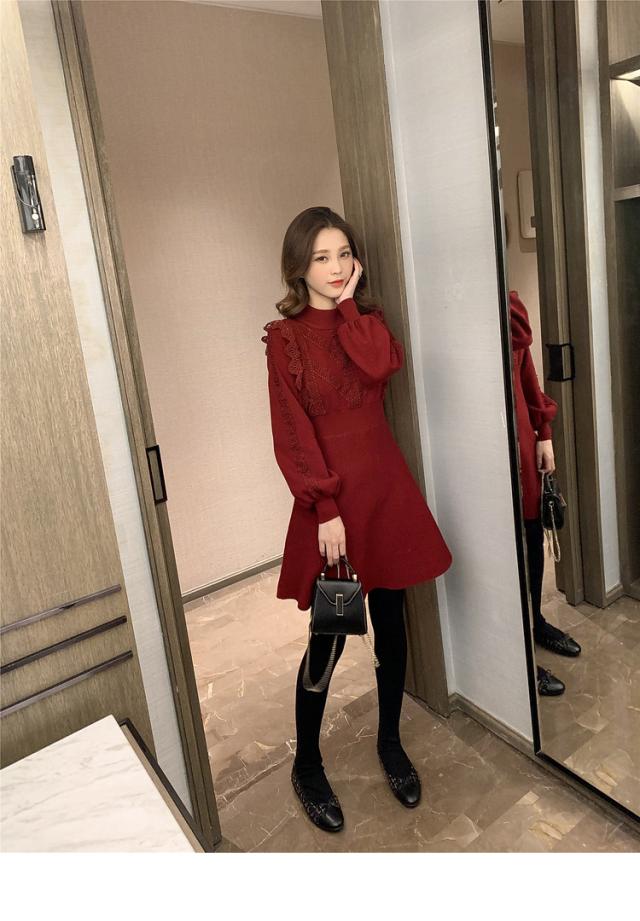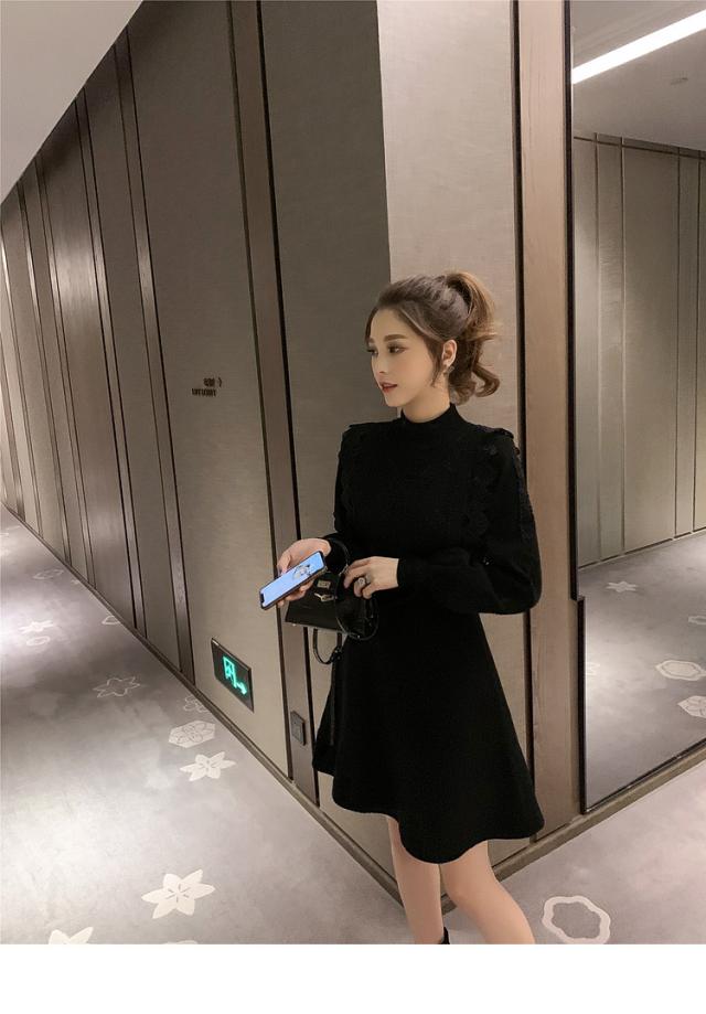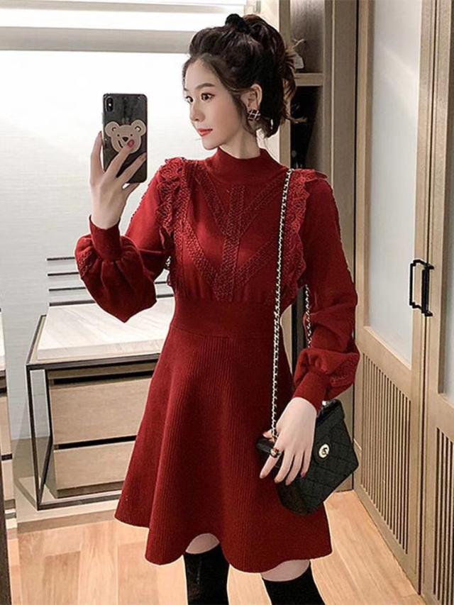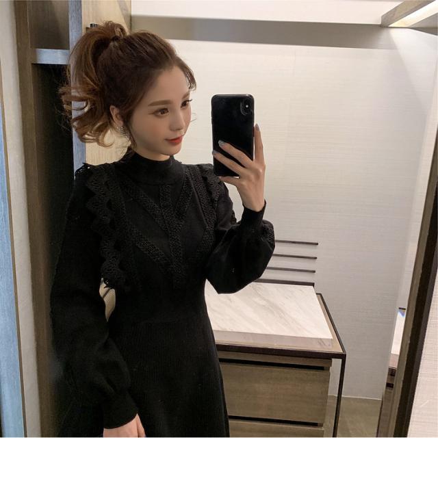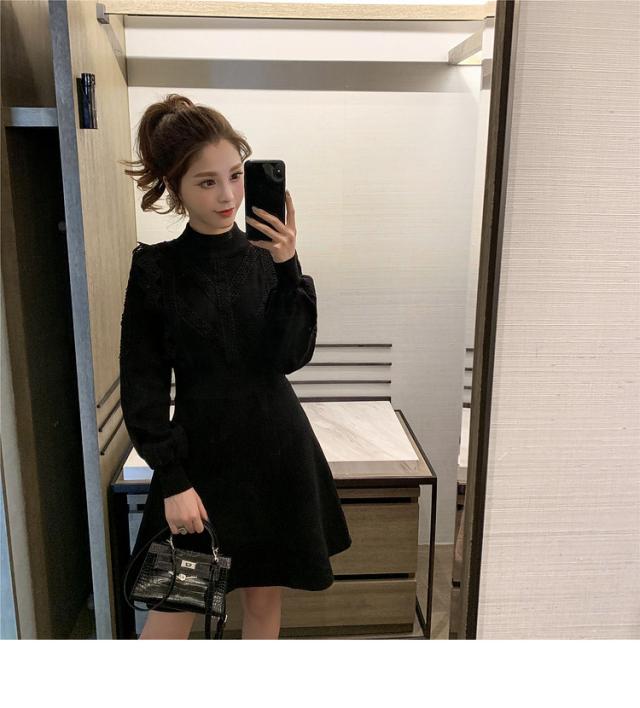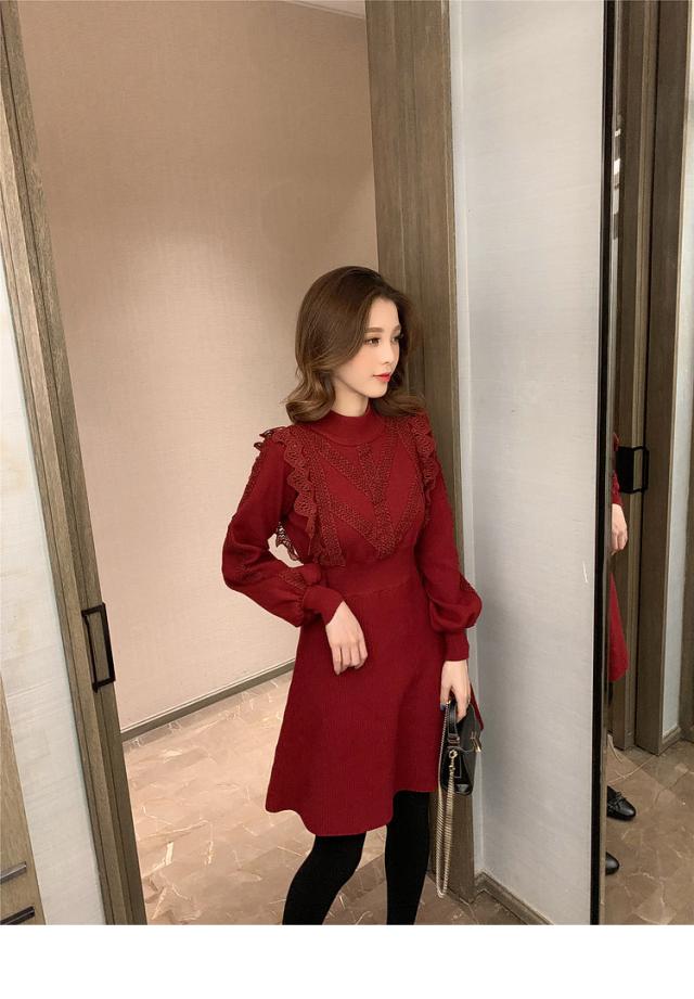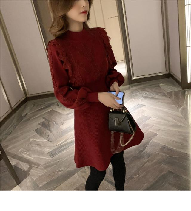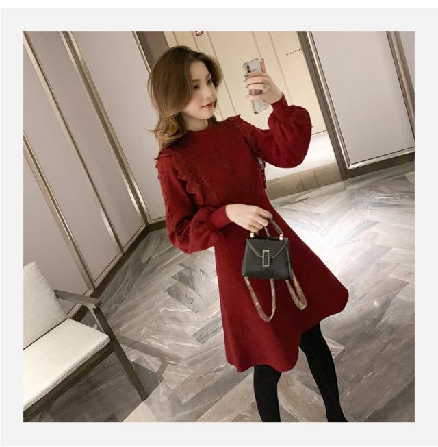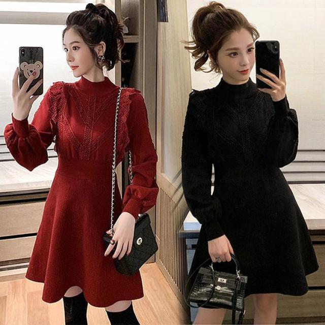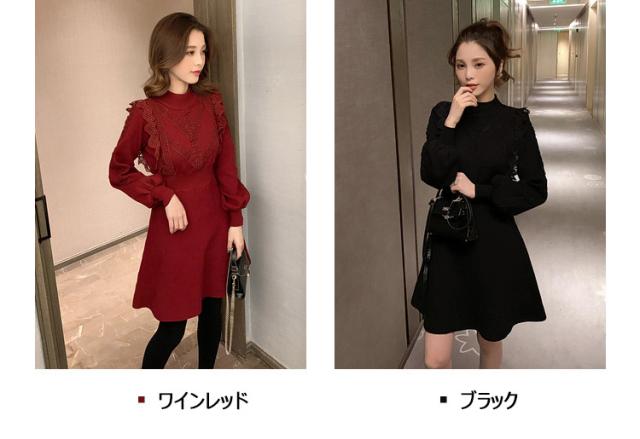 ニットワンピース レディース 40代 秋冬 長袖ワンピース レース 無地 黒 ゆったり 膝丈フレアスカート ニットインナー ゆったり オシャレ 結婚式ドレス 大人