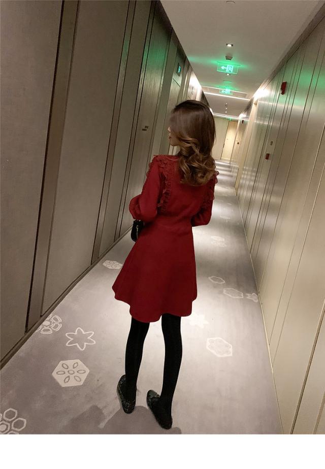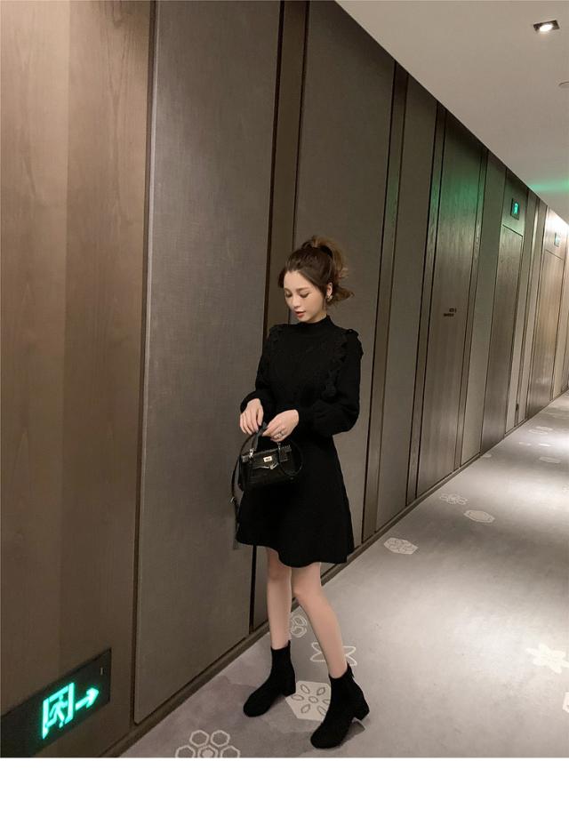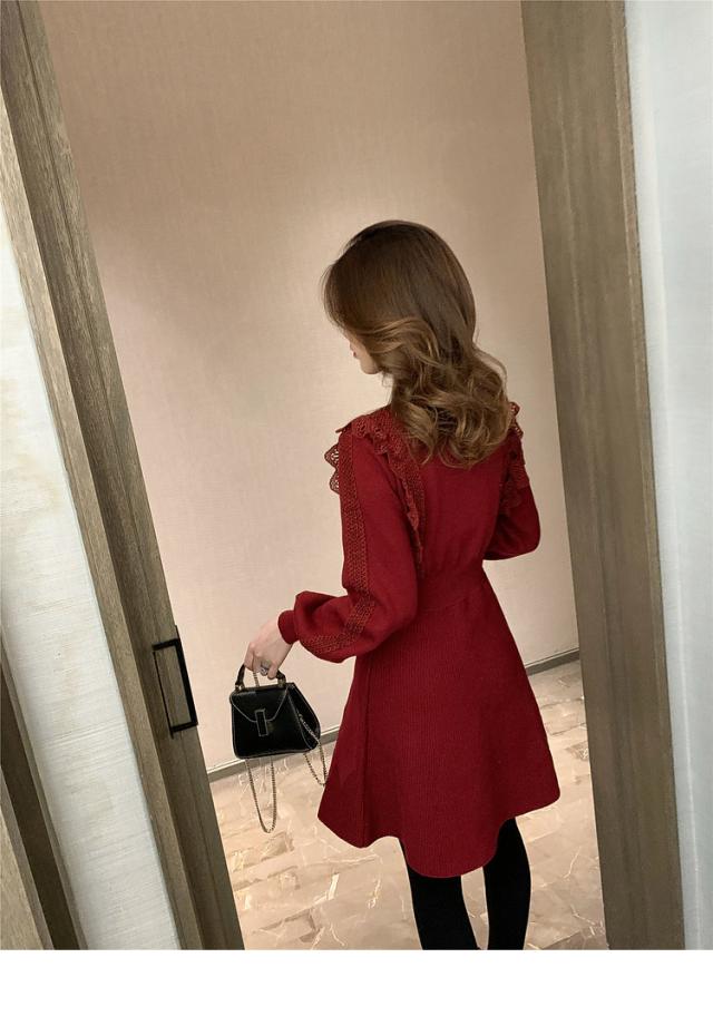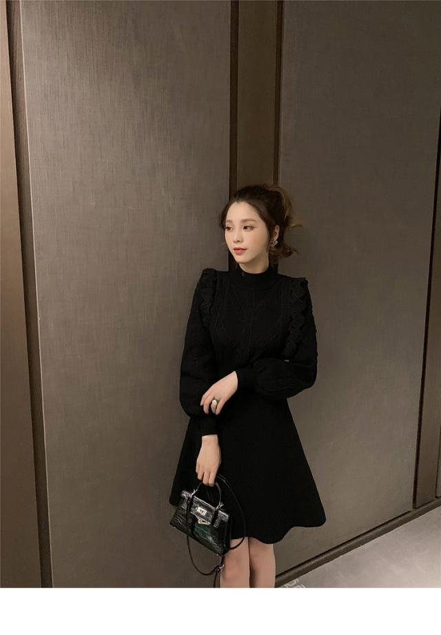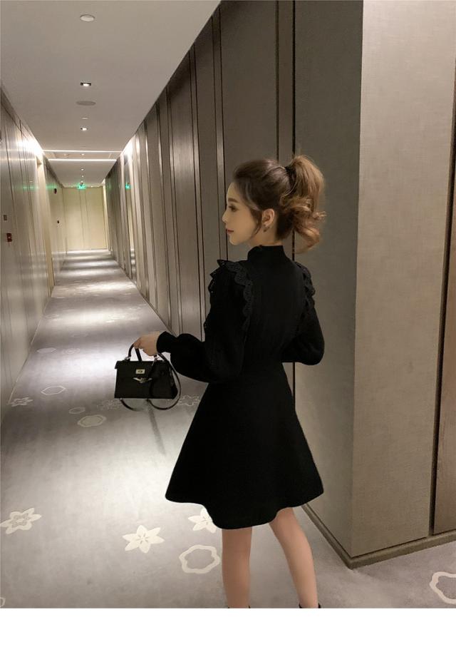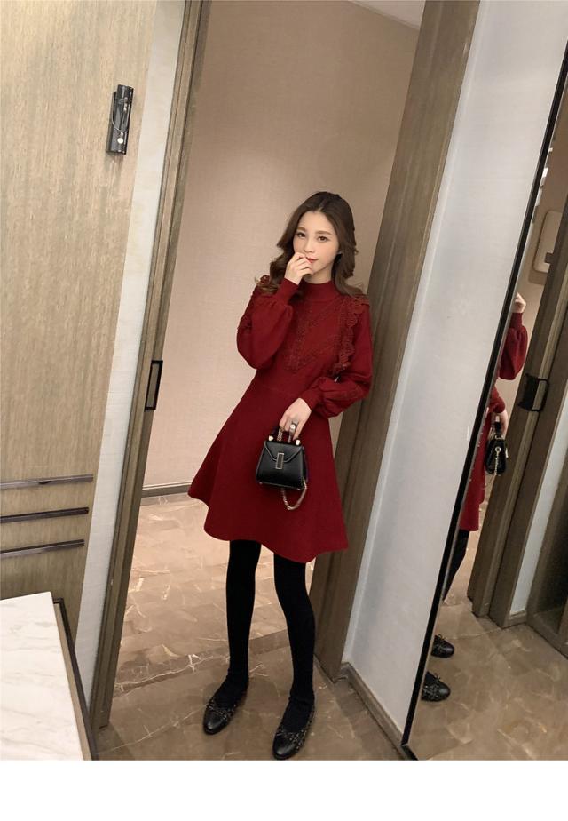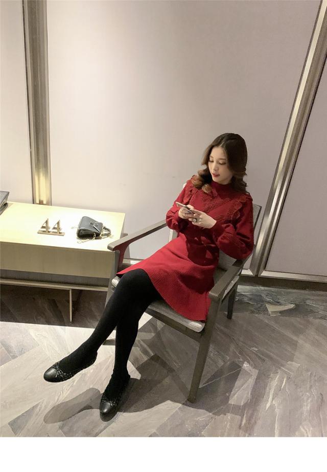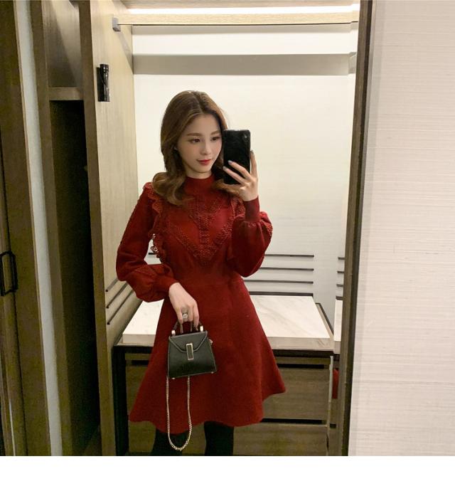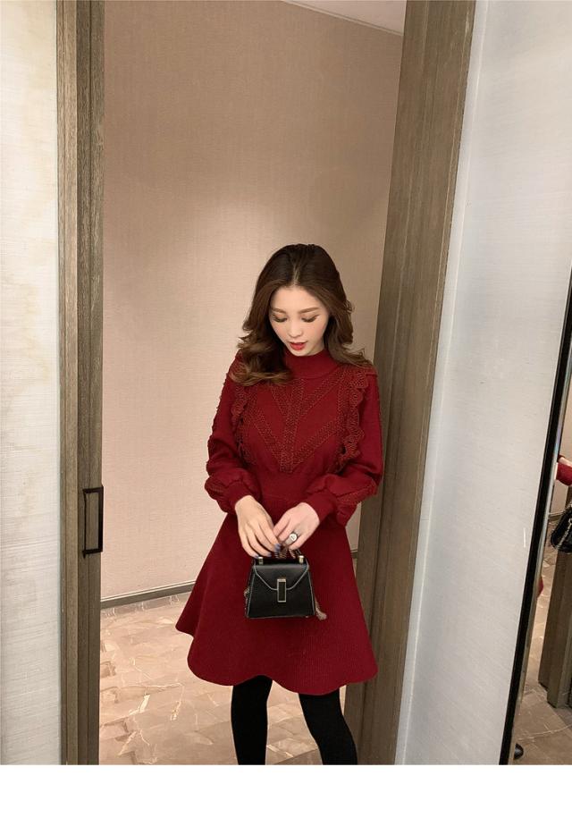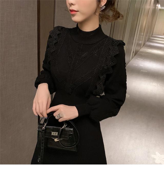 ニットワンピース レディース 40代 秋冬 長袖ワンピース レース 無地 黒 ゆったり 膝丈フレアスカート ニットインナー ゆったり オシャレ 結婚式ドレス 大人