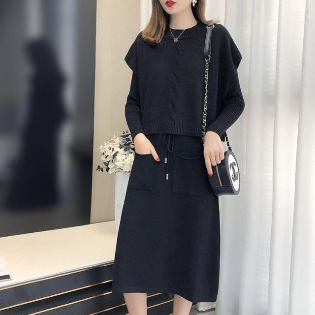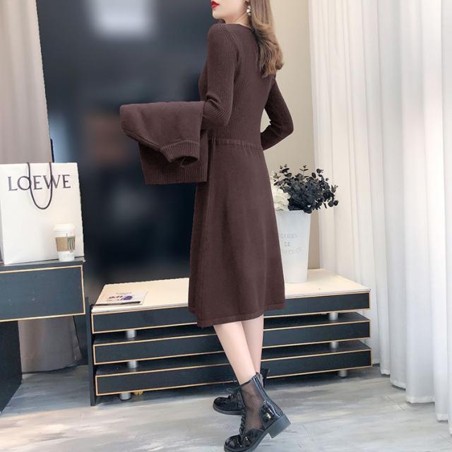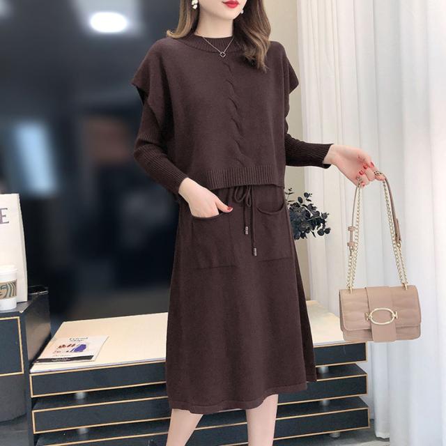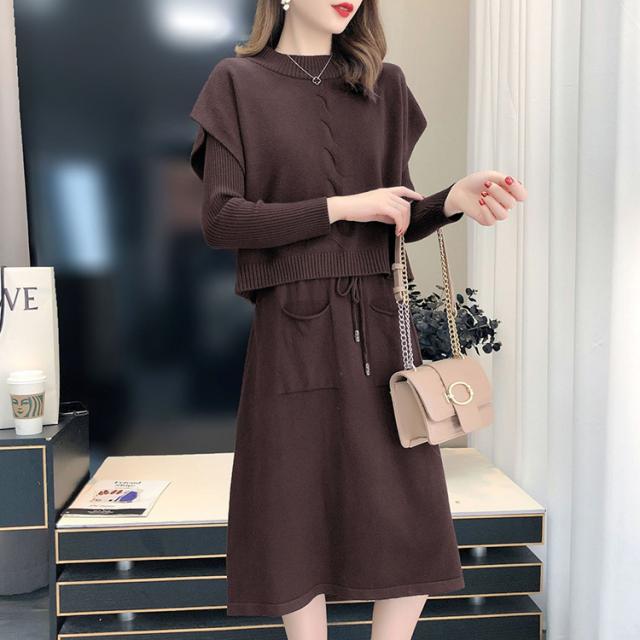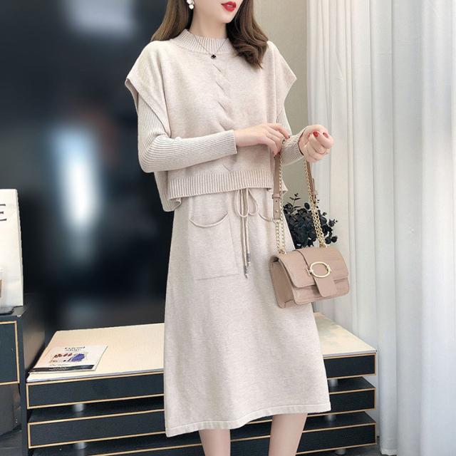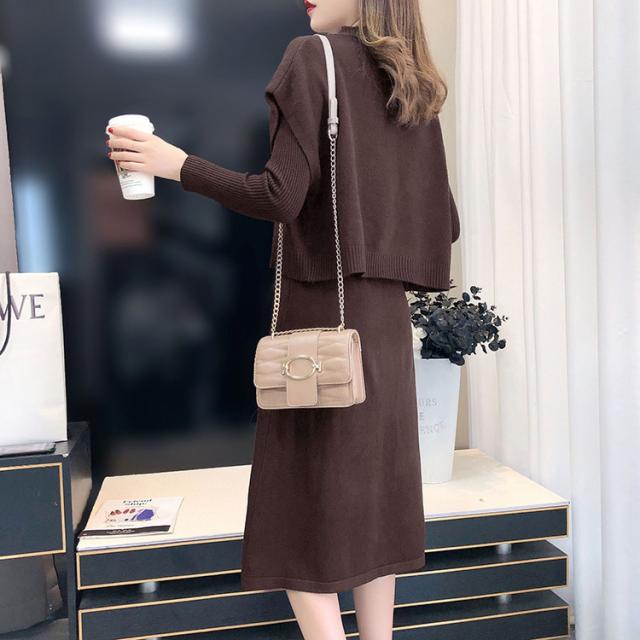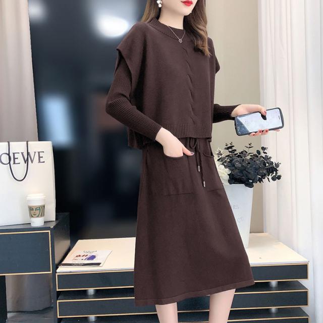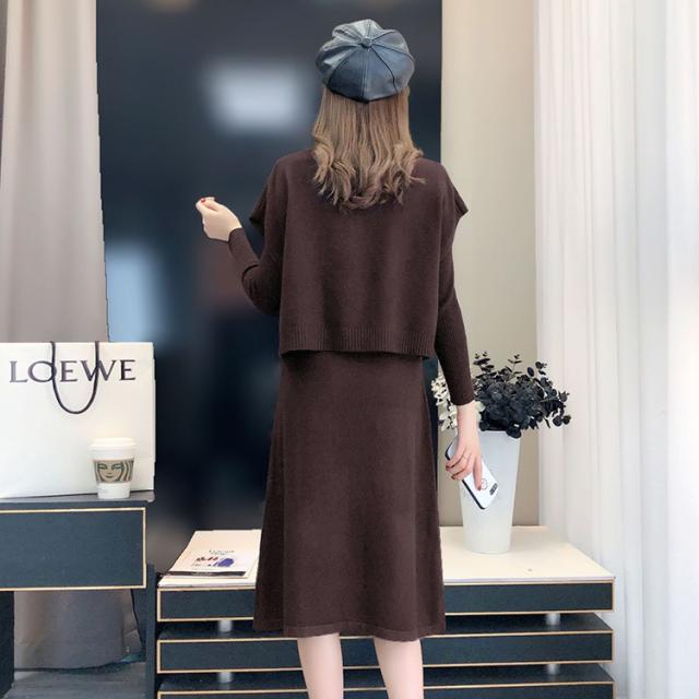 ニットワンピース2点セット レディース 40代 秋冬 長袖ワンピース ニットベスト 無地ニットセットアップ フレアスカートニットインナー オシャレ 結婚式ドレス