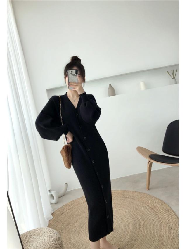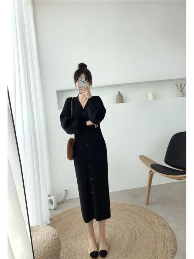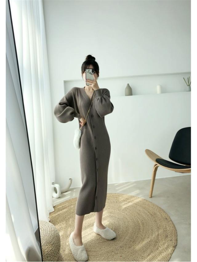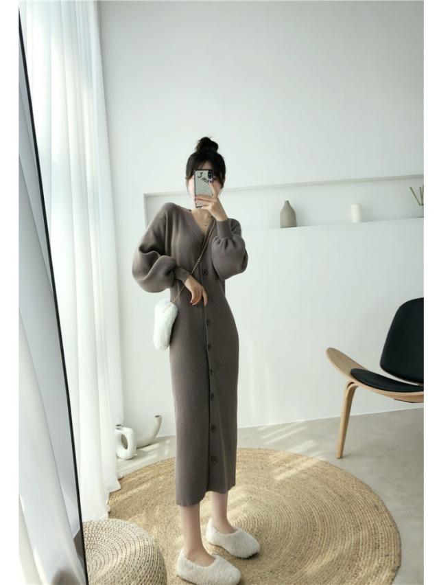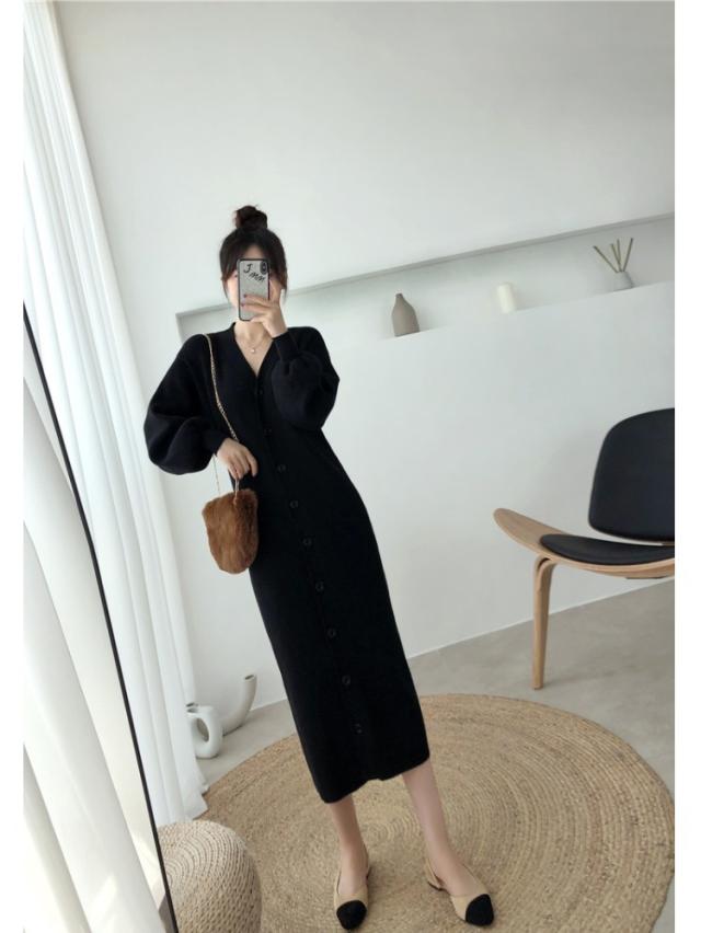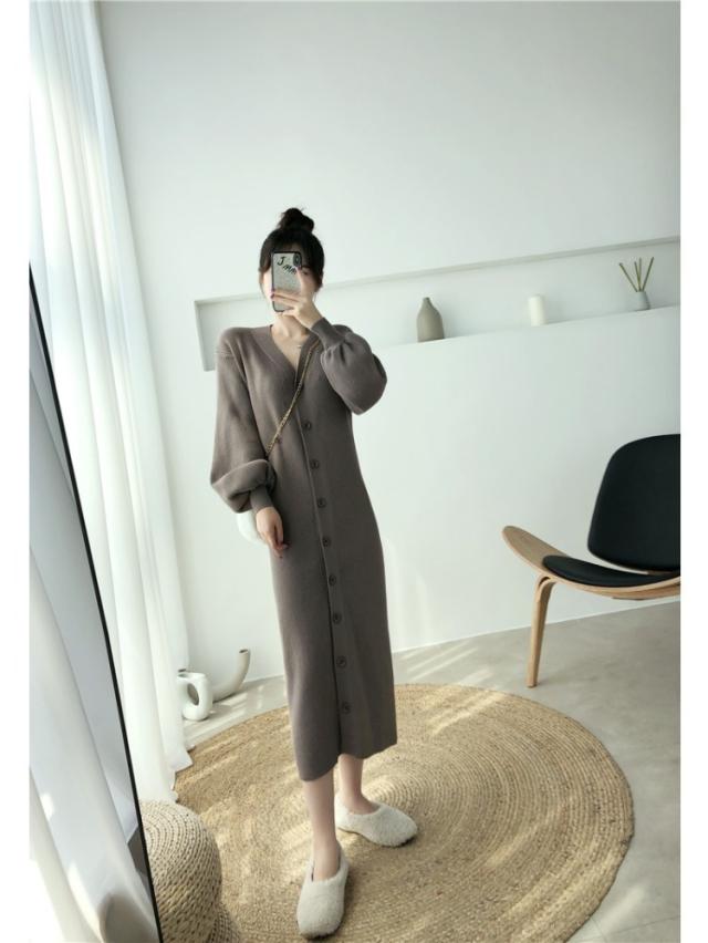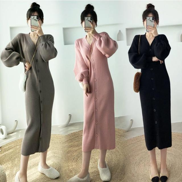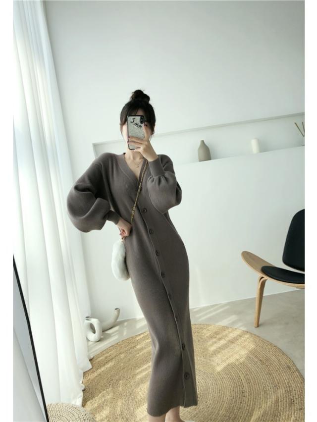 ニットワンピース レディース 40代 秋冬 長袖ワンピース vネックセーター バファローズワンピース ロング丈 ニットスカート インナー オシャレ 韓国風 大人