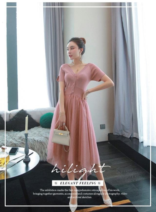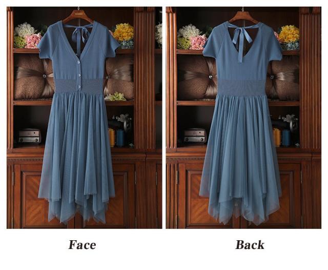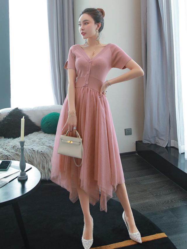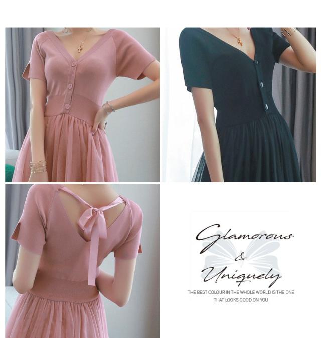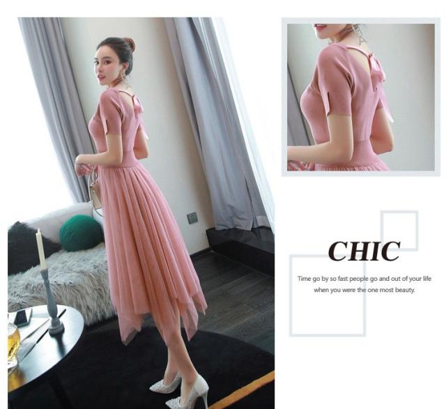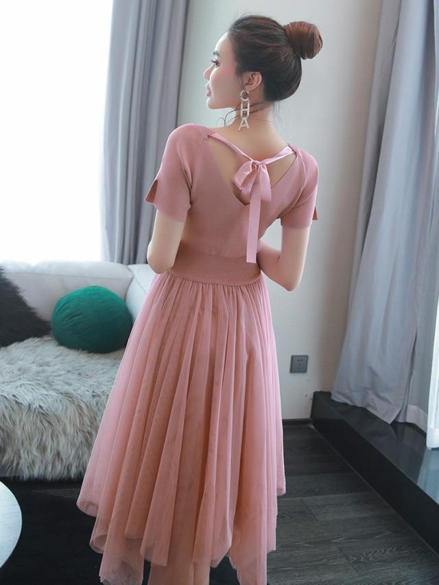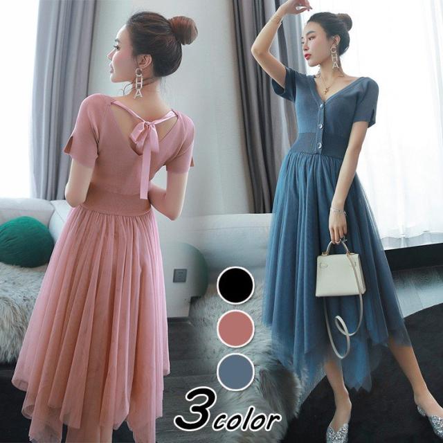 ワンピース レディース 40代ワンピース 春夏 半袖 vネックニットワンピース チュールスカート 背中リボン オシャレ 結婚式ドレス お出かけ 大人 30代 50代