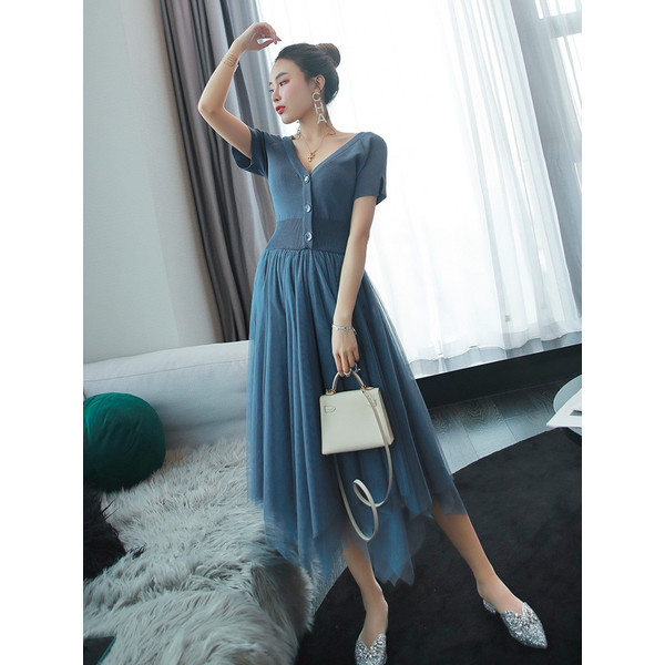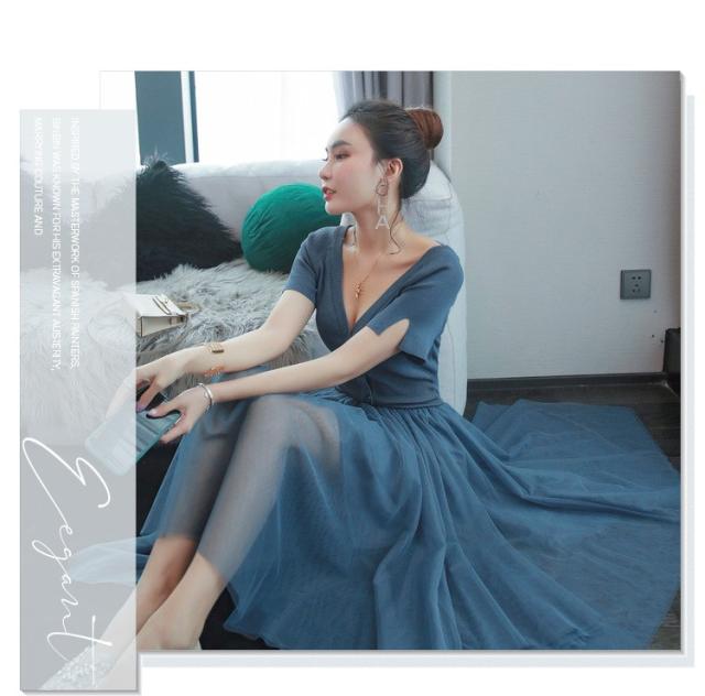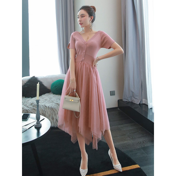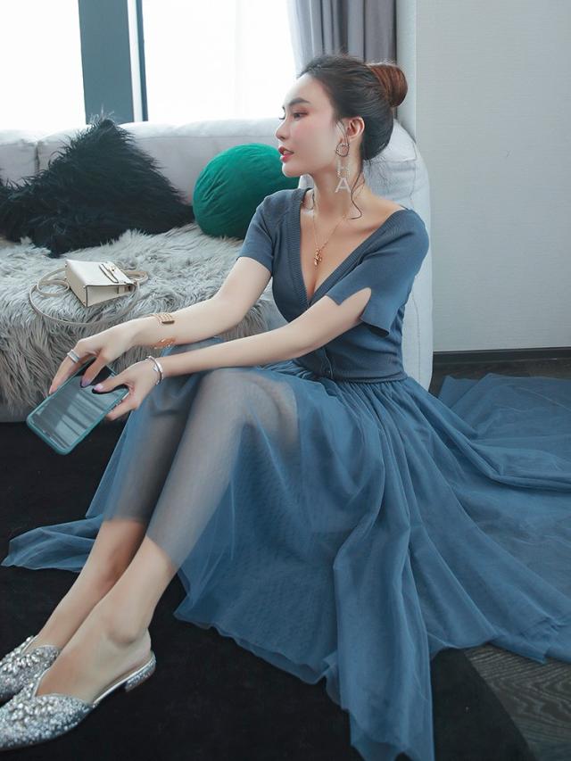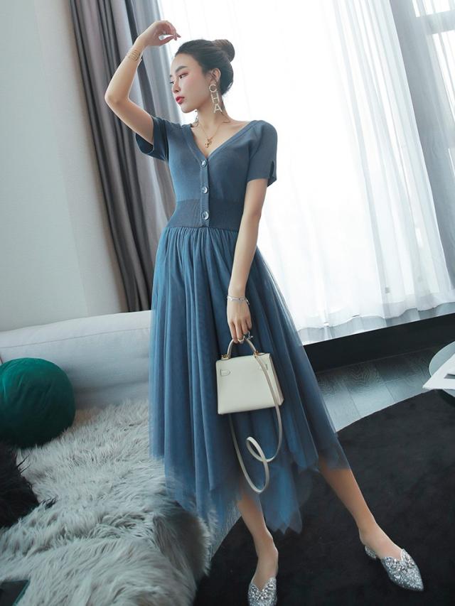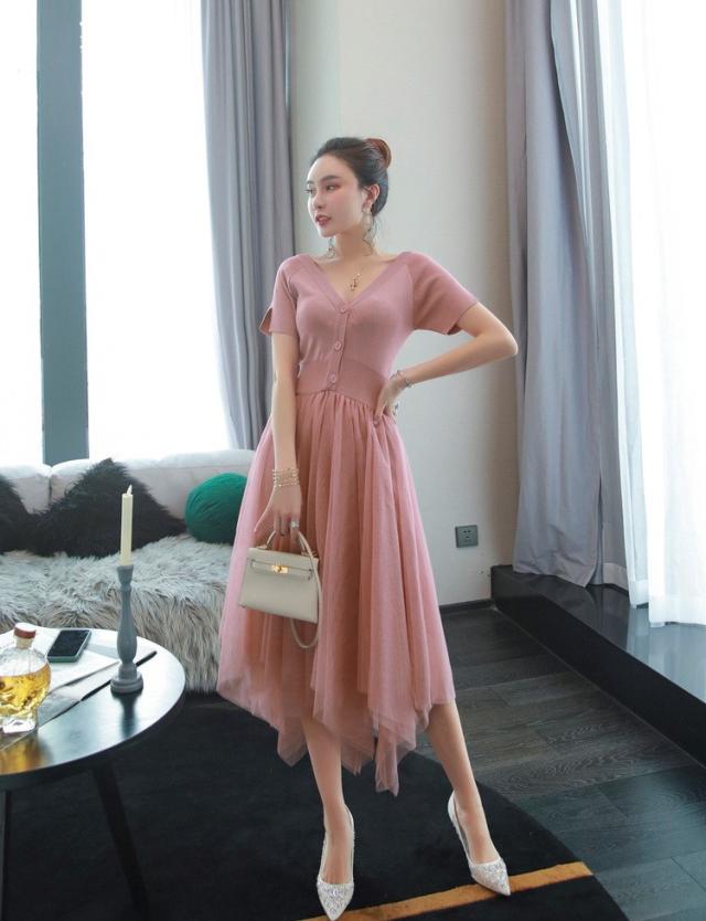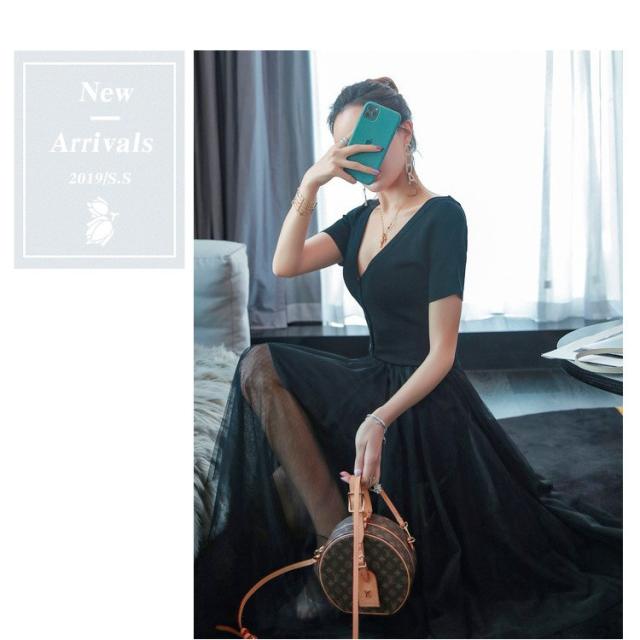 ワンピース レディース 40代ワンピース 春夏 半袖 vネックニットワンピース チュールスカート 背中リボン オシャレ 結婚式ドレス お出かけ 大人 30代 50代