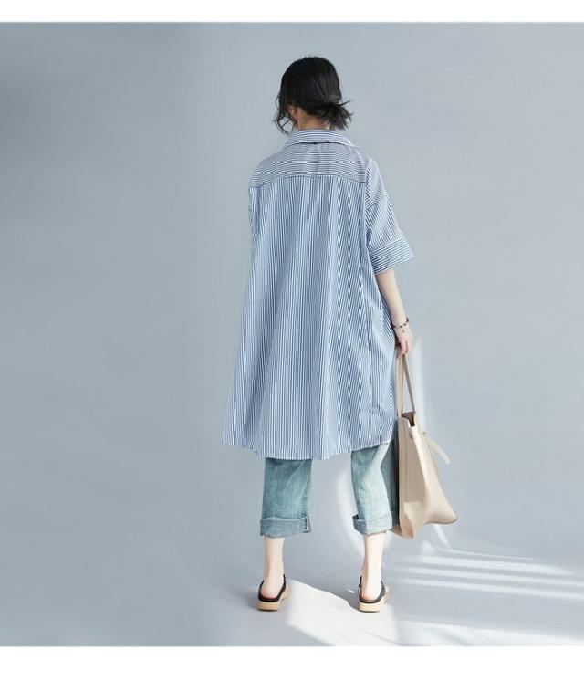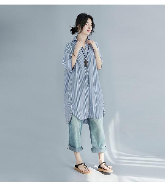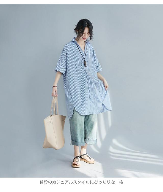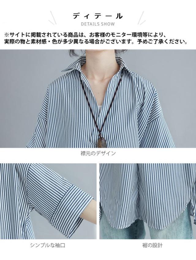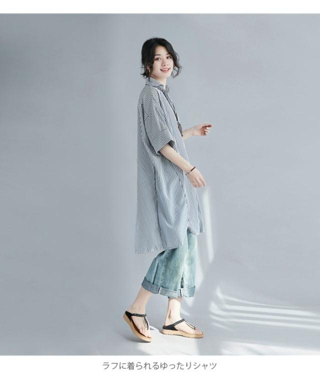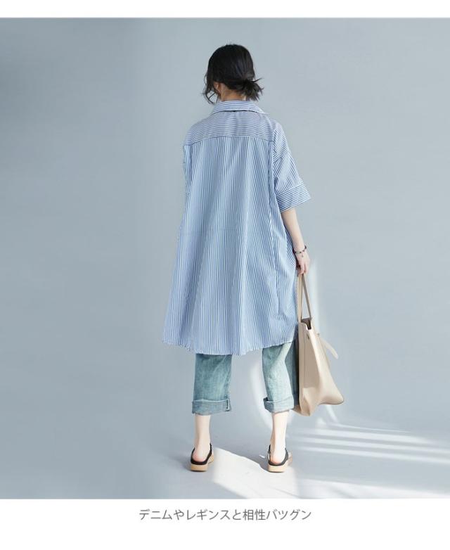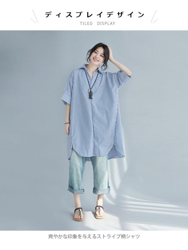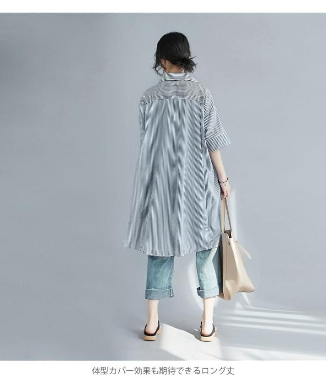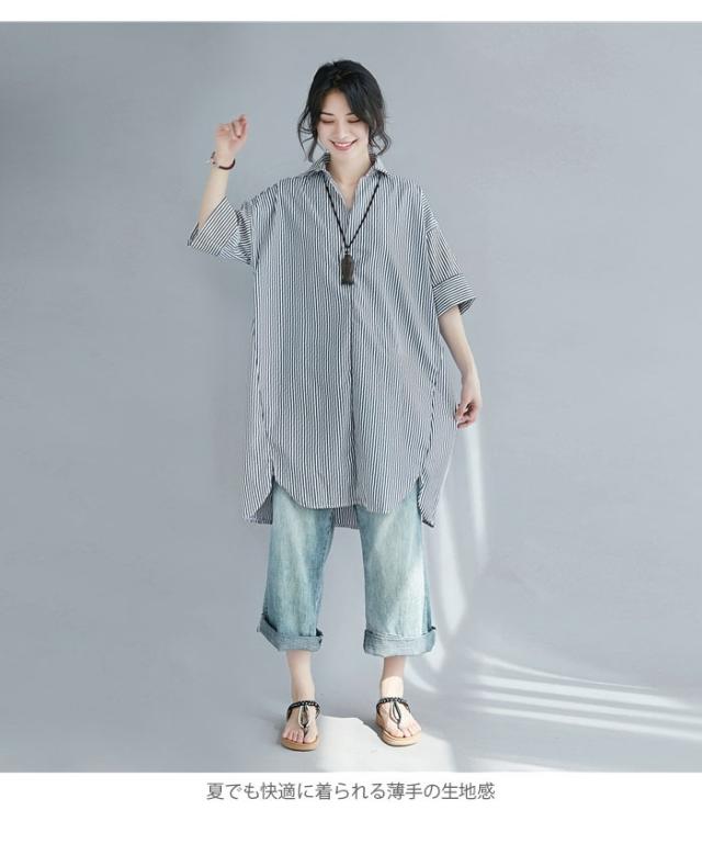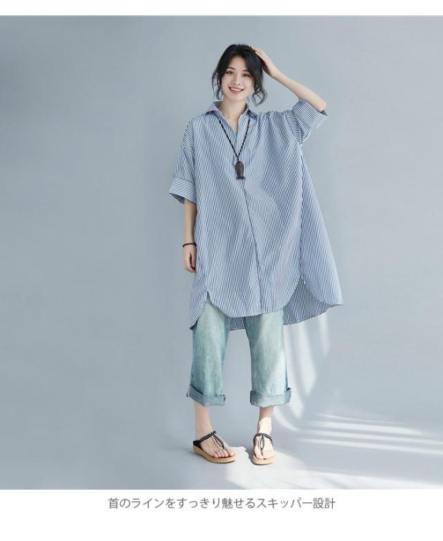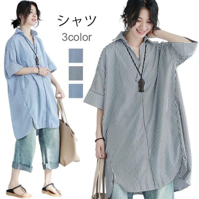 シャツ レディース ロングシャツ ストライプ柄 五分袖 スキッパーシャツ ロング丈 ゆったり ゆるシャツ 薄手 お洒落 カジュアル 体型カバー トップス