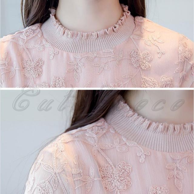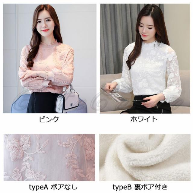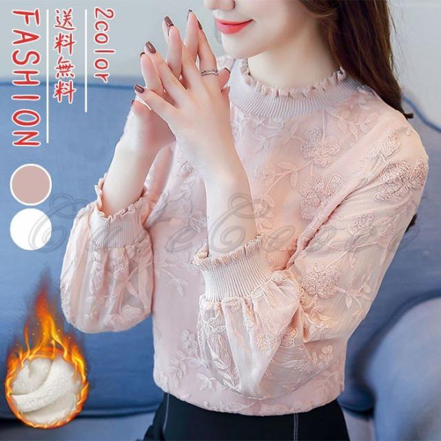 レースブラウス レディース Tシャツ 長袖 立ち襟 ハイネック 裏起毛 ボア付き 総レース インナー フォーマル 細身 春秋冬 トップス おしゃれ