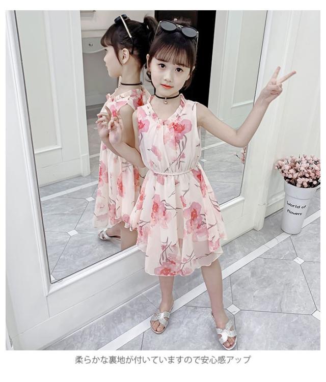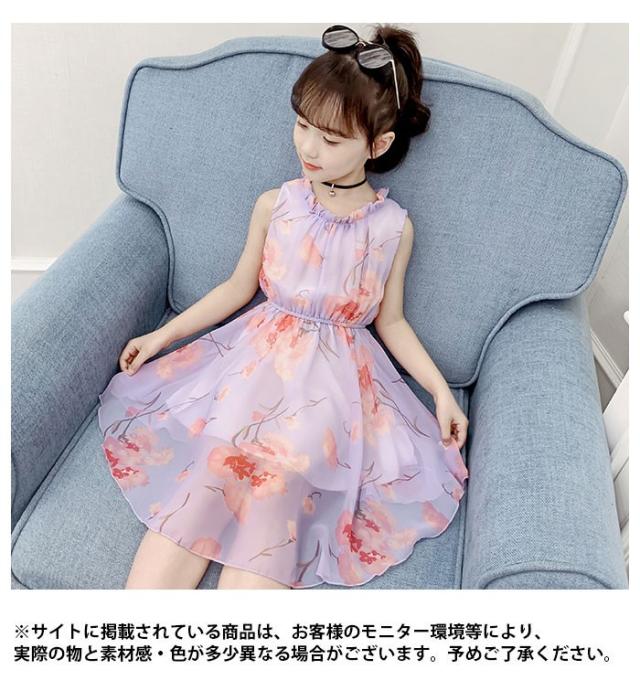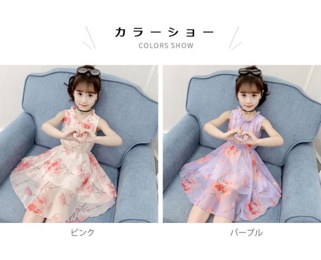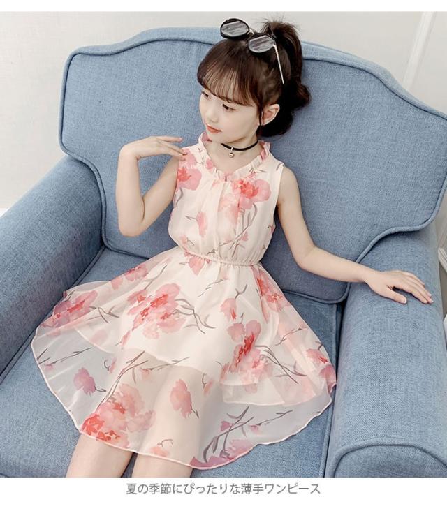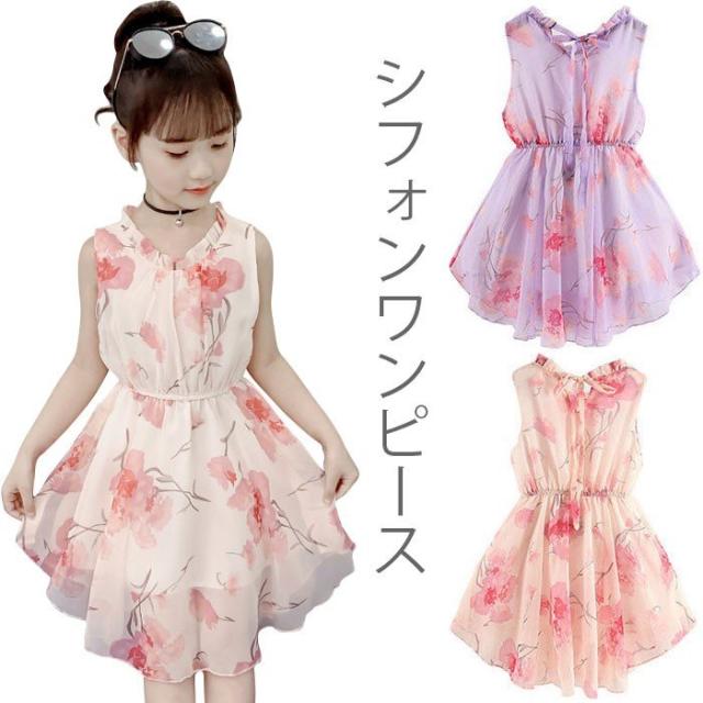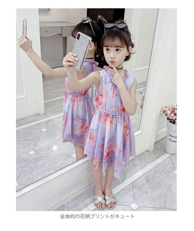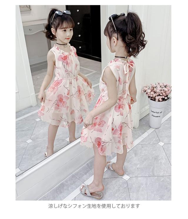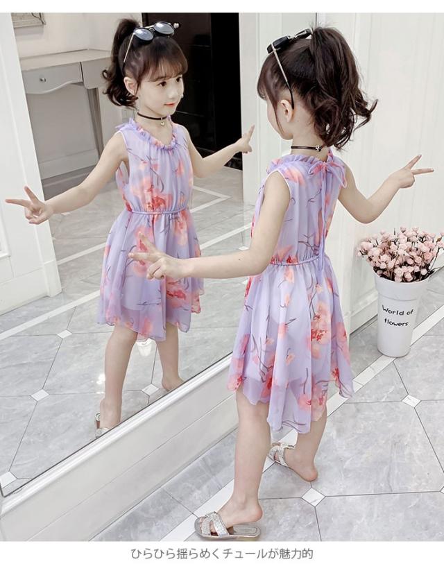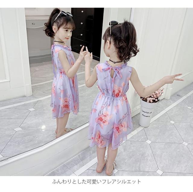 チュールワンピース 子供服 シフォンワンピース ノースリーブ フリル ウエストゴム 花柄 透け感 裏地付き シフォン ワンピース チュール 薄手 可愛い
