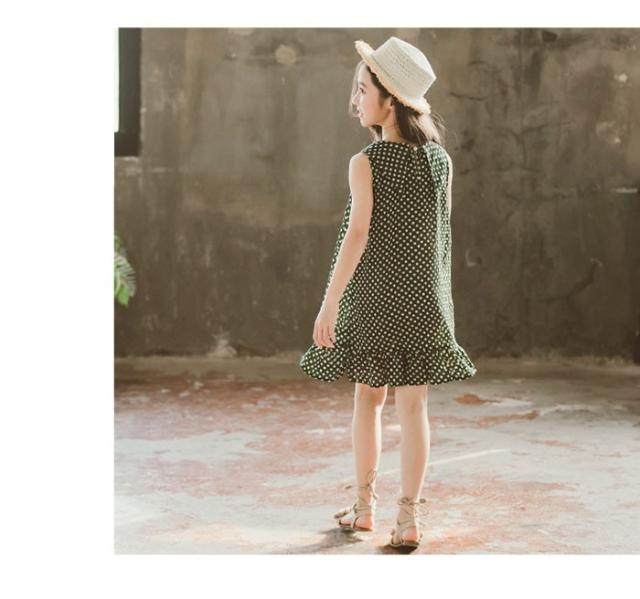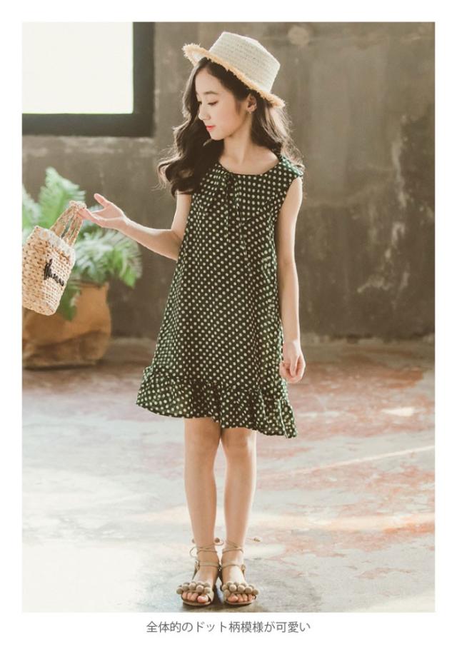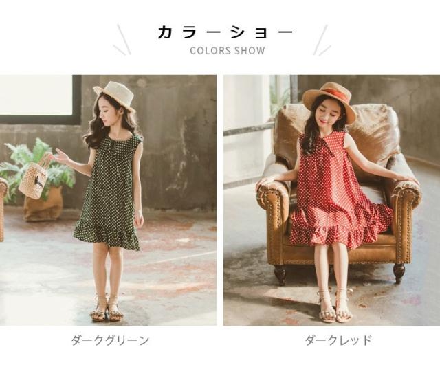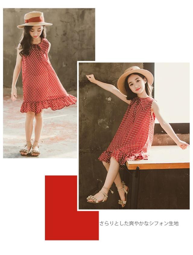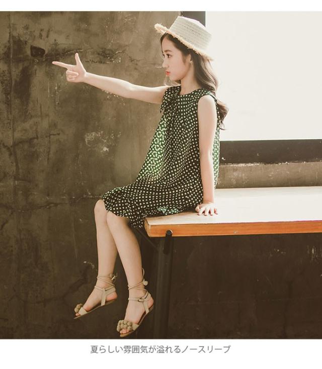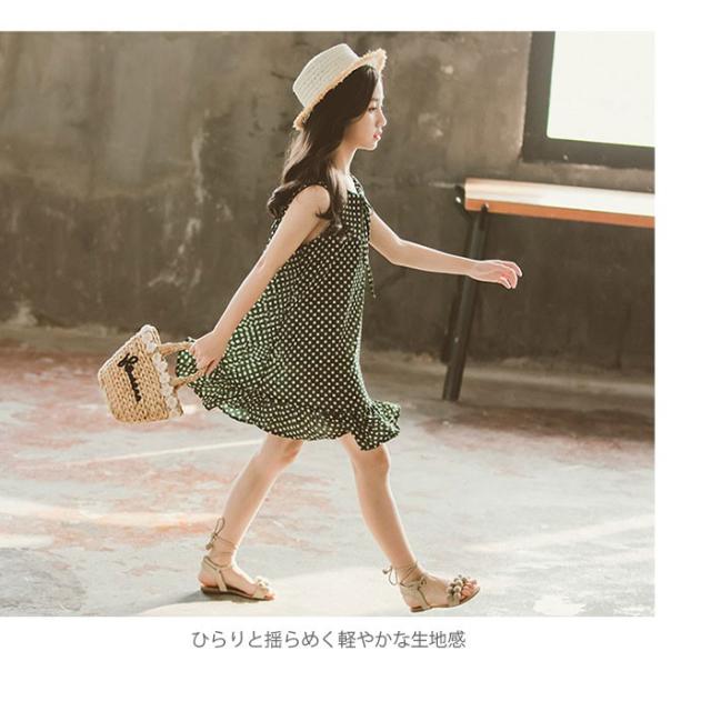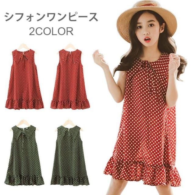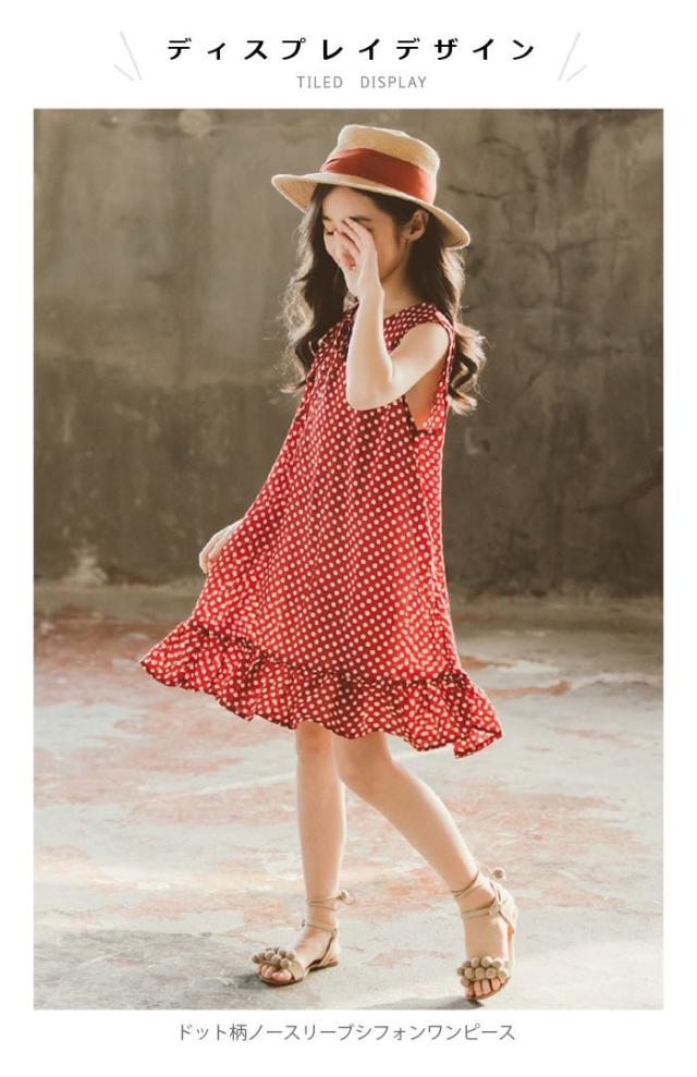 シフォンワンピース 子供服 ワンピース シフォン フレアワンピース ノースリーブ リボン付き ドット柄 ふんわり ゆったり 夏ワンピース 女の子 女児