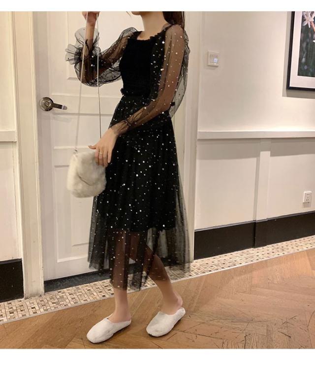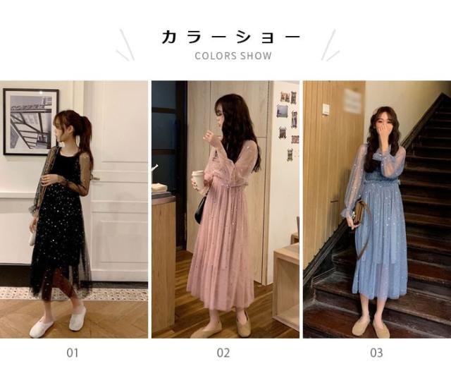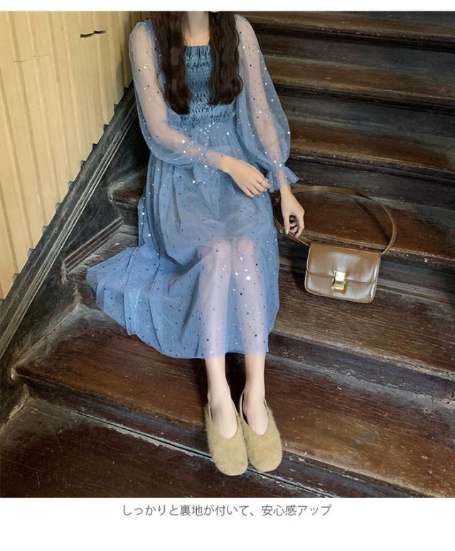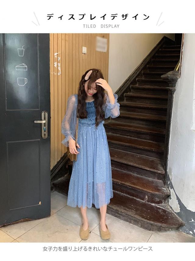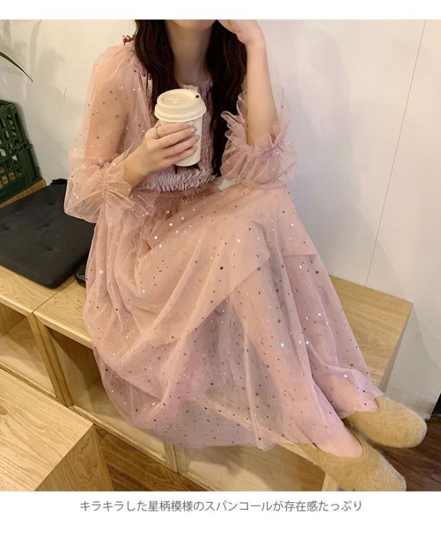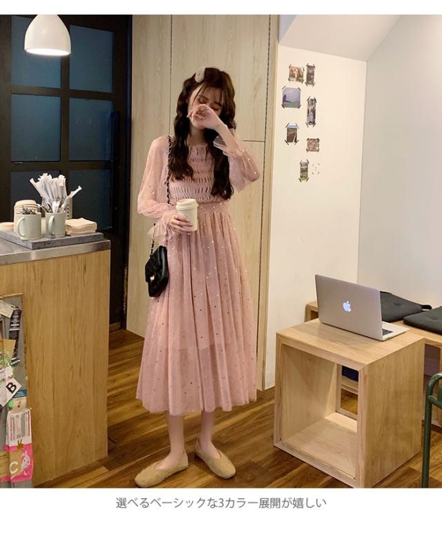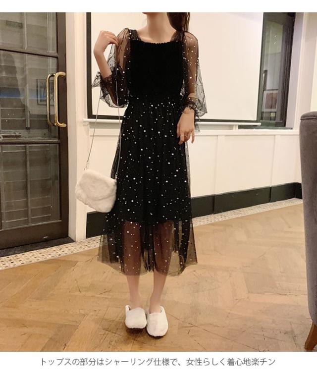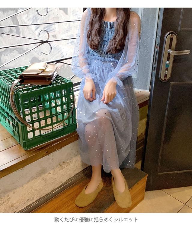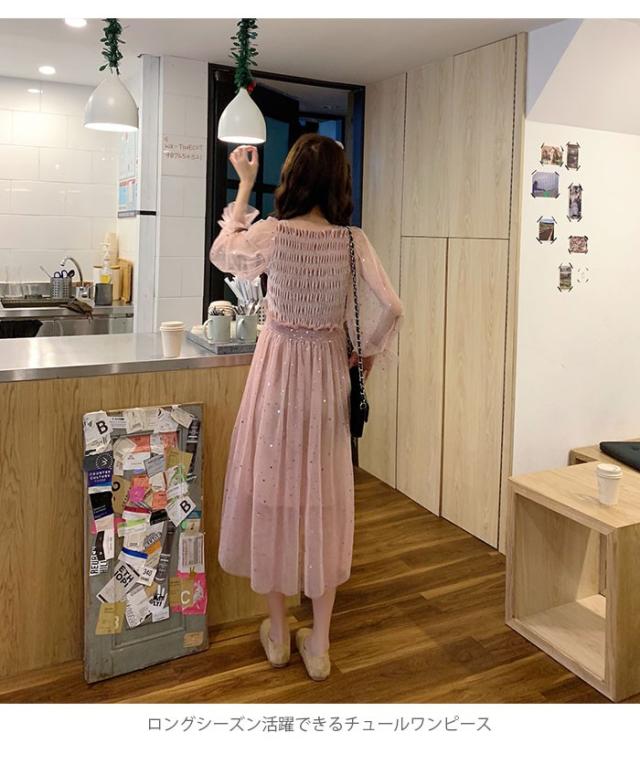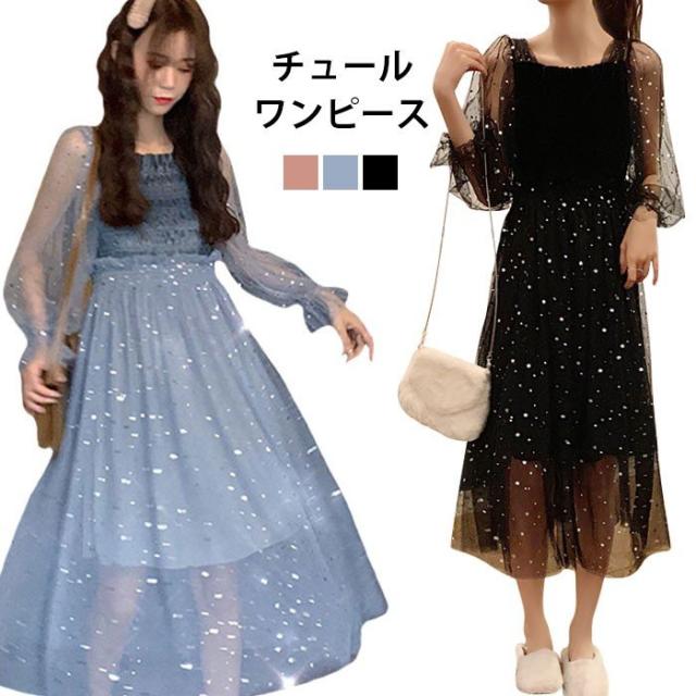チュールワンピース レディース ワンピース チュール シフォンワンピース ロングワンピース ミモレワンピース 長袖 フレア シャーリング 透け感 薄手