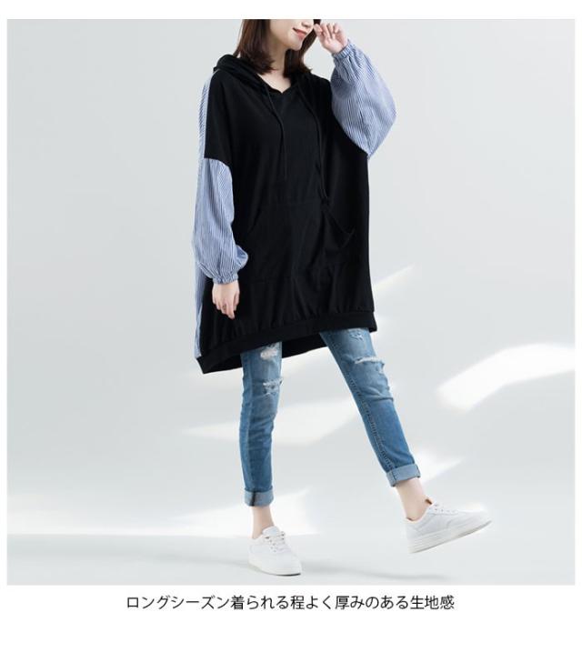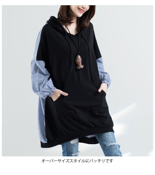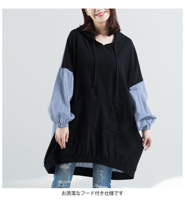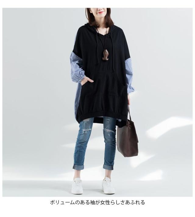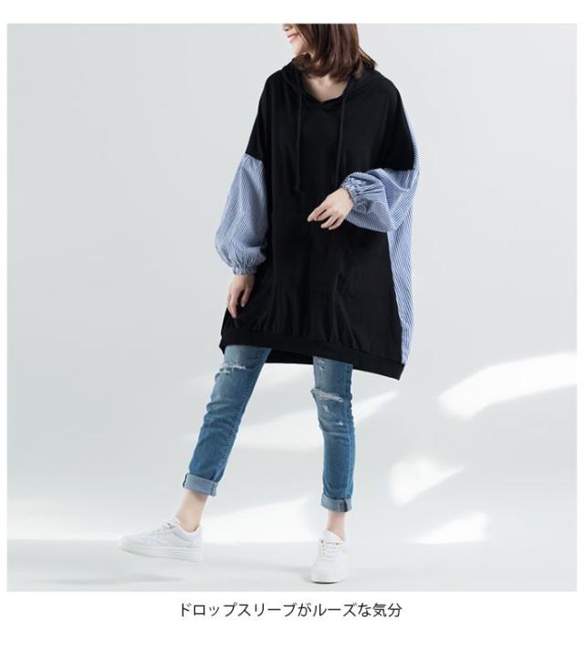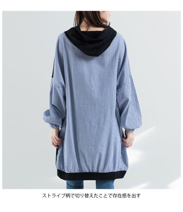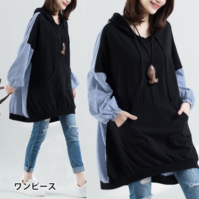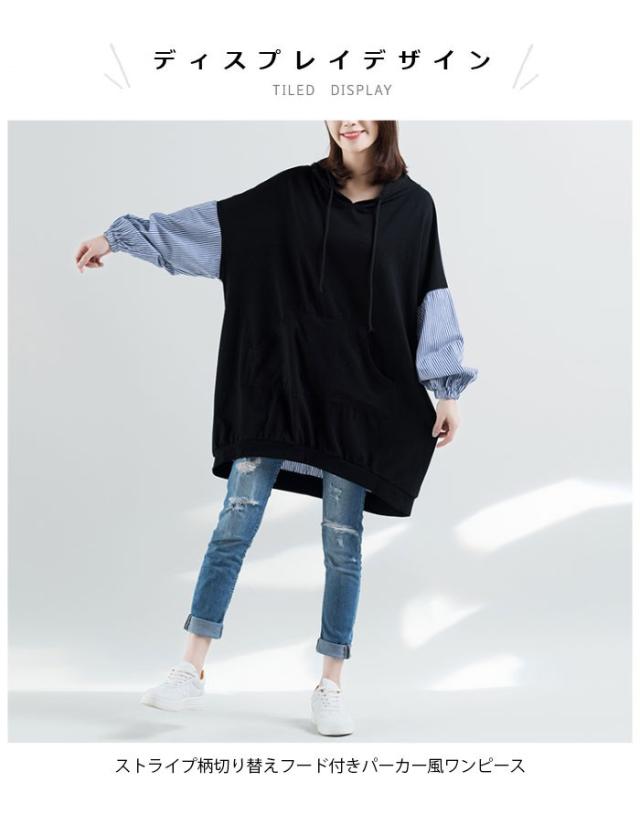 ワンピース レディース ショートワンピース パーカーワンピース ストライプ柄 フード付き 長袖 膝上丈 Aライン ドロップショルダー ゆったり