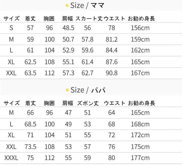 | サイズ | 女の子(100cm) 女の子(110cm) 女の子(120cm) 女の子(130cm) 女の子(140cm) 女の子(150cm) 男の子(100cm) 男の子(110cm) 男の子(120cm) 男の子(130cm) 男の子(140cm) 男の子(150cm) 男の子(160cm) ママ(S) ママ(M) ママ(L) ママ(XL) ママ(2XL) パパ(M) パパ(L) パパ(XL) パパ(2XL) パパ(3XL) |