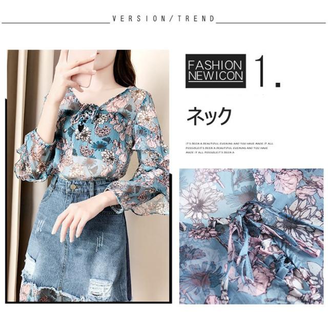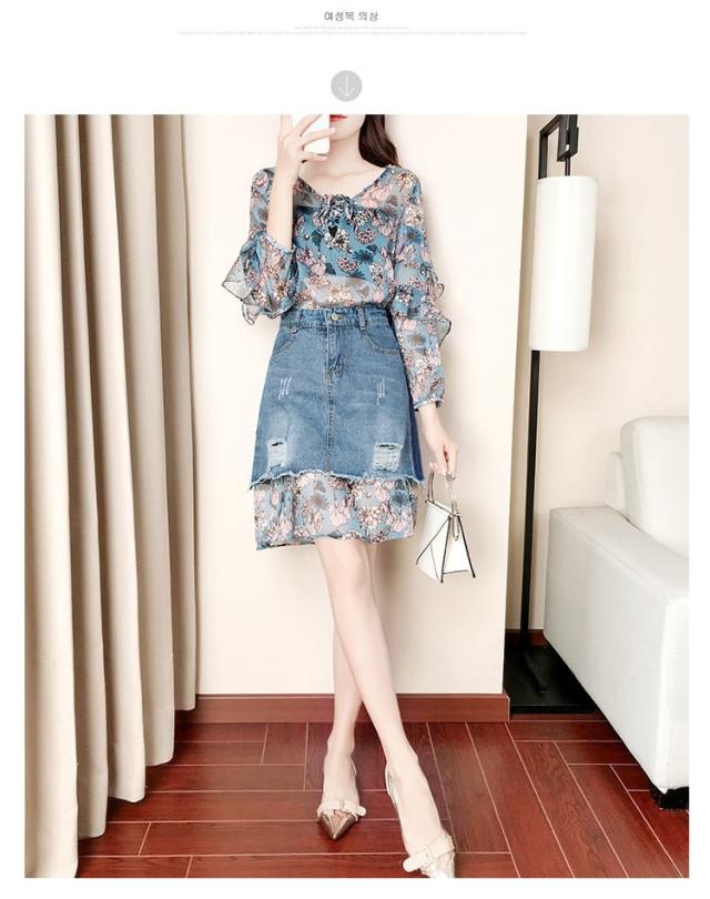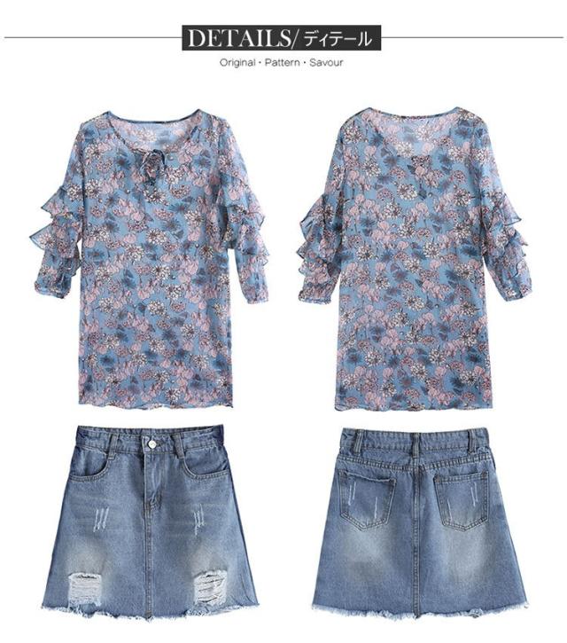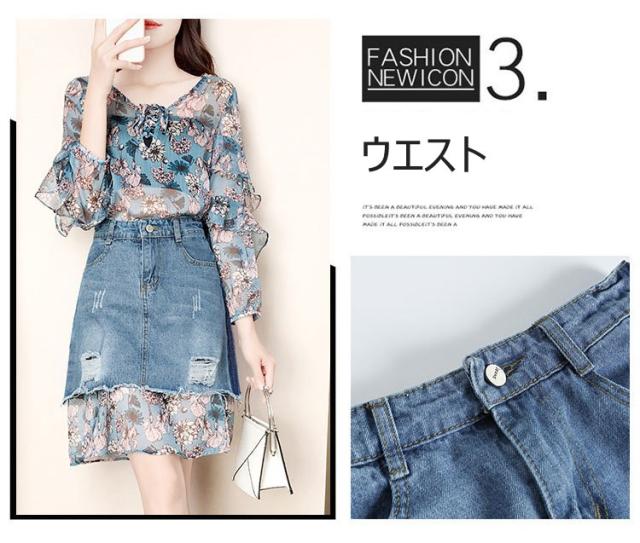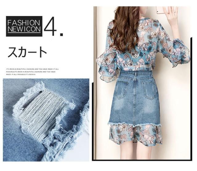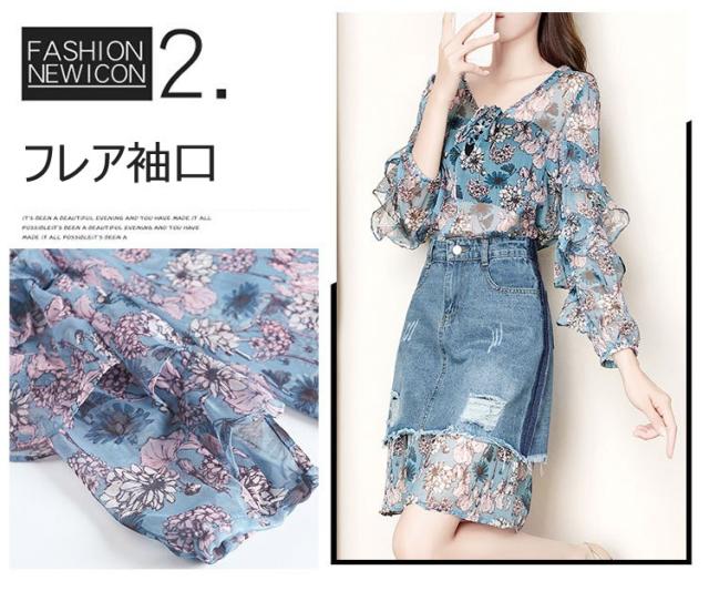 セットアップ レディース 夏 セットアップ 長袖 デニムスカート 2点セット 夏服 花柄 シフォン タイトスカート 大きいサイズ 通勤 OL オシャレ 大人 新作