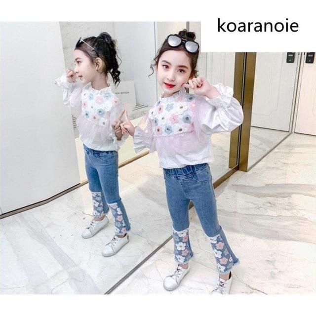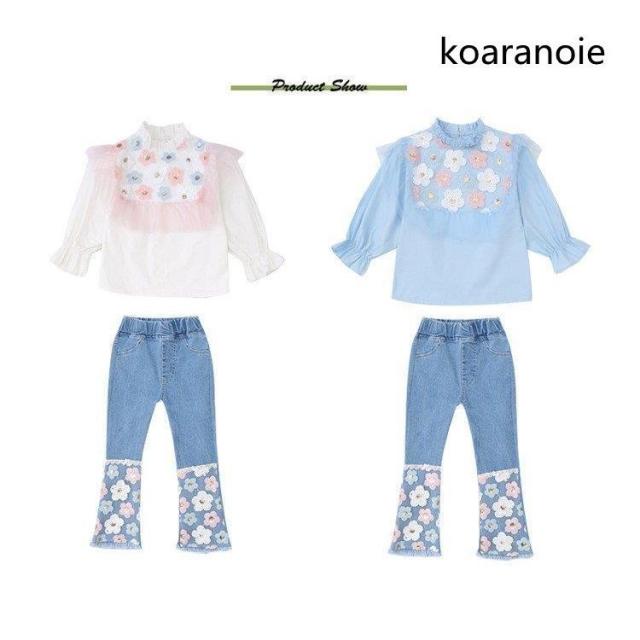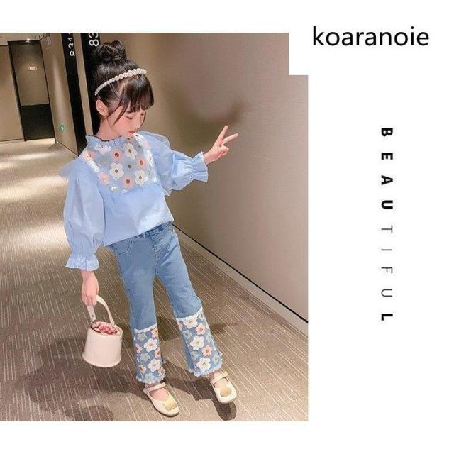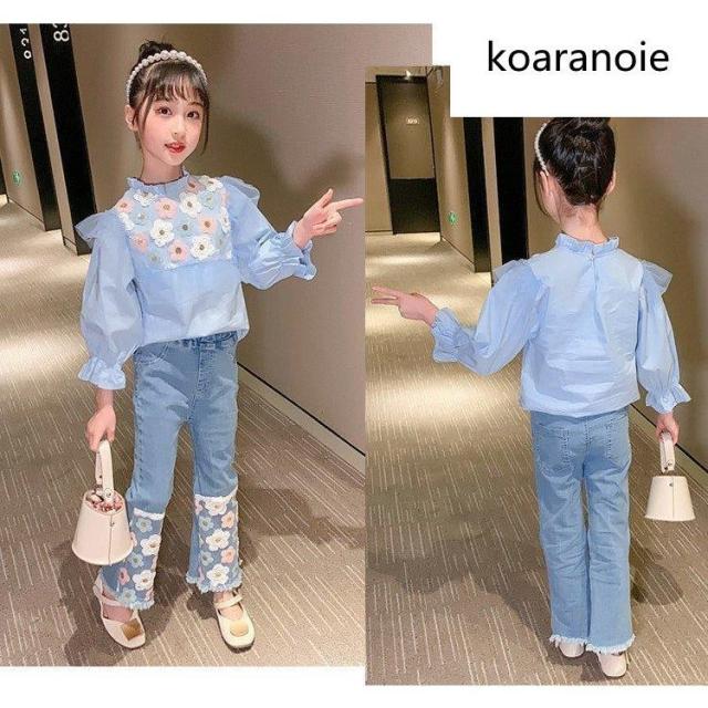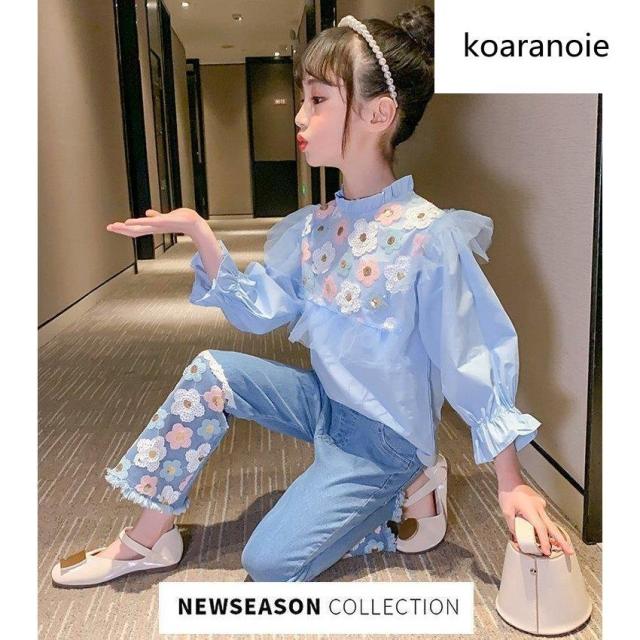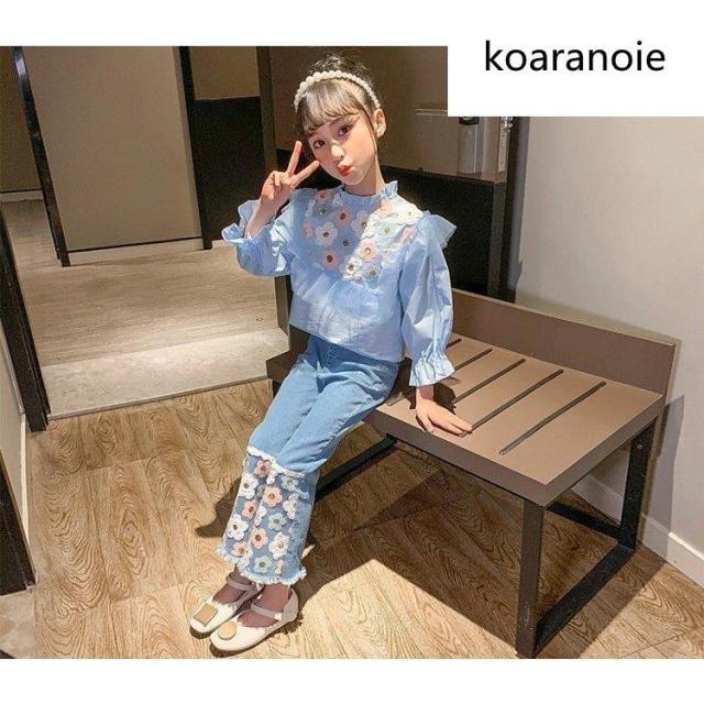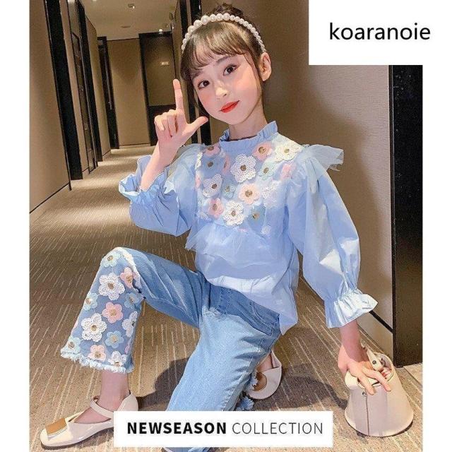子供服 セットアップ キッズ 女の子 長袖 春服 トップス ブラウス シャツ 花柄 ロングパンツ デニムパンツ 長ズボン 韓国子供服 ジュニア おしゃれ 可愛い 新品