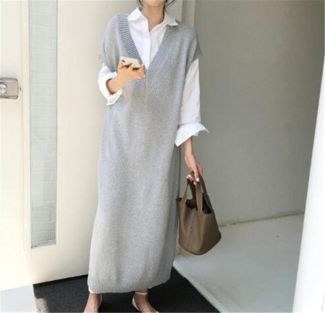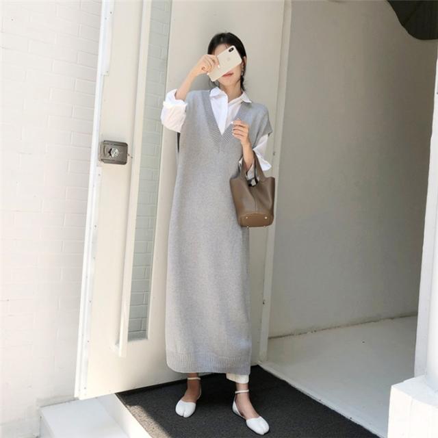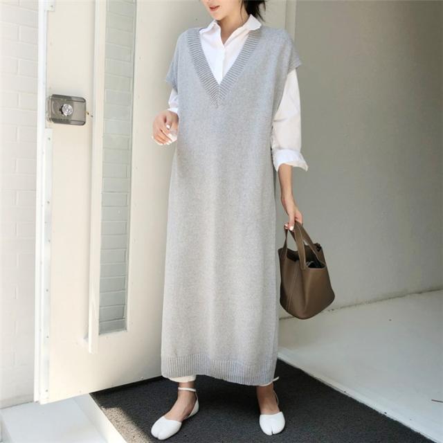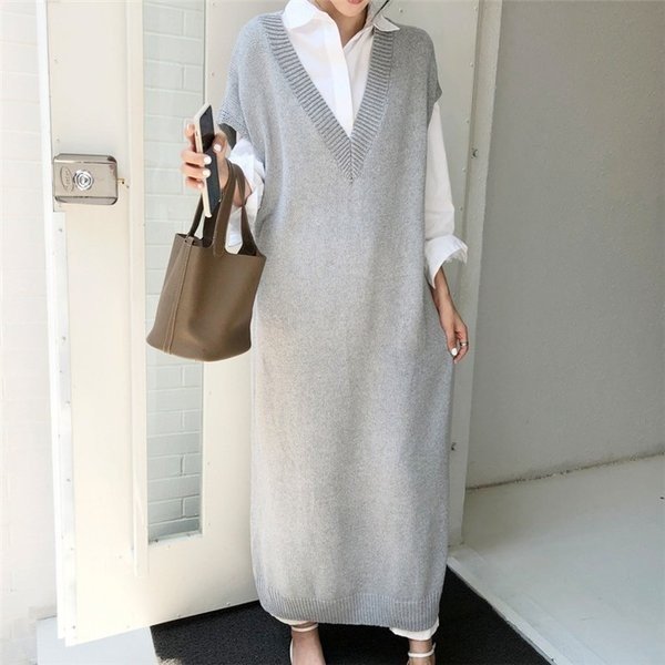 ニットワンピース 超ロング レディース 秋冬 ロングジレ ニット ベストワンピース ロングニットワンピース Vネック ノースリーブ セーター ゆったり 体型カバー