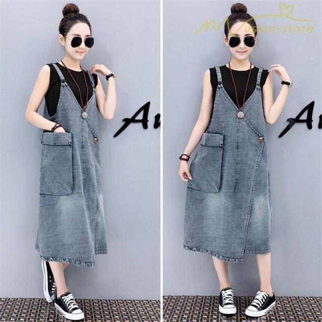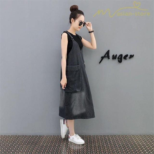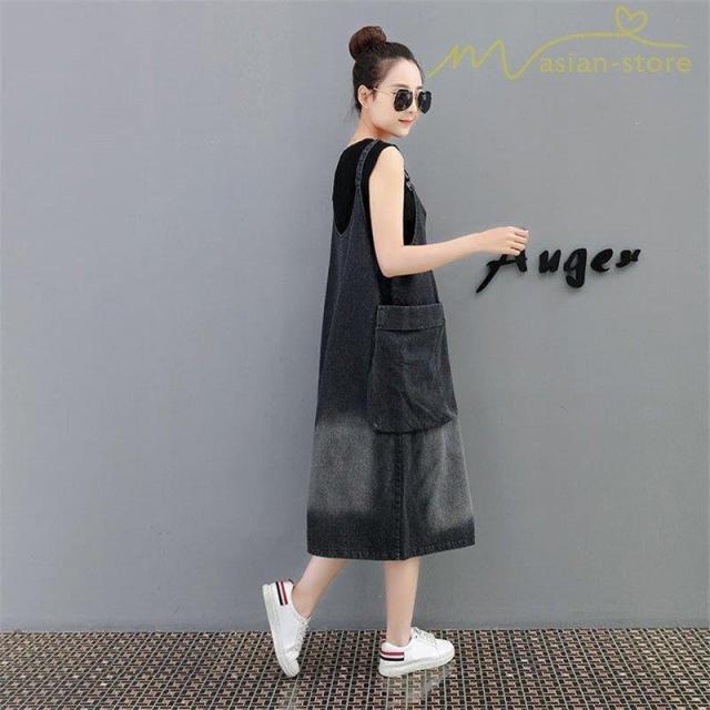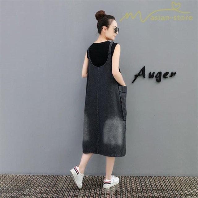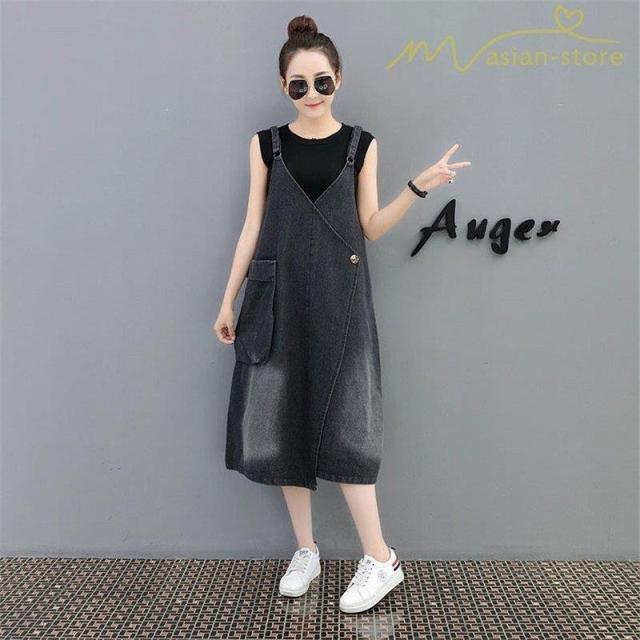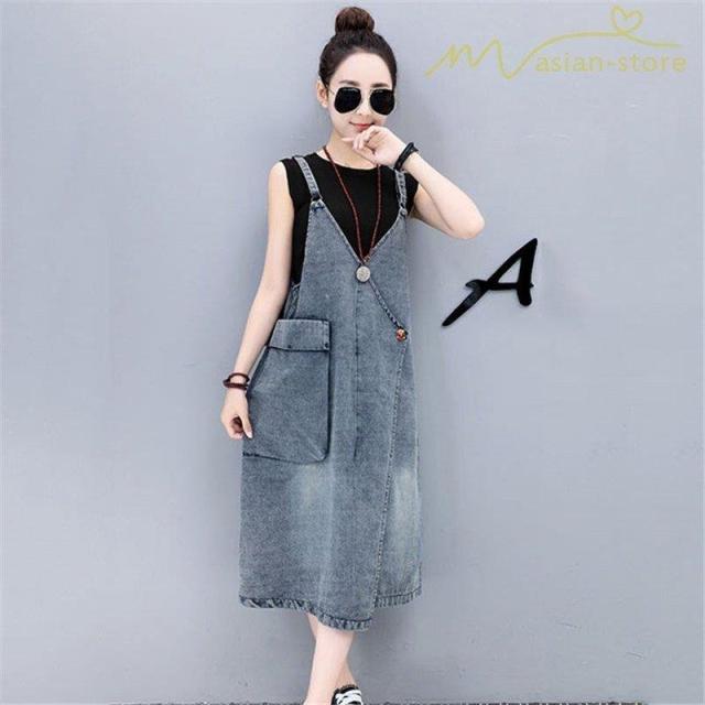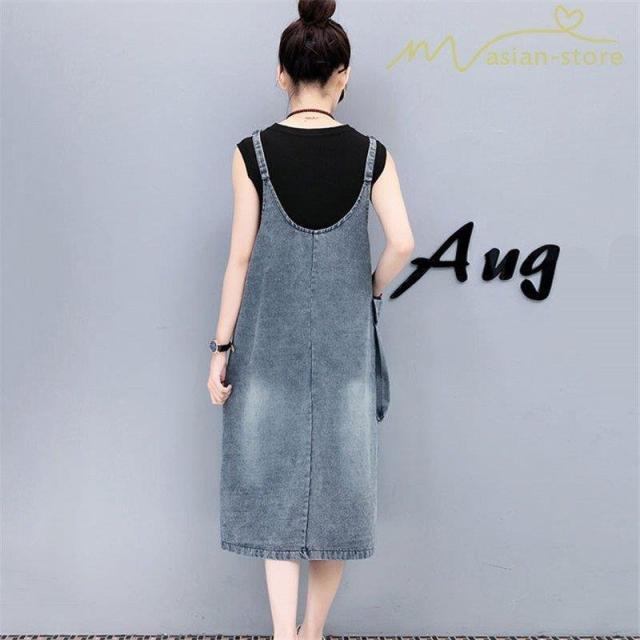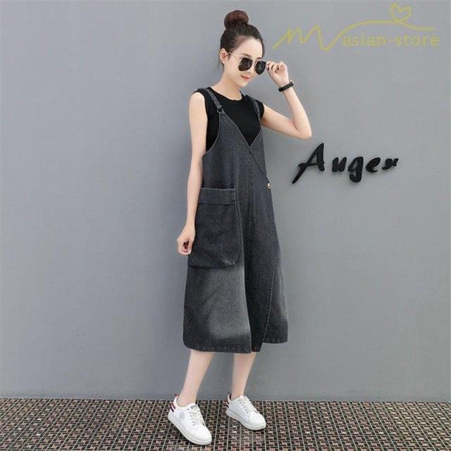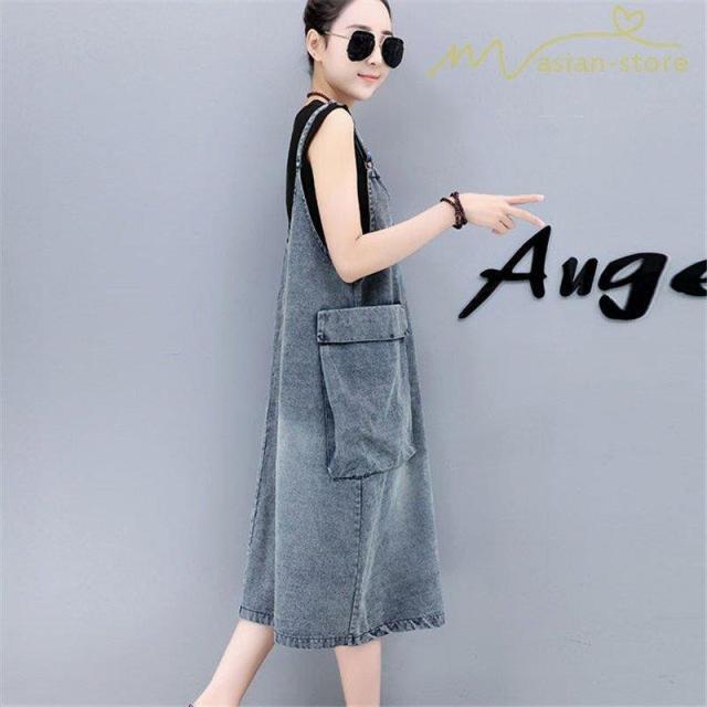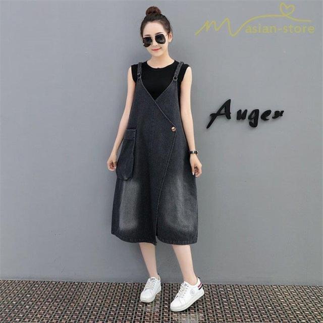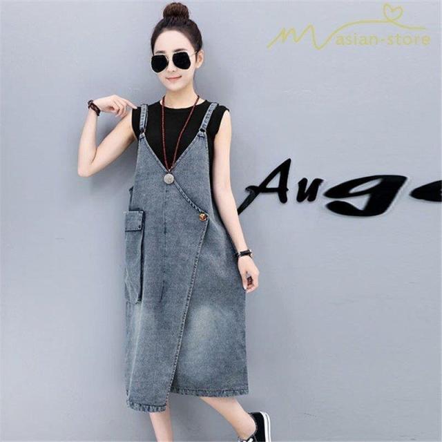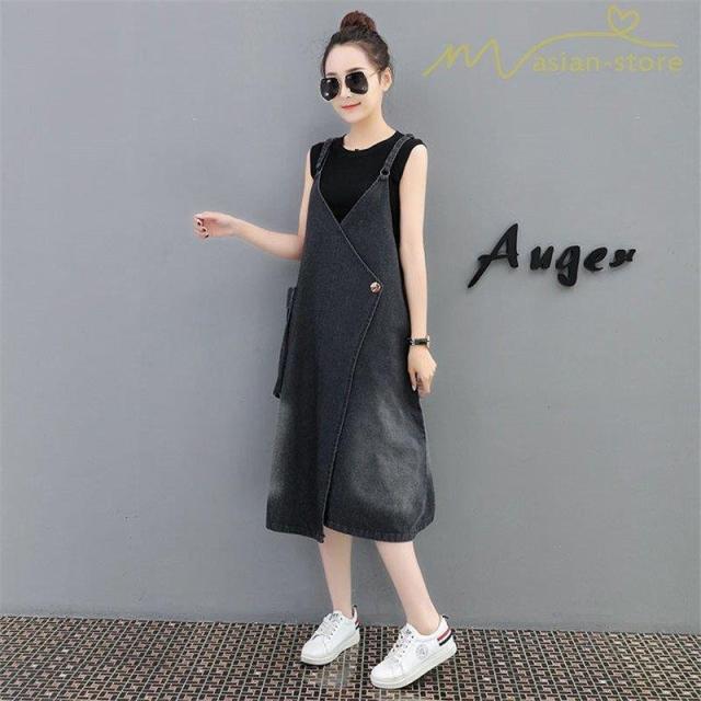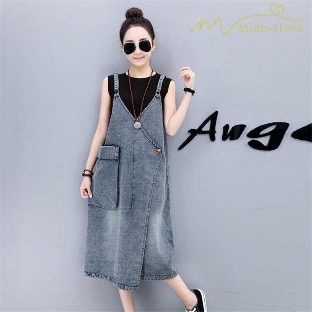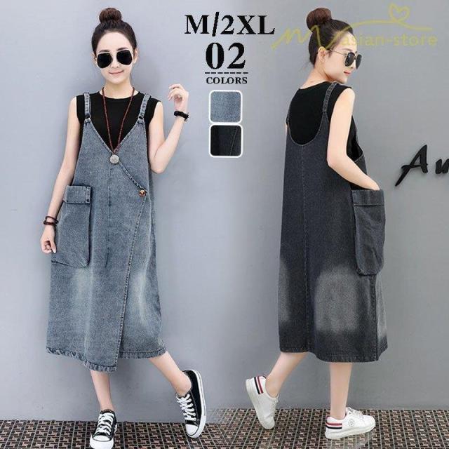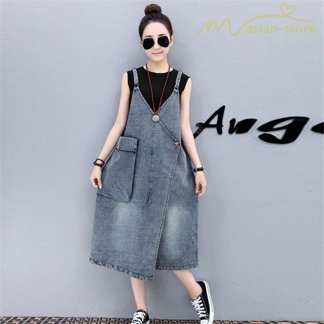 デニムワンピース サロペット Vネック 大きいサイズ レディース カジュアル サイドポケット 大きいポケット スタイリッシュ 2021夏コーデ スリット ハイウエスト