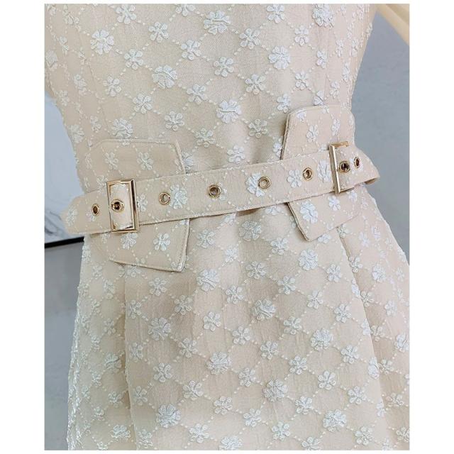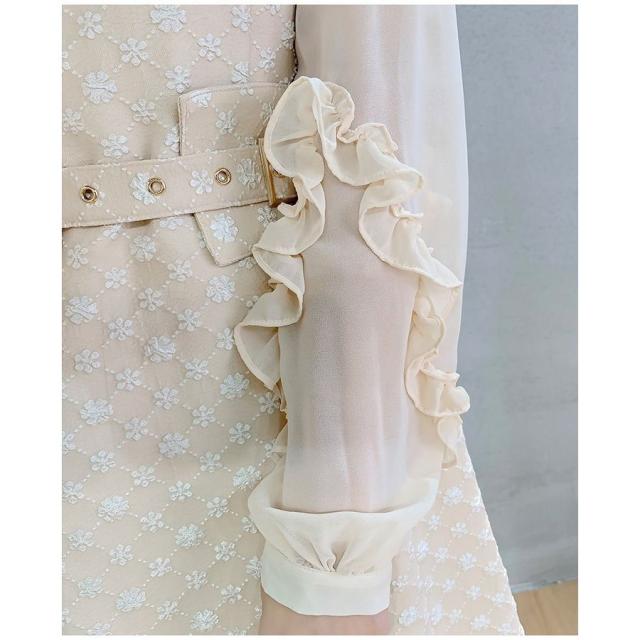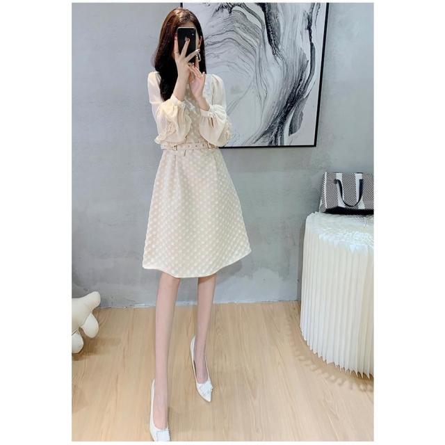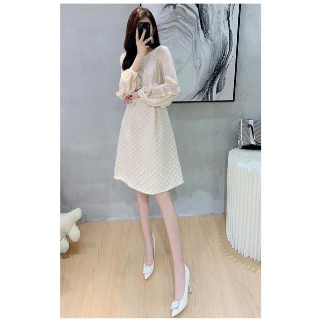 ワンピース ラウンドネック パフスリーブ 長袖 ウエストマーク 膝丈ワンピ キュート 甘め ガーリー 食事会 清楚 定番 キレイ目 休日スタイル 女子旅