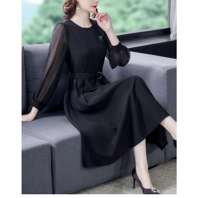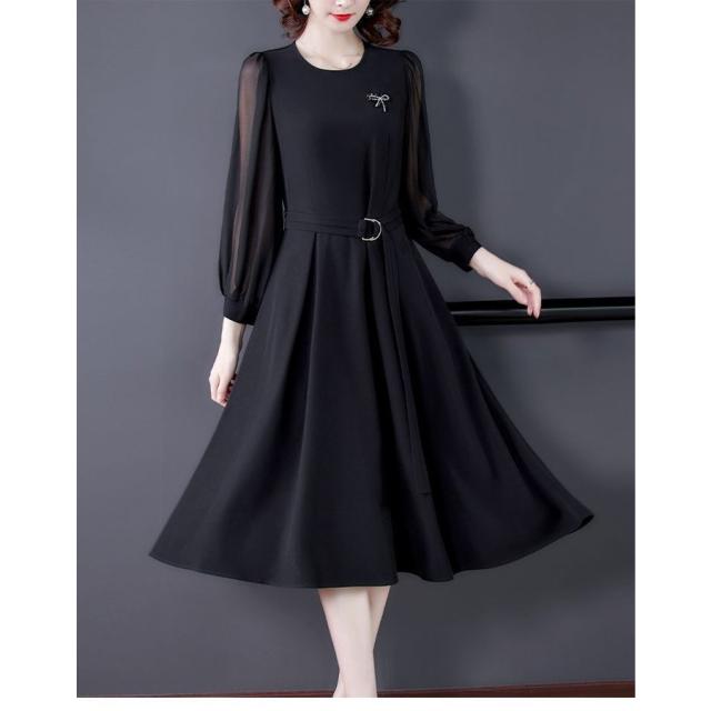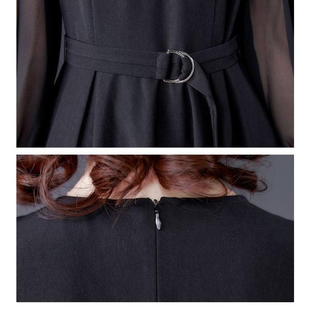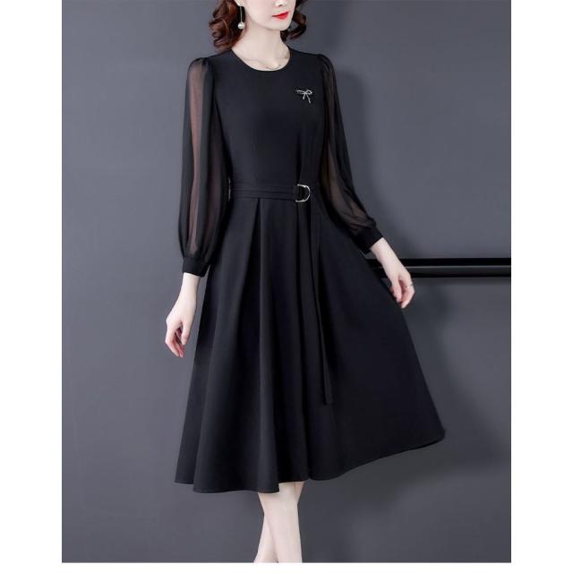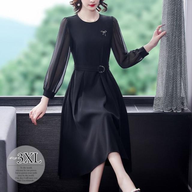 ワンピース ラウンドネック シースルー 透け感 ウエストマーク 膝下丈 ビジュー クラシカル 学校行事 食事会 ピアノ スタイリッシュ フェミニン 卒園式
