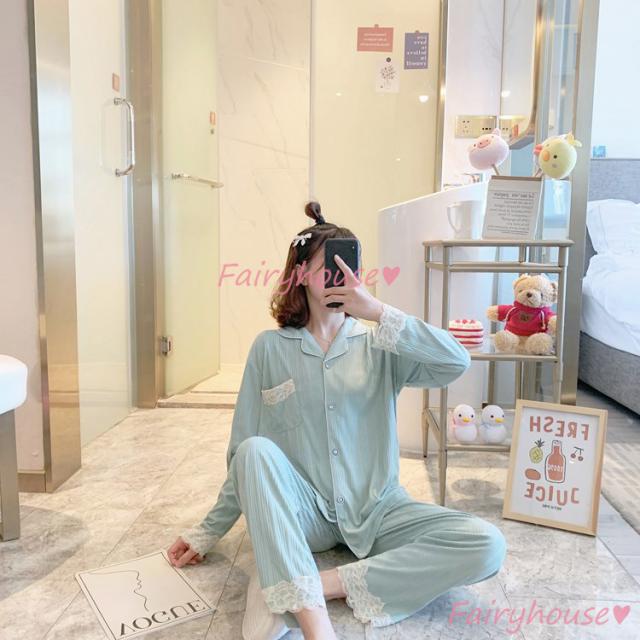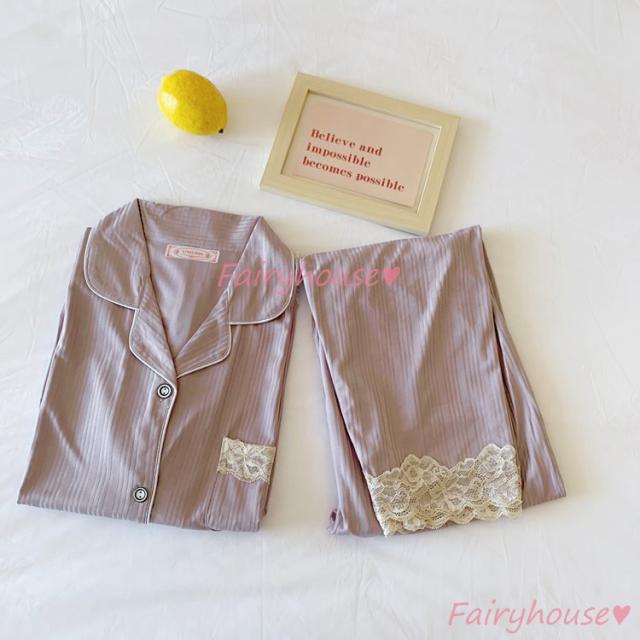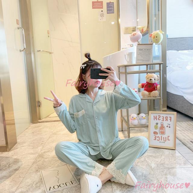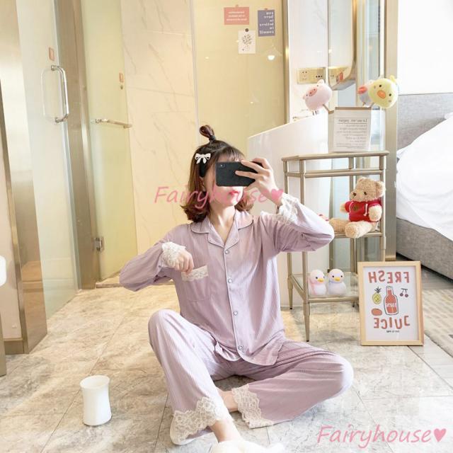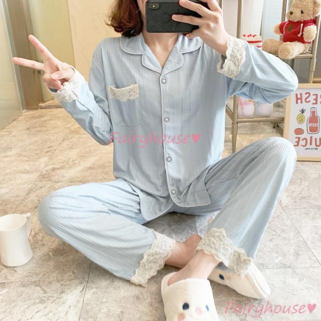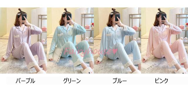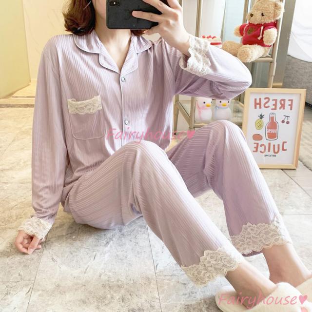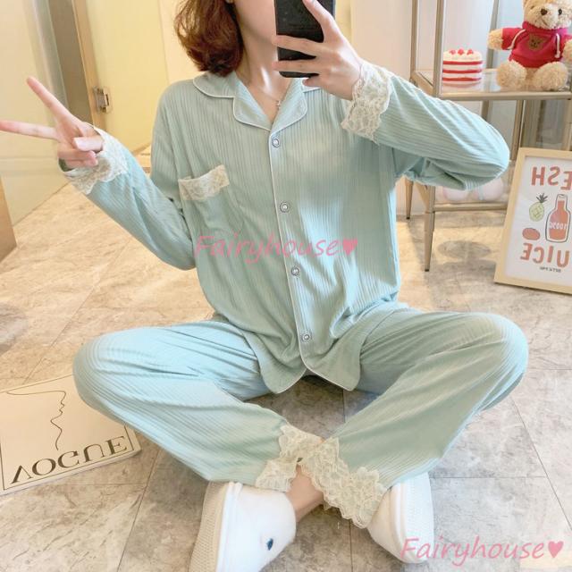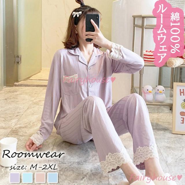 パジャマ ルームウェア レディース 秋冬 長袖パジャマ 可愛いルームウェア 前開き レース ロングパンツ上下セット パジャマ 女性 部屋着 大きいサイズ 快適