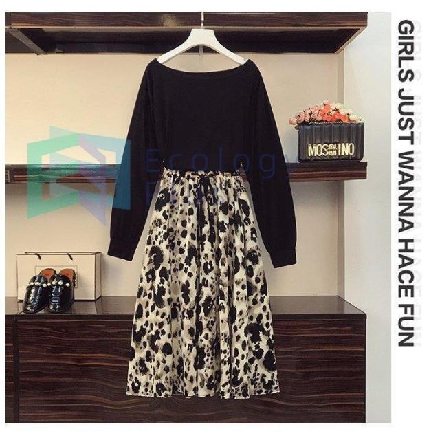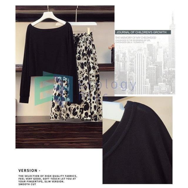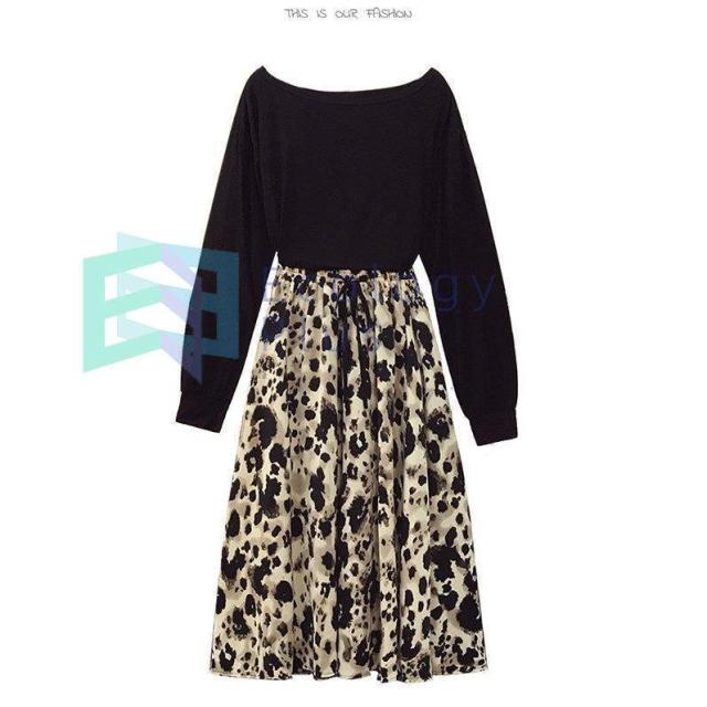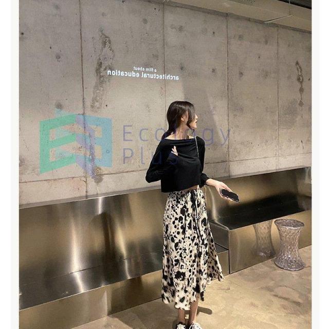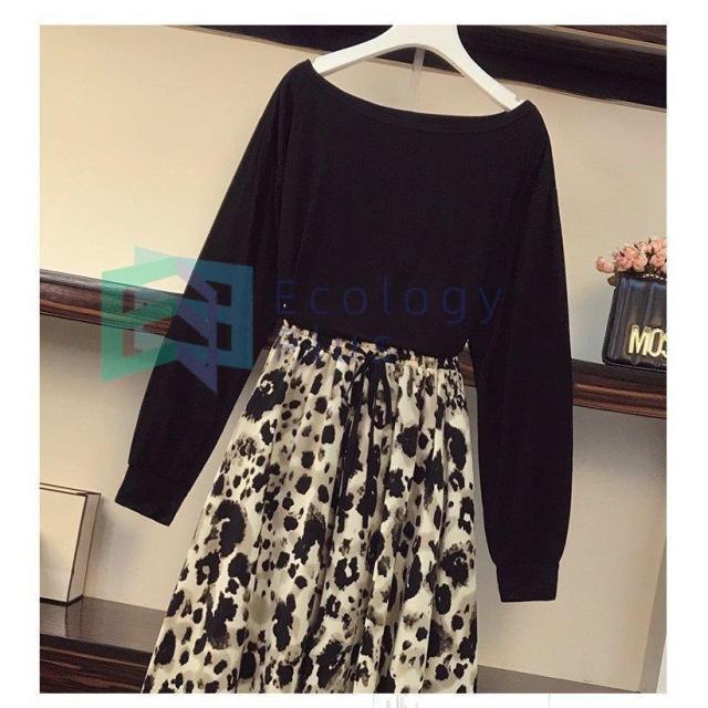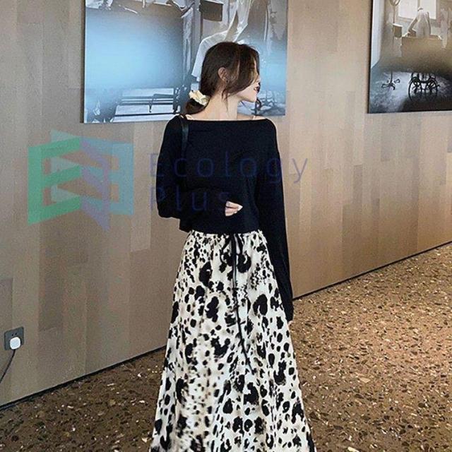 セットアップ レディース 40代 秋新作 長袖Tシャツ ボートネック ヒョウ柄フレアスカート黒白 上下セット オシャレワンピース 大人 セクシー 韓国風 40代