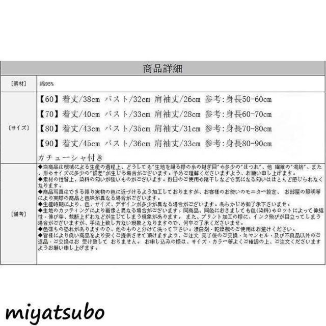 | サイズについての説明 | サイズ: 【60】着丈/38cm バスト/32cm 肩袖丈/26cm 参考:身長50-60cm 【70】着丈/40cm バスト/33cm 肩袖丈/28cm 参考:身長60-70cm 【80】着丈/43cm バスト/35cm 肩袖丈/31cm 参考:身長70-80cm 【90】着丈/45cm バスト/36cm 肩袖丈/33cm 参考:身長80-90cm |
