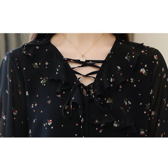 ブラウス レディース 40代 春夏秋新作 オシャレブラウス シフォンブラウスリボンネック 花柄 パフスリーブ 長袖トップス 韓国風 大人通勤 ゆったりシャツ30代‘